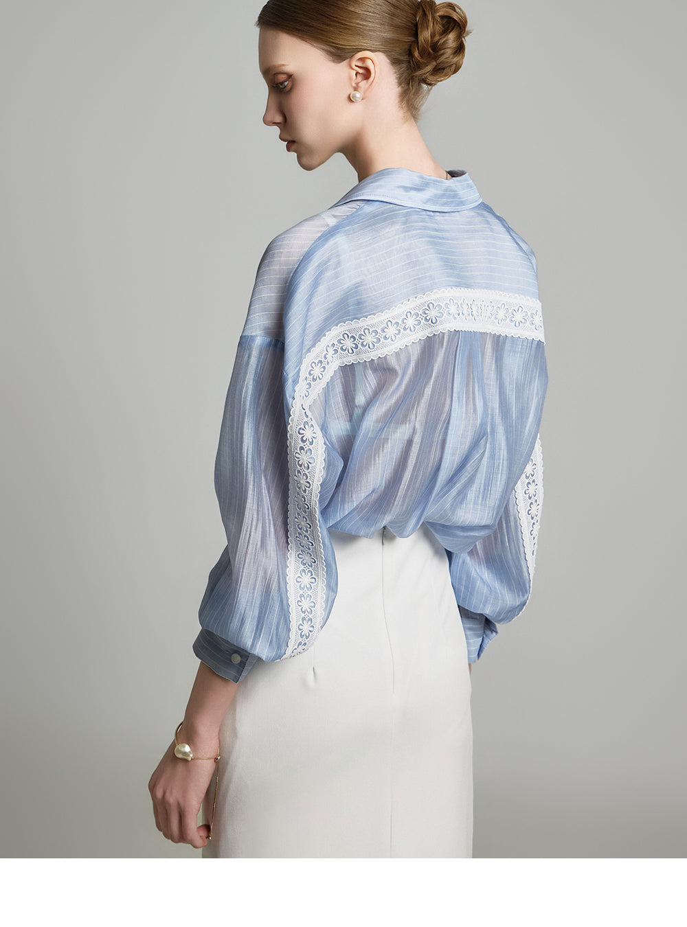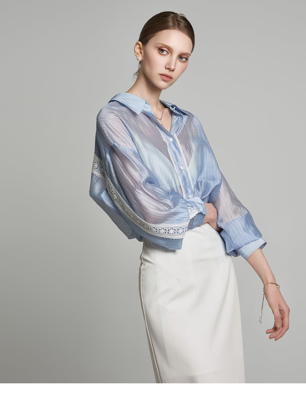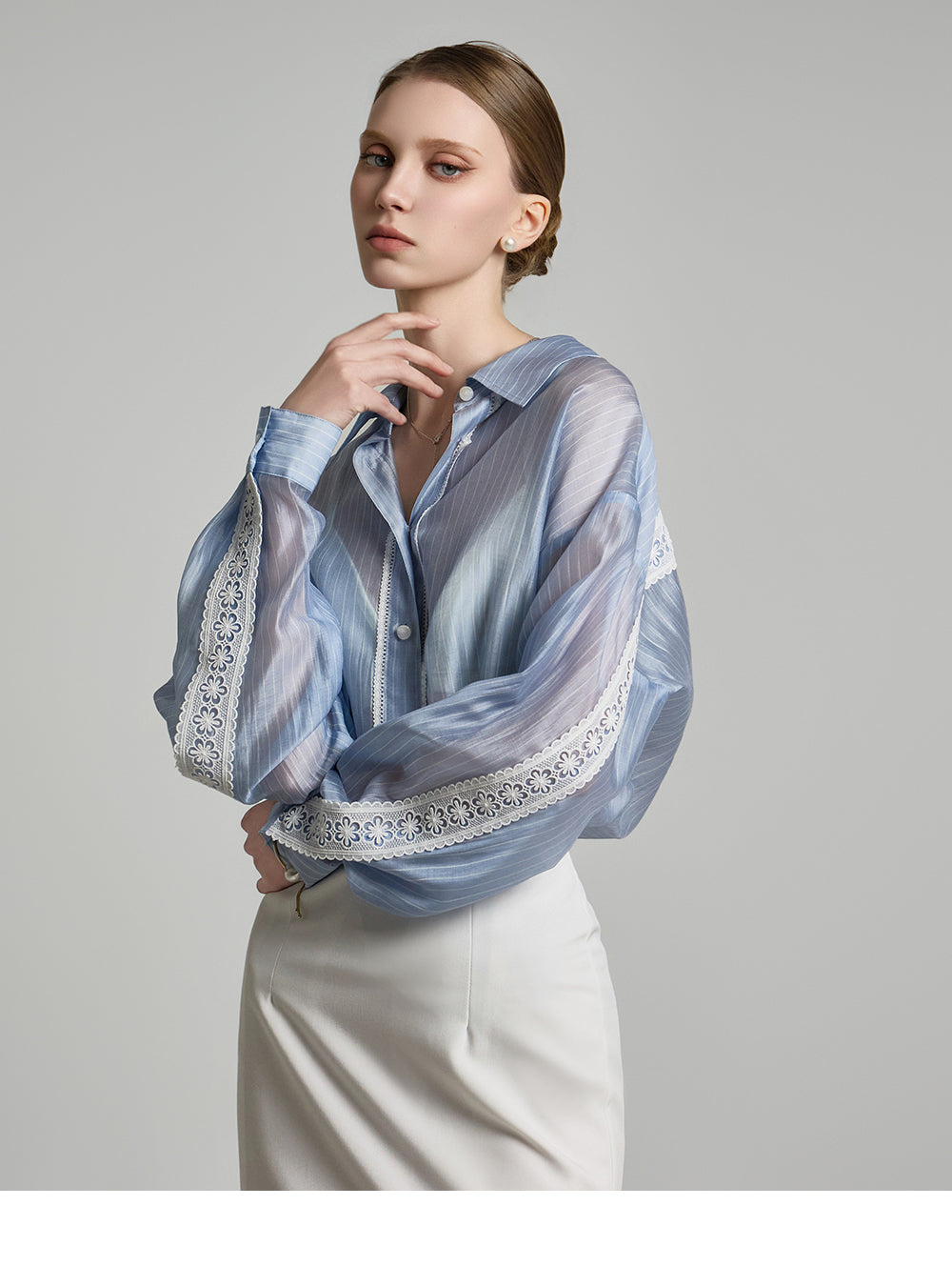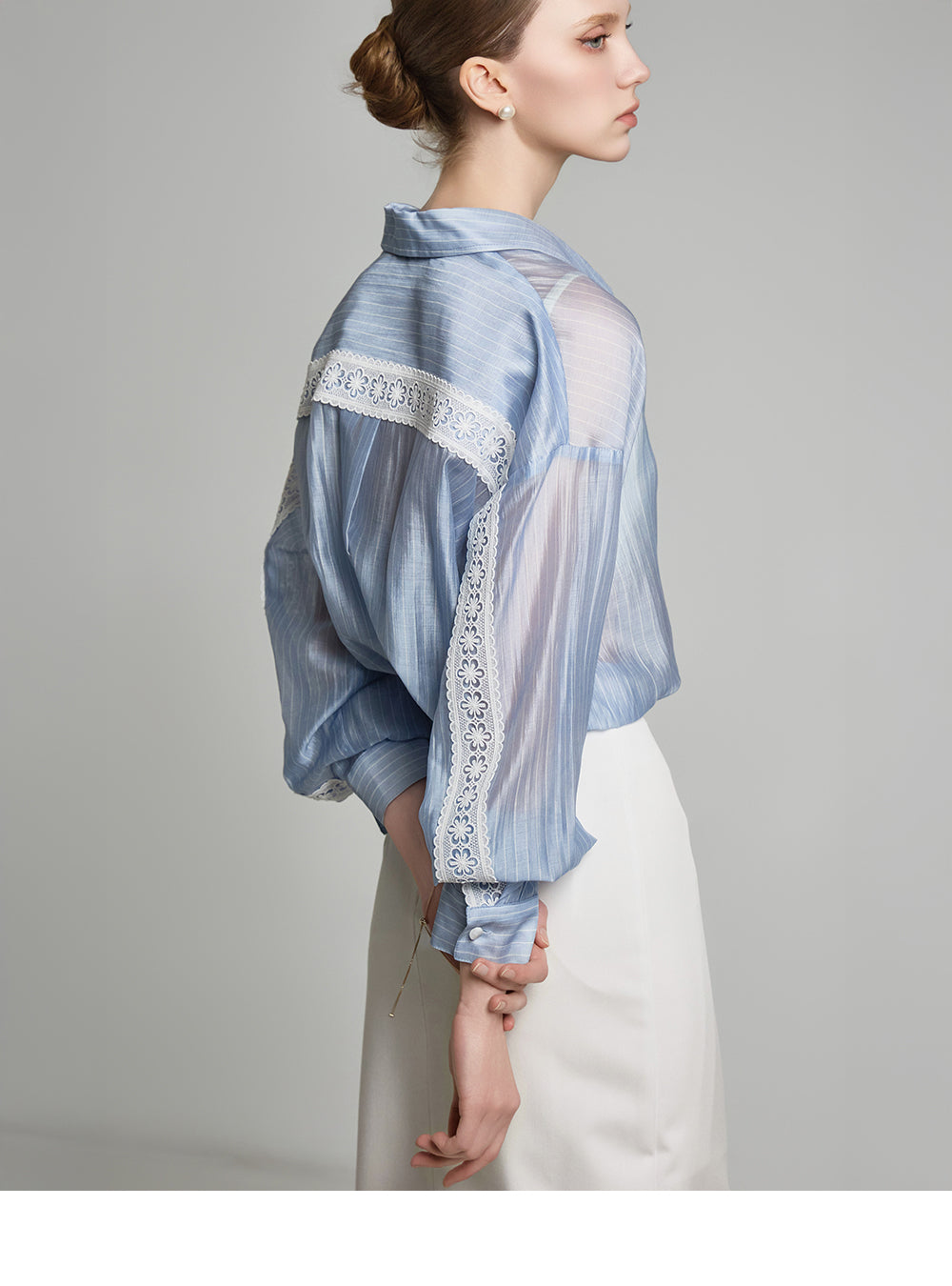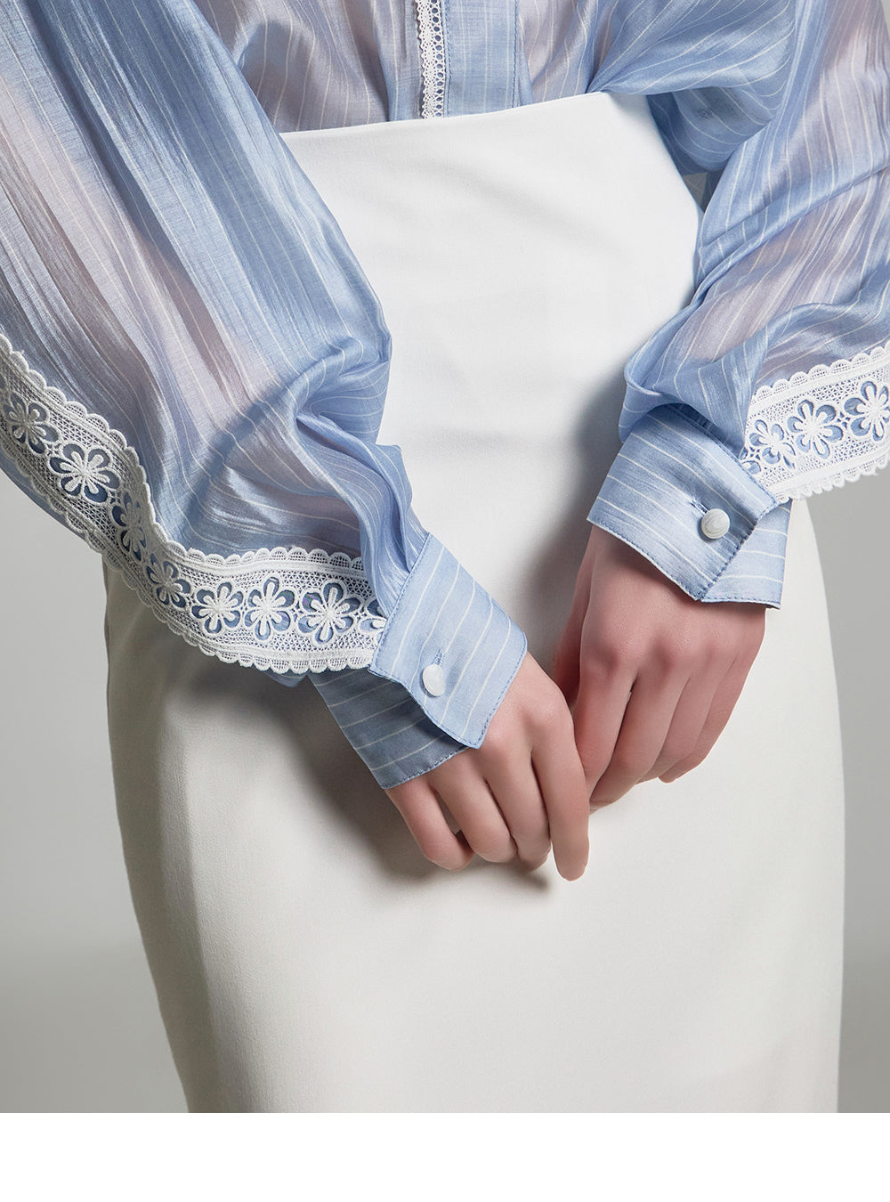 the blouse features lace detailing along the cuffs and button placket,