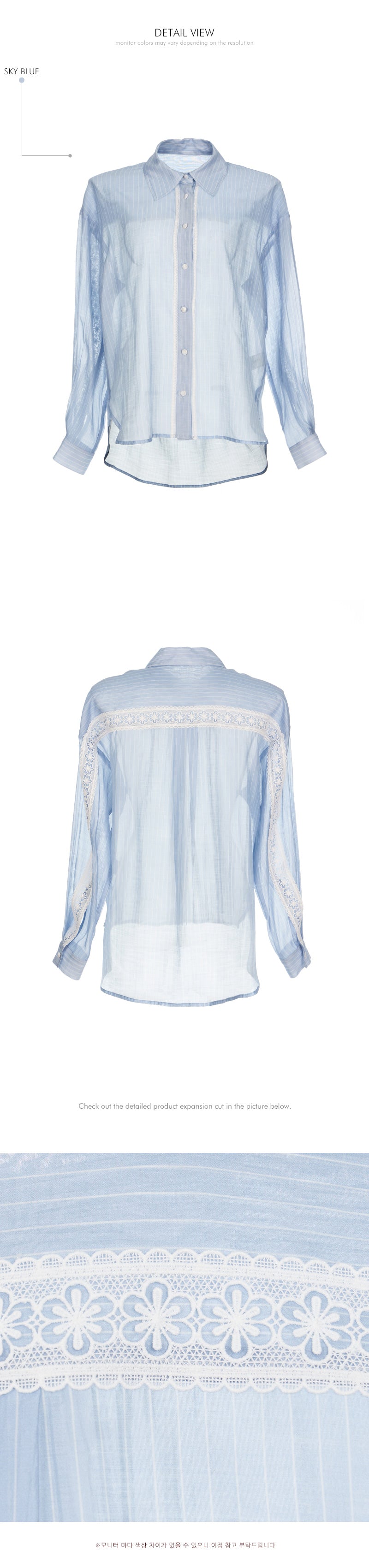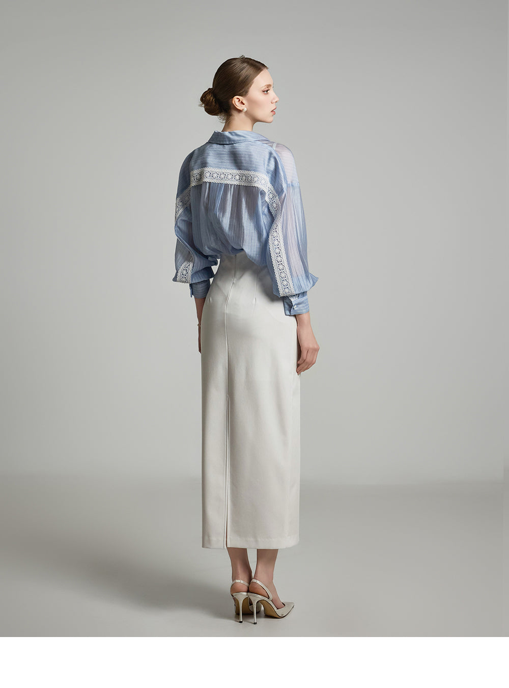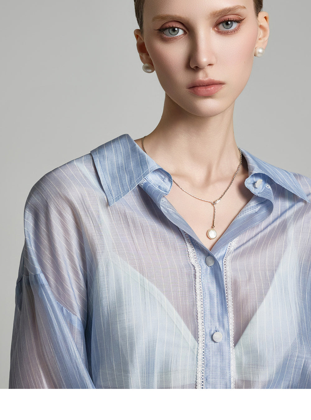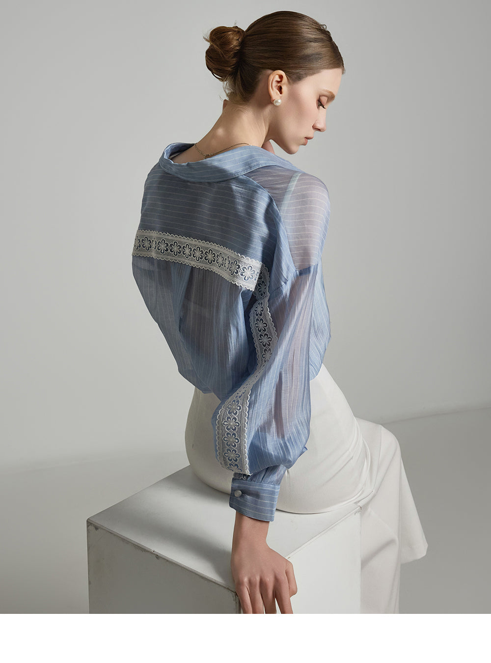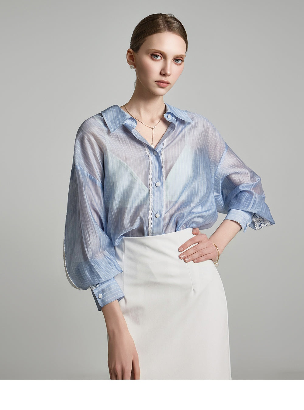 the blouse features lace detailing along the cuffs and button placket,