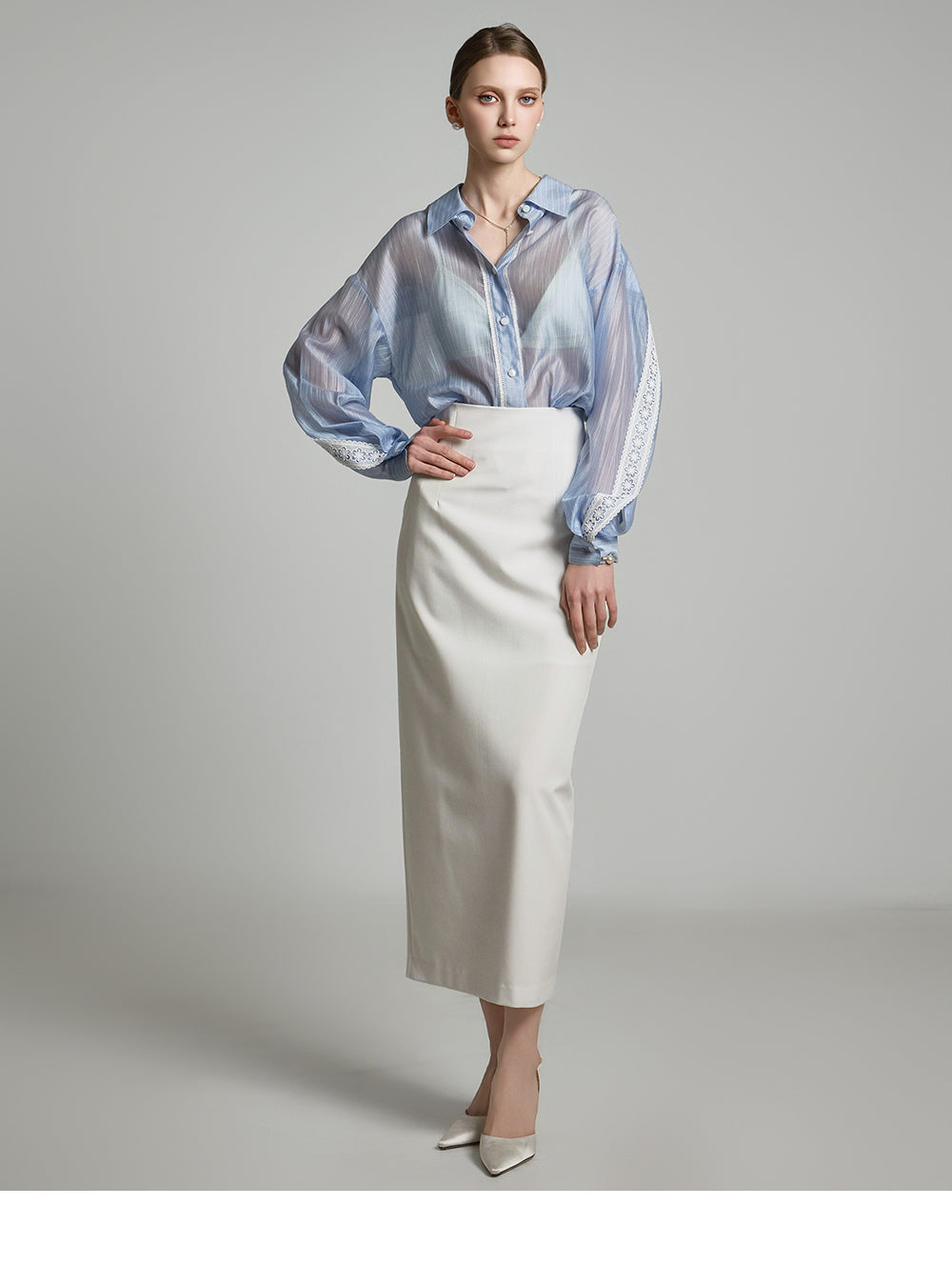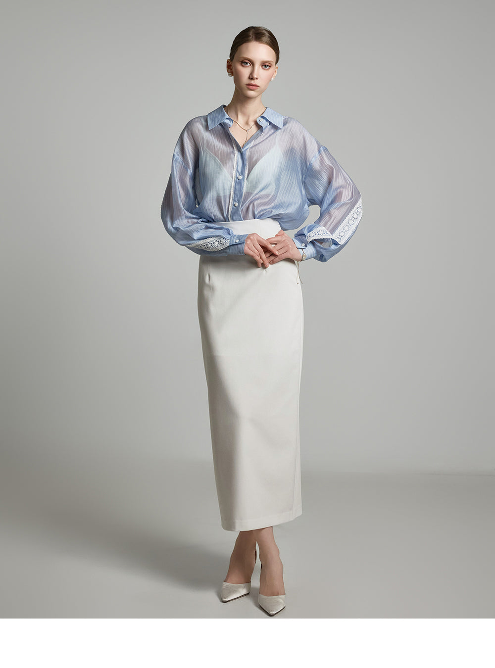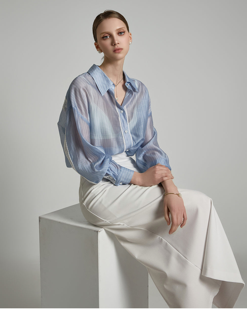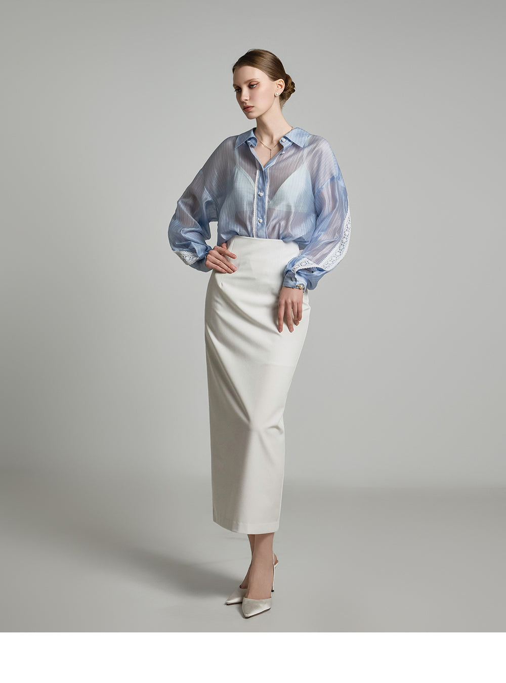 This sheer lace blouse exudes an elegant mood.