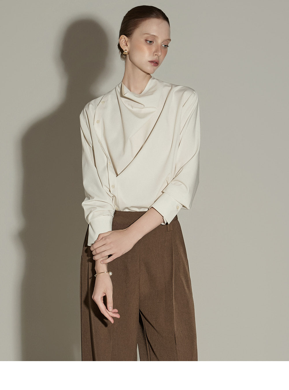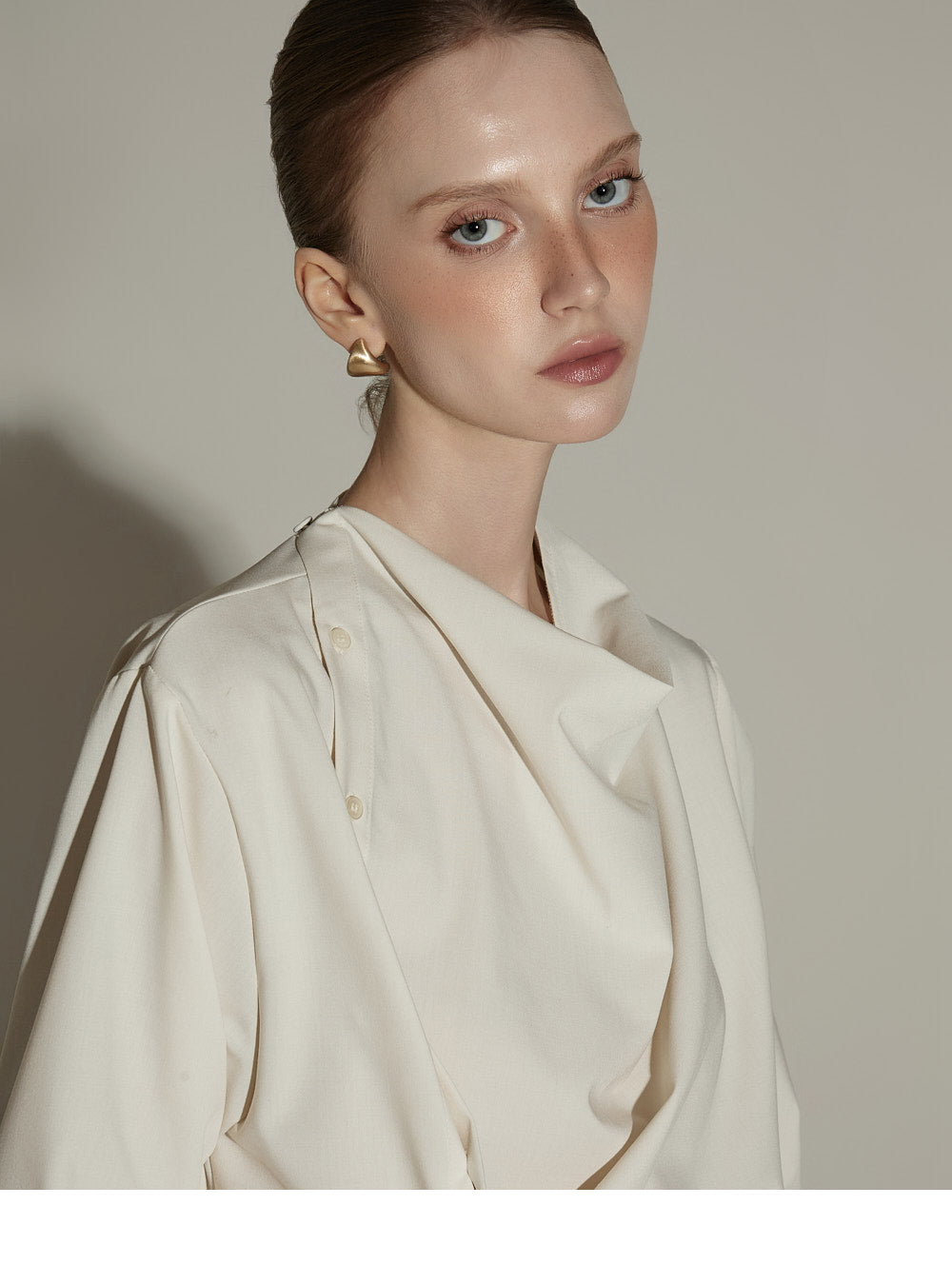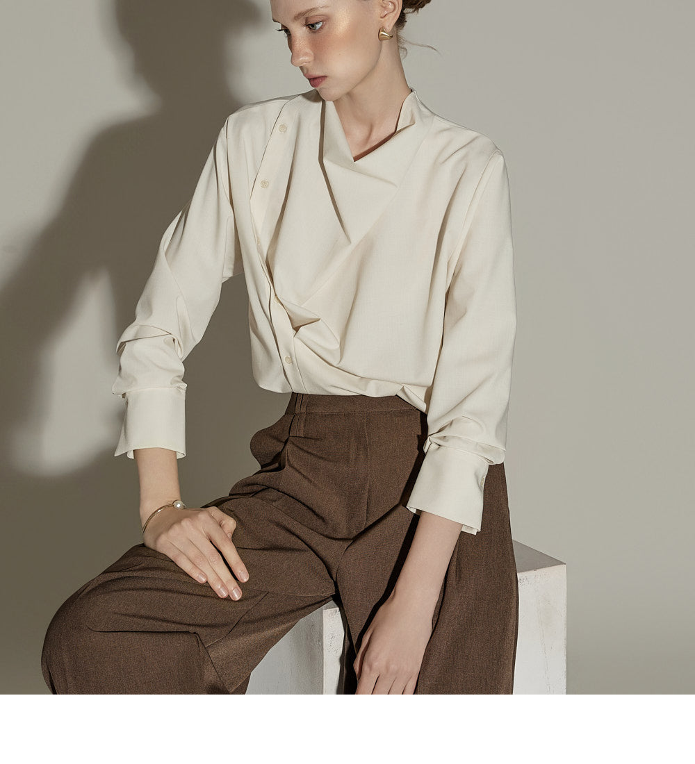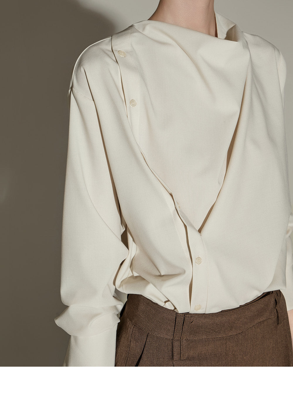 This casual side button draping shirt is crafted from a polyester, rayon, and spandex blend,