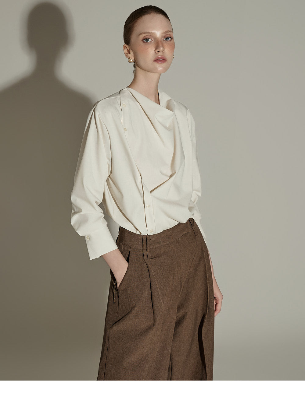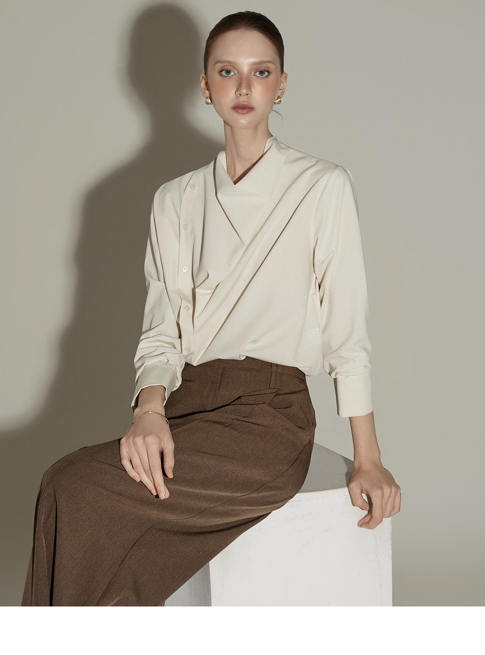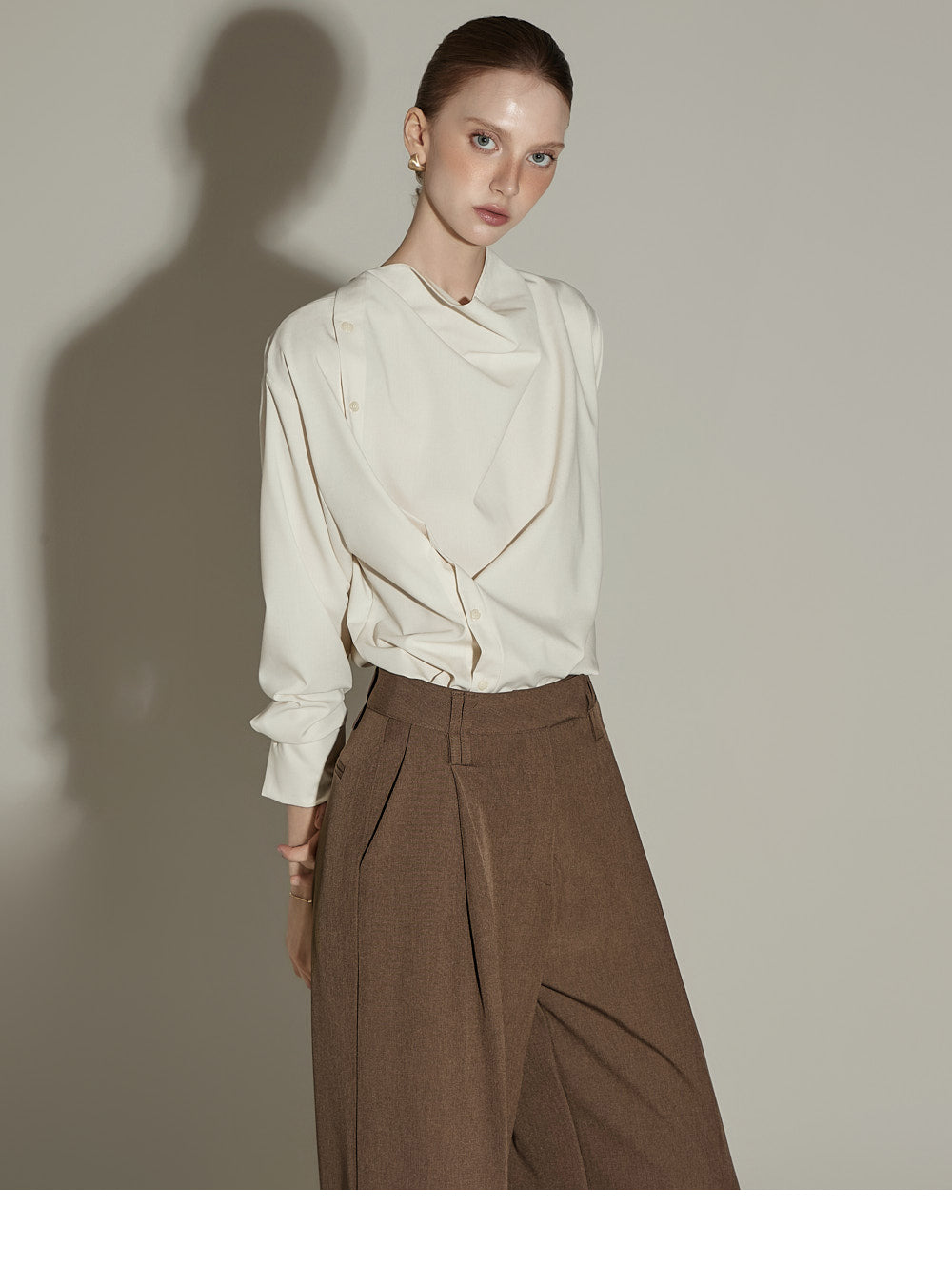 This casual side button draping shirt is crafted from a polyester, rayon, and spandex blend,