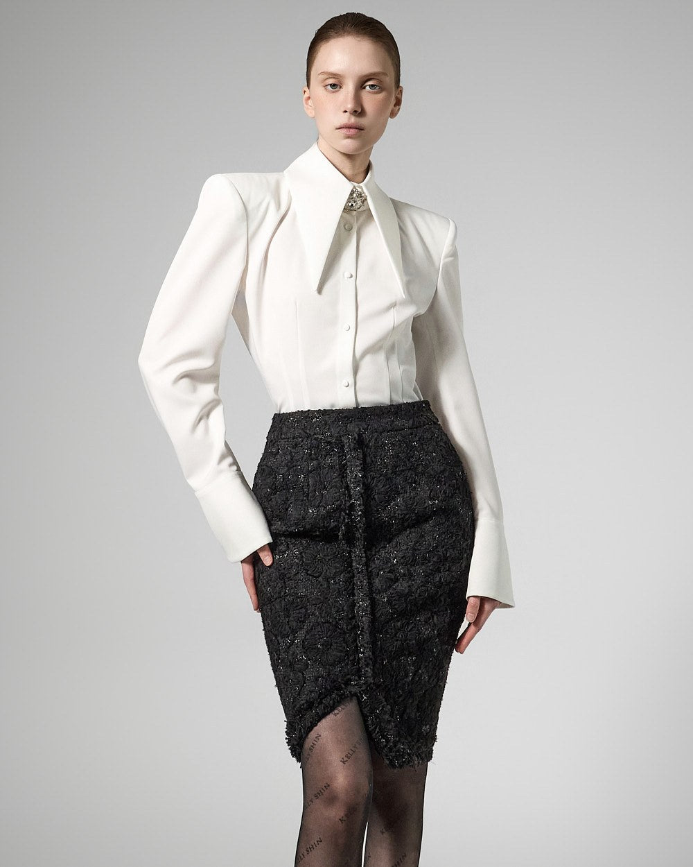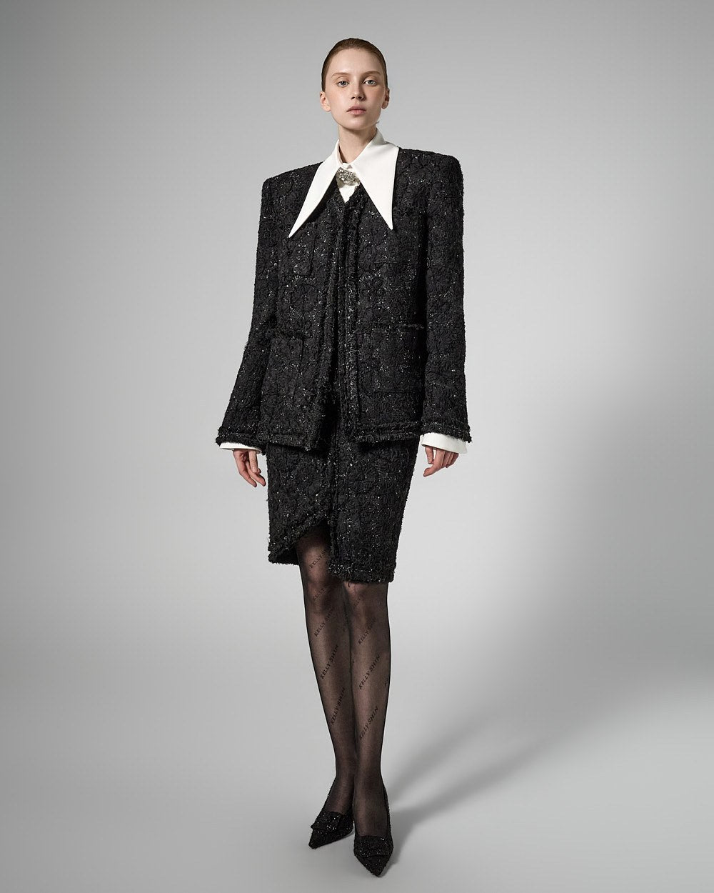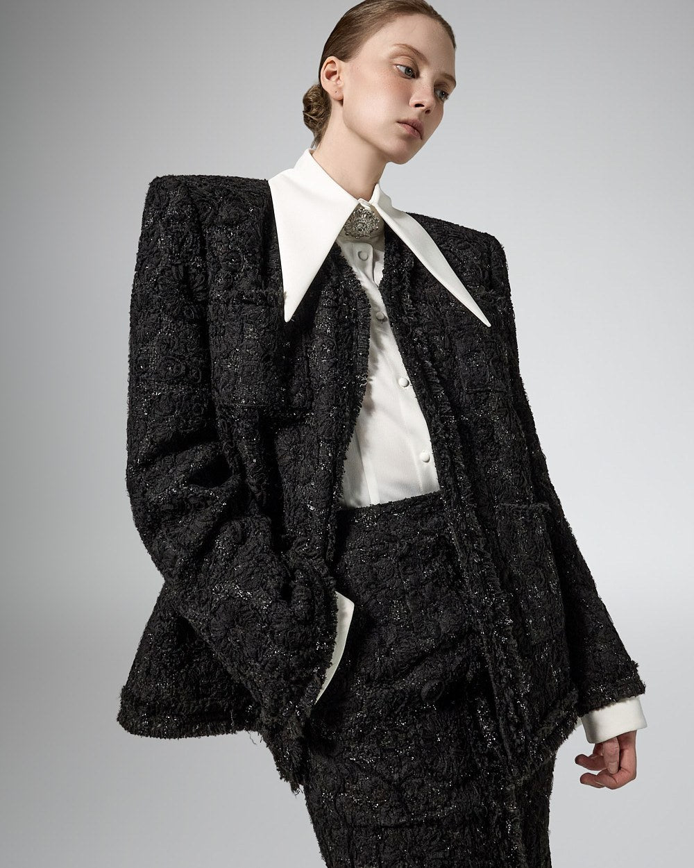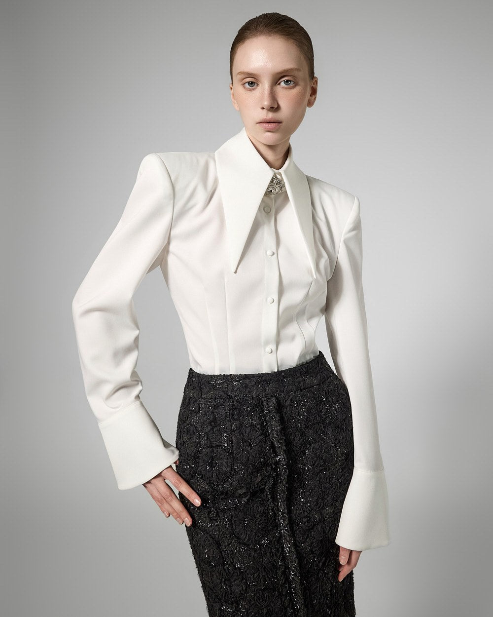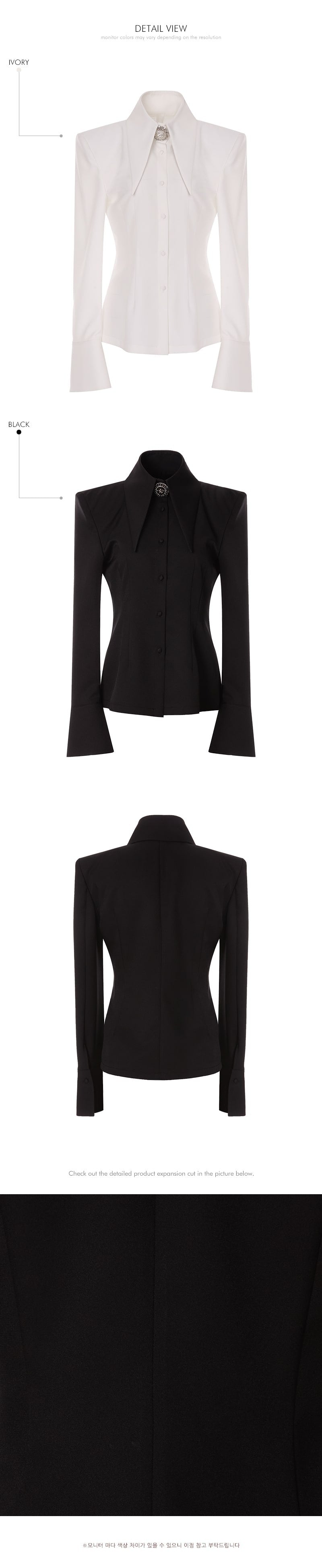 while the large collar detailing creates a sophisticated face line,