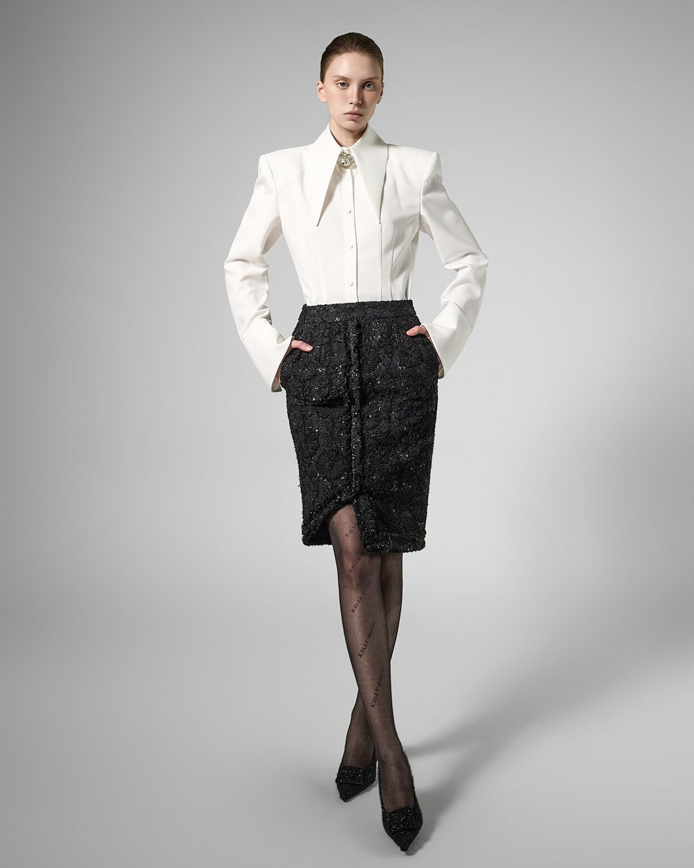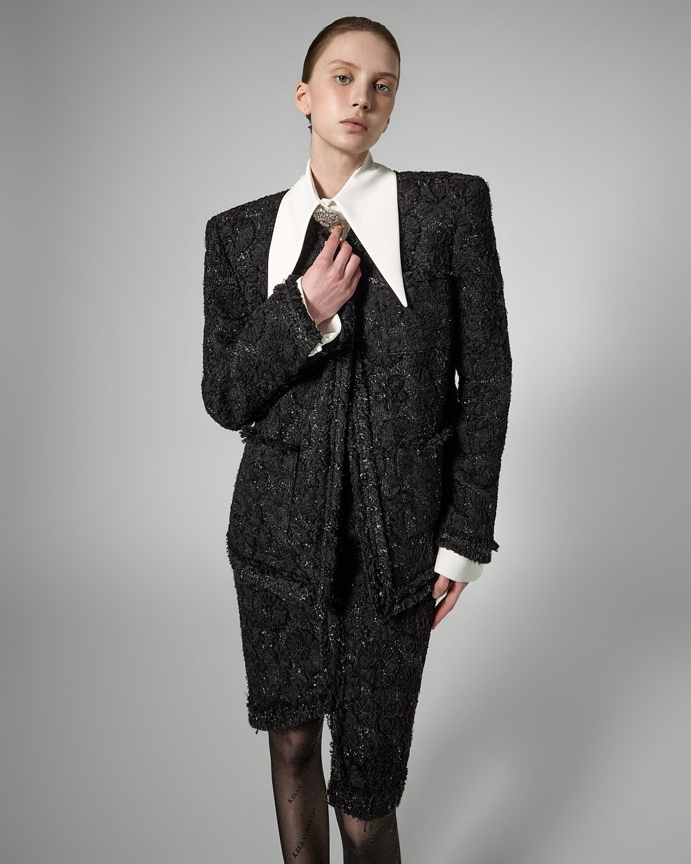 and the neckline brooch accentuates