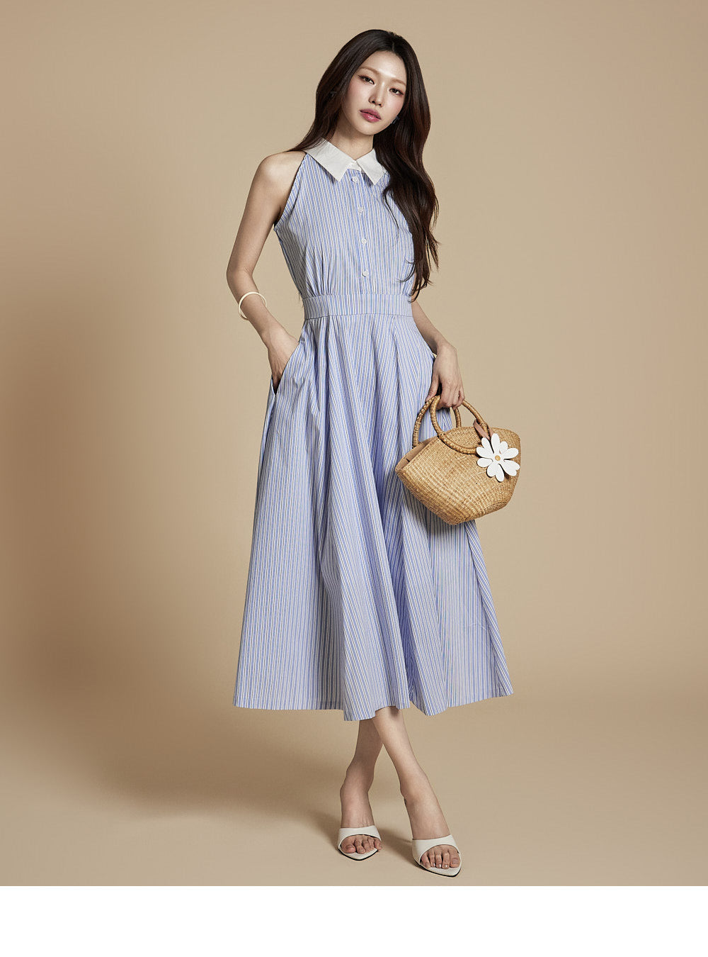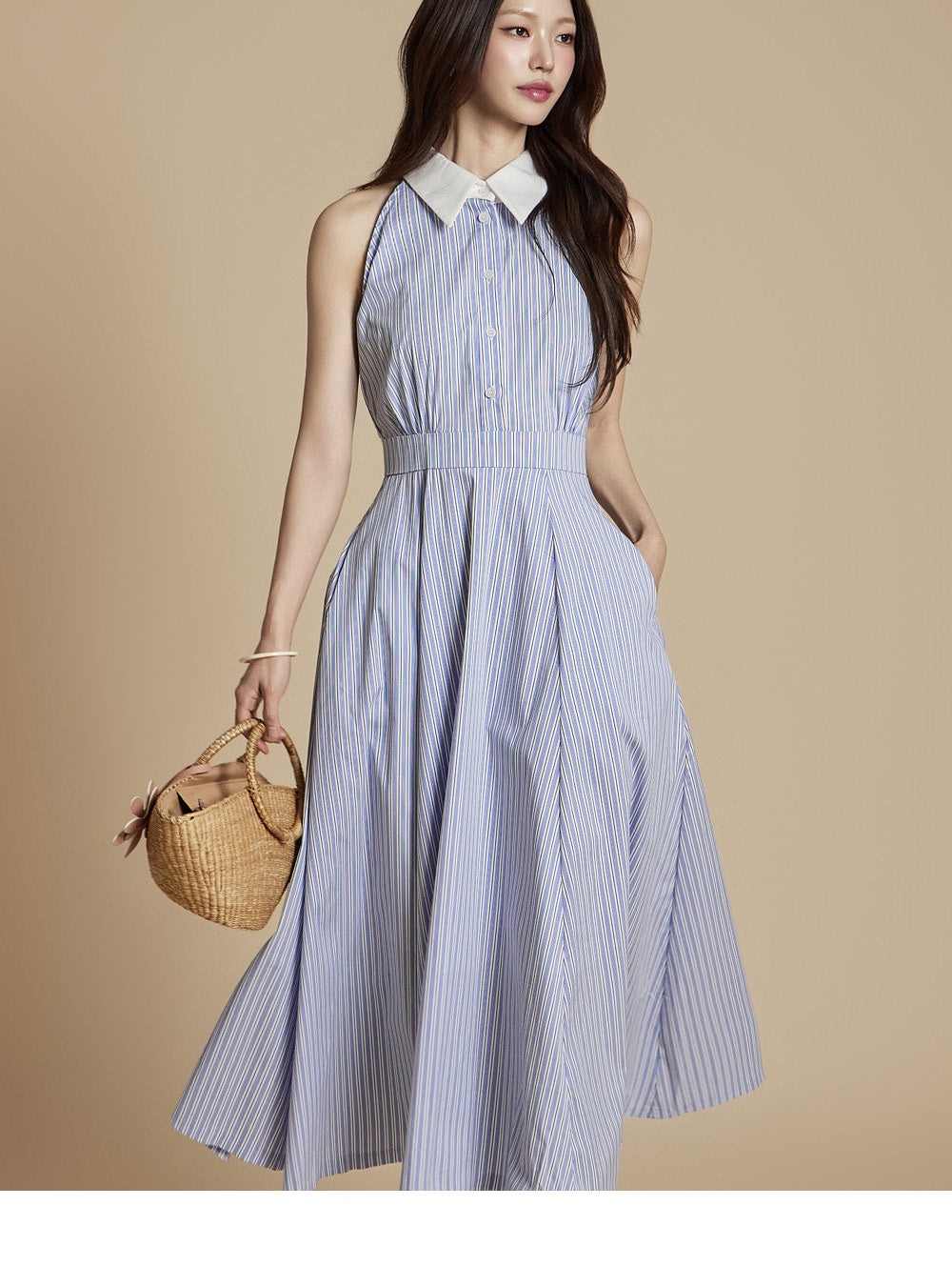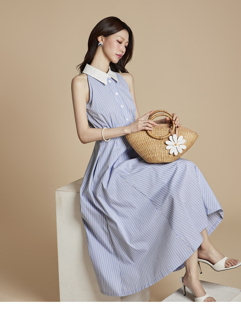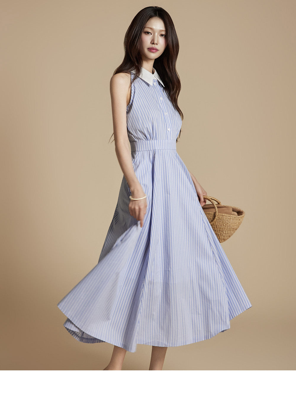 The sleeveless shirt-style top and flared hem create a playful silhouette,