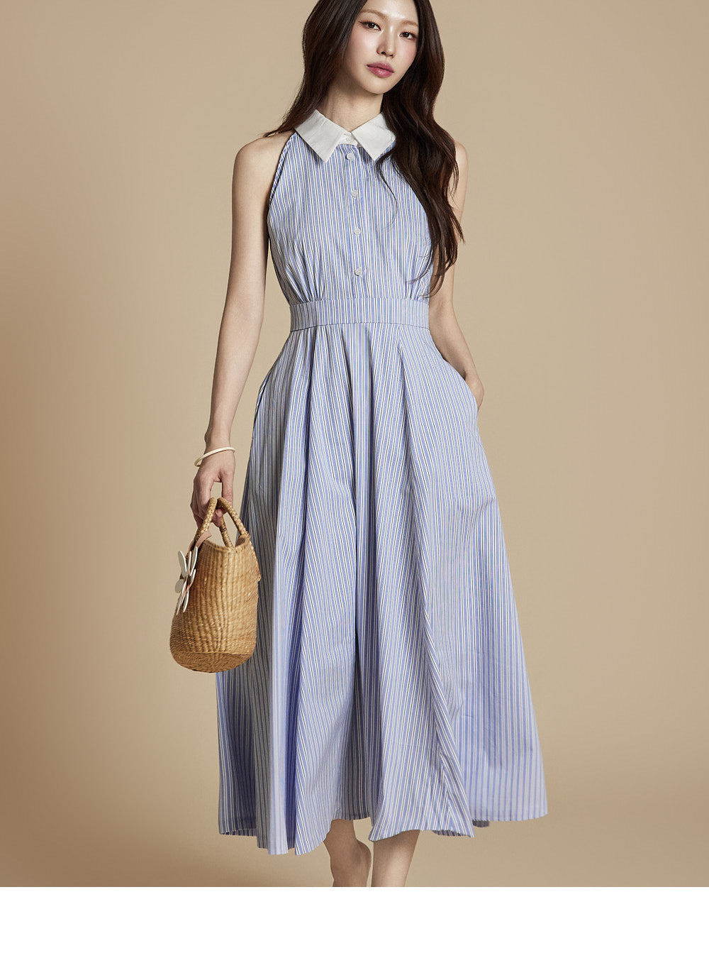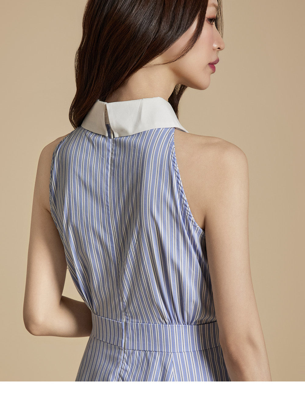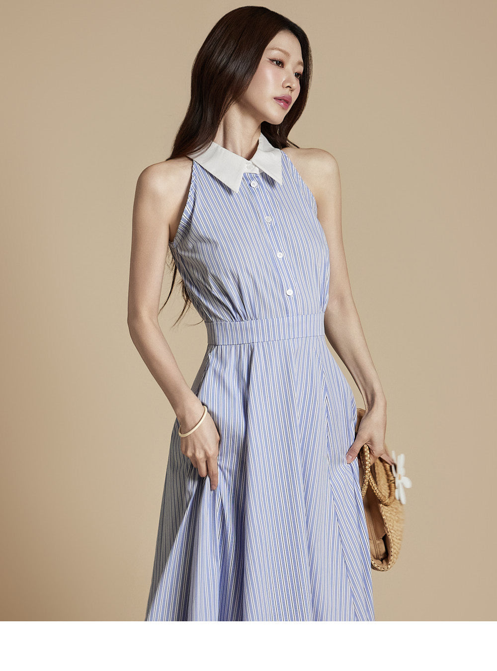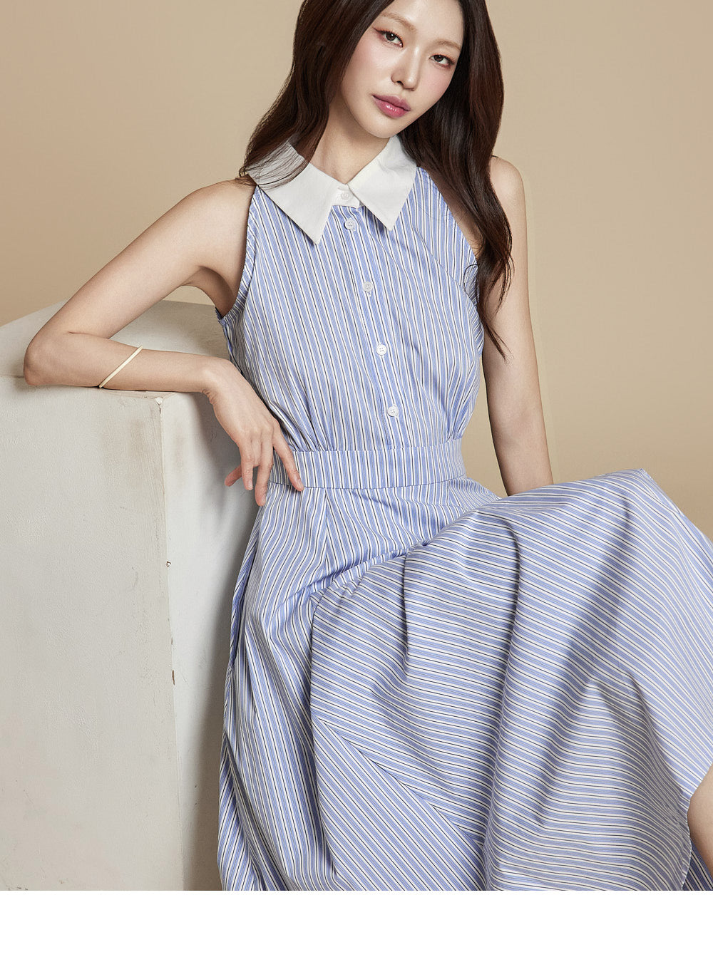 The sleeveless shirt-style top and flared hem create a playful silhouette,