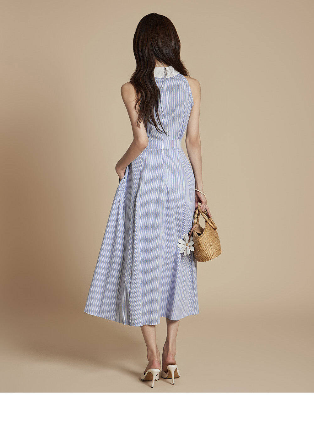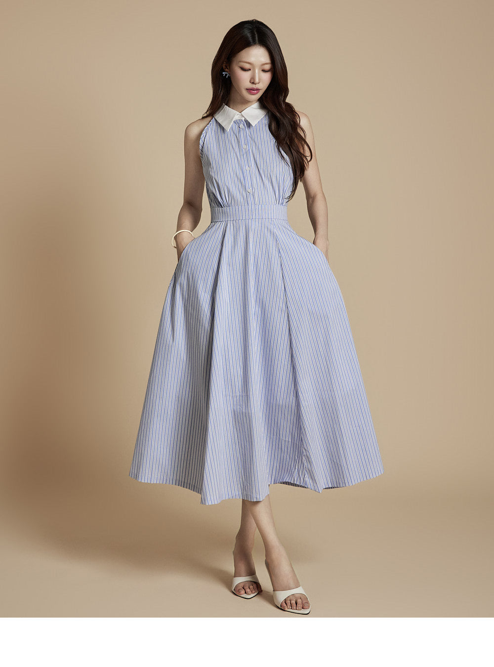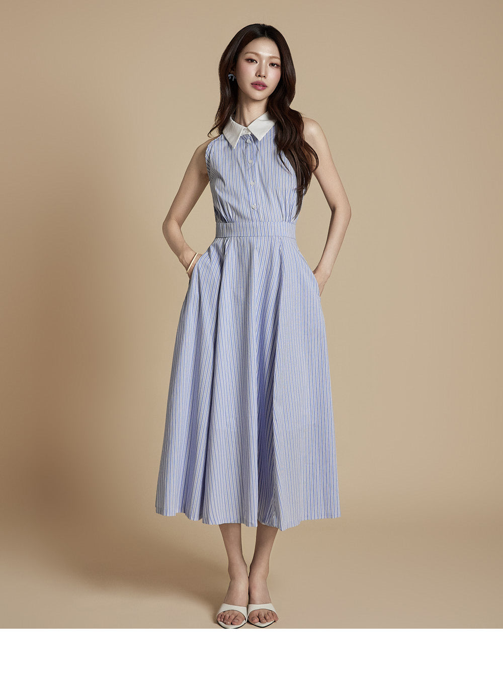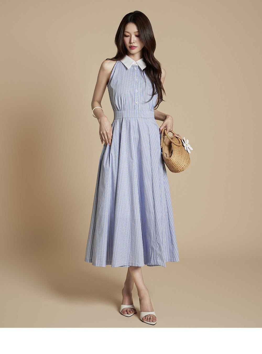 The sleeveless shirt-style top and flared hem create a playful silhouette,