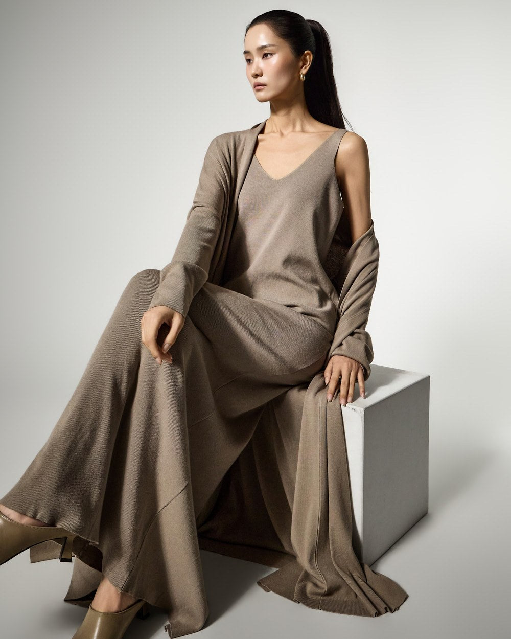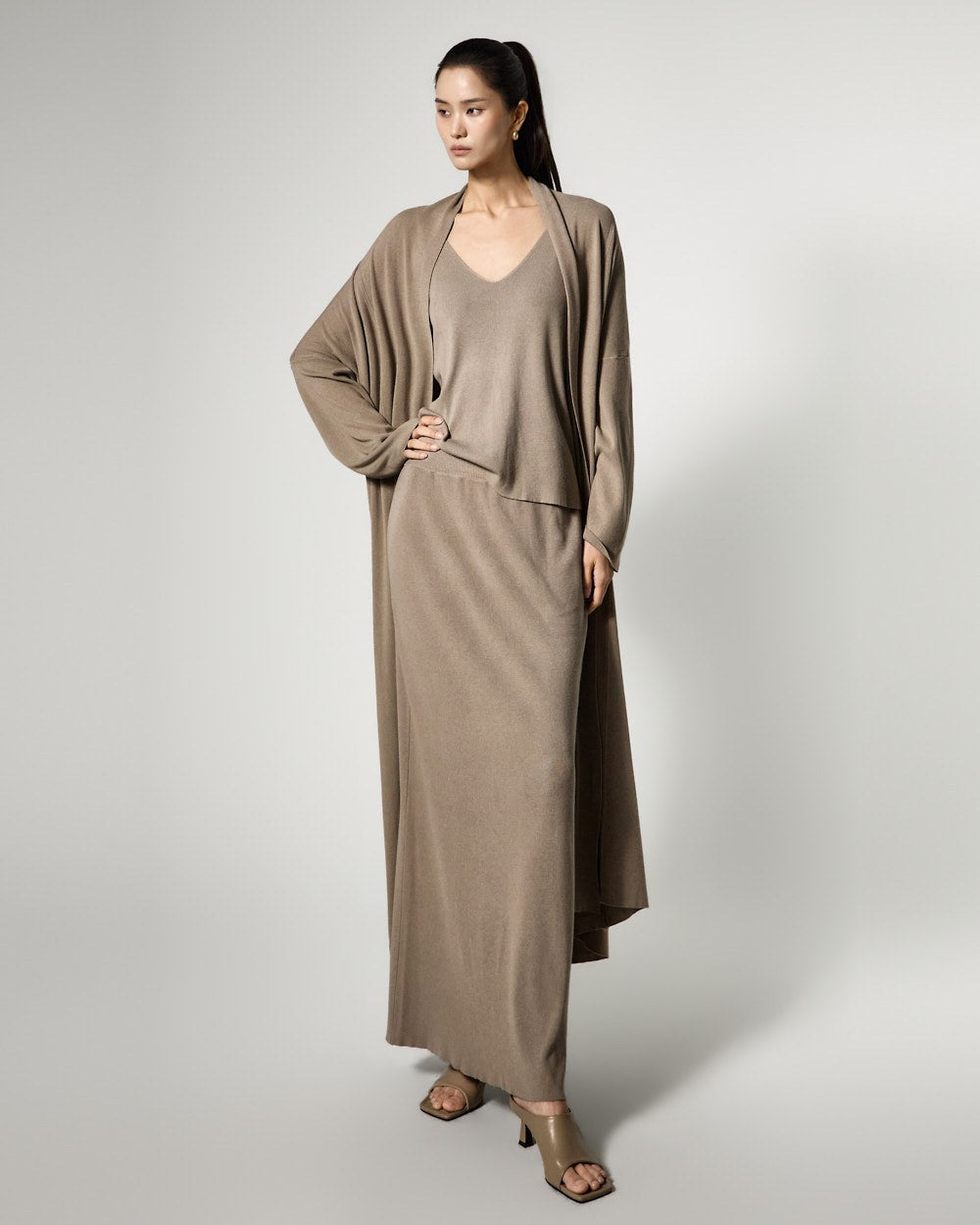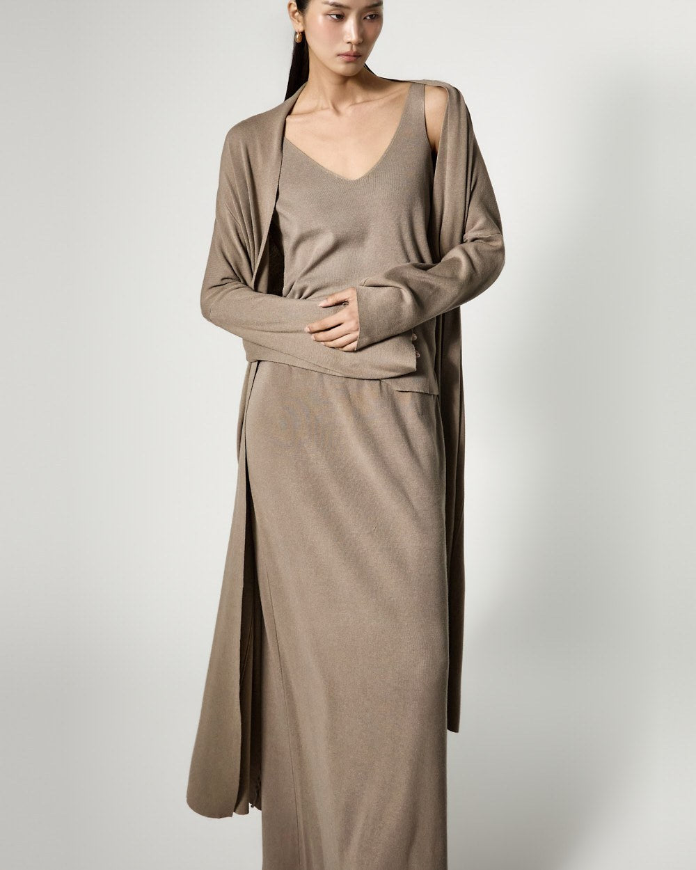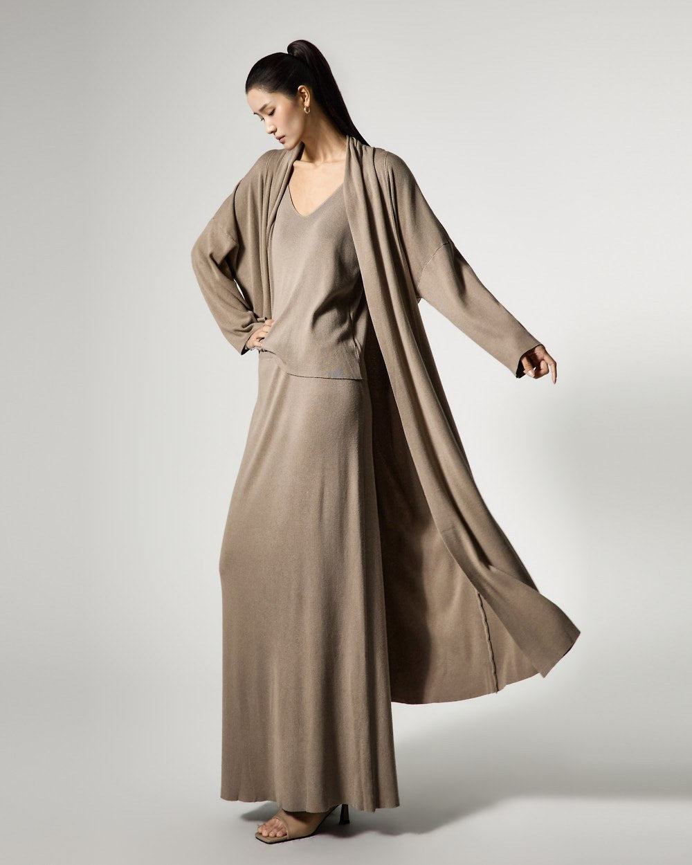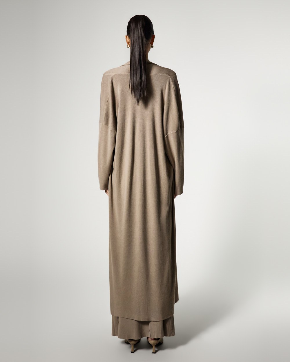 The long cardigan adds a sophisticated accent to the overall style with its naturally flowing fit.