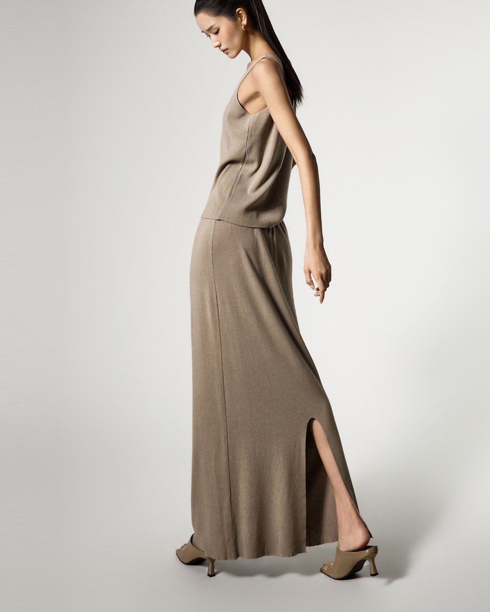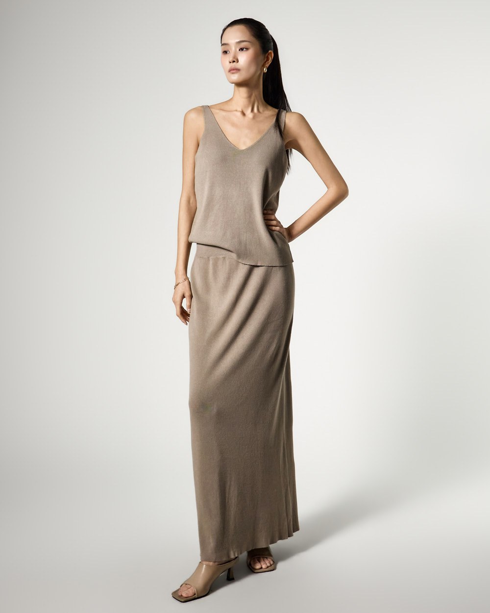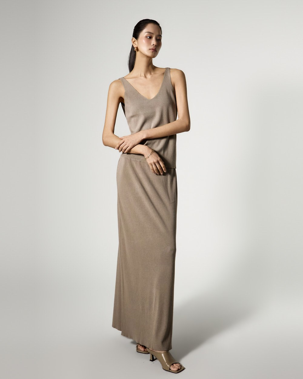 while the skirt exudes an elegant atmosphere with its long length and flared silhouette.