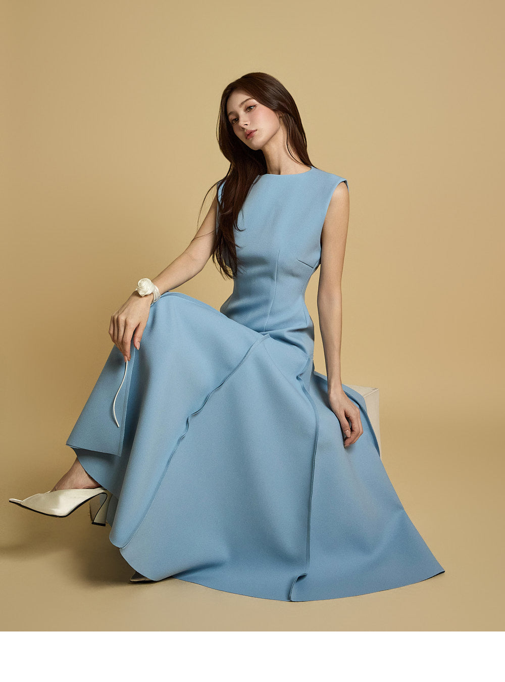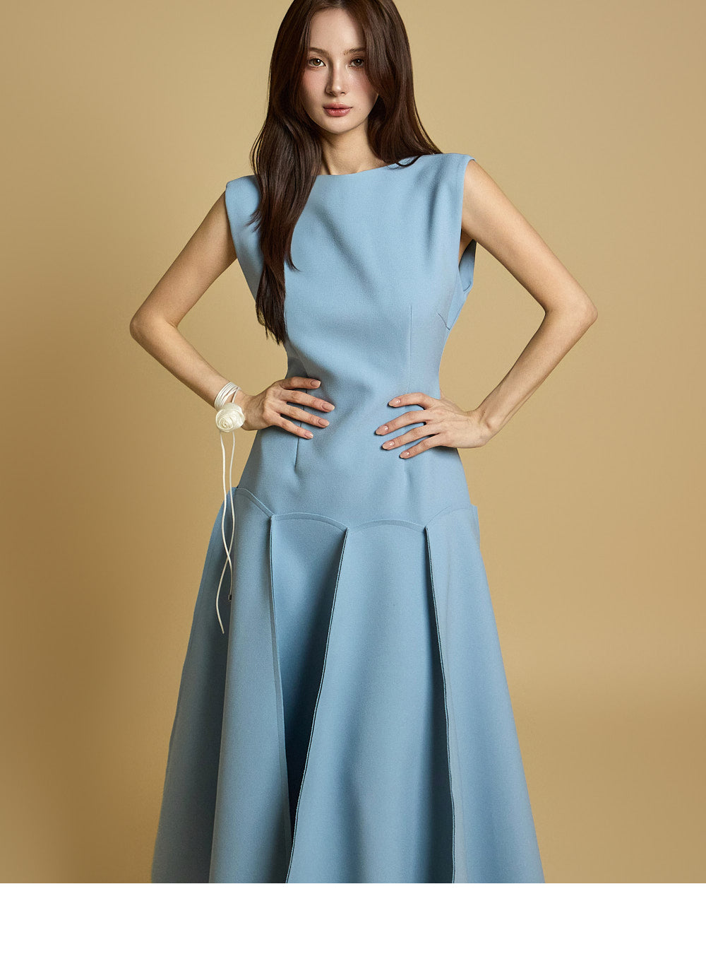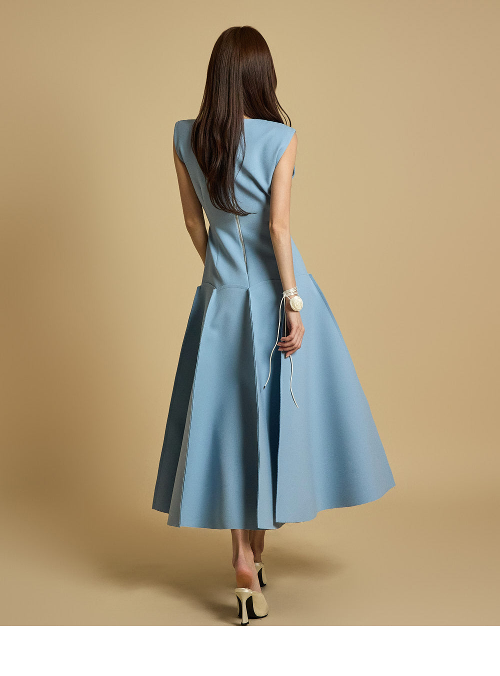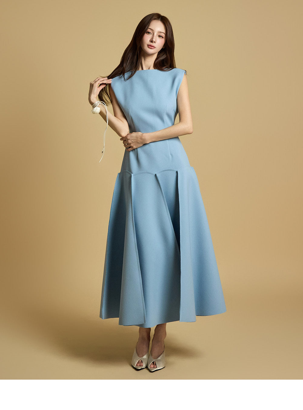 while the skirt's seam details add a sophisticated touch.