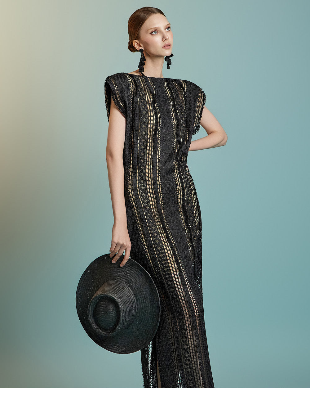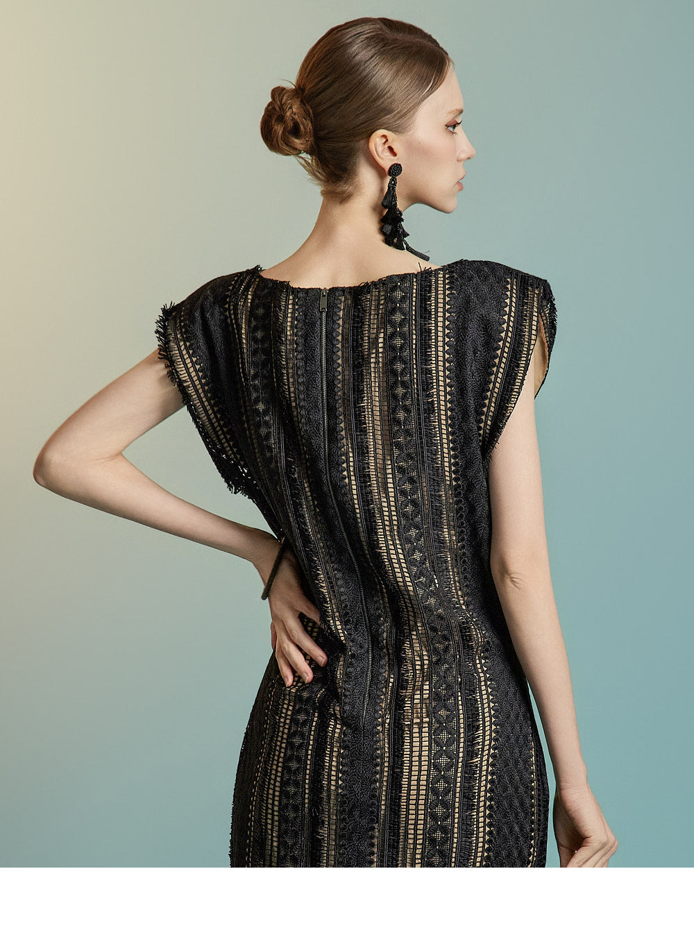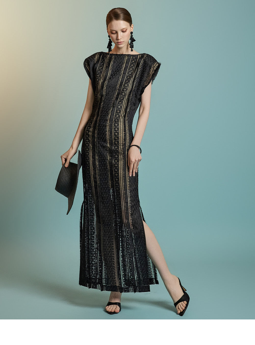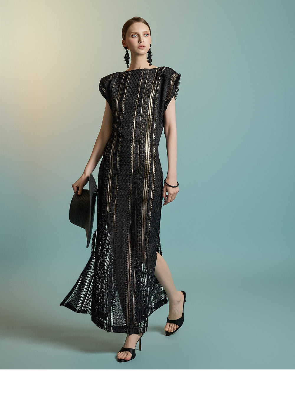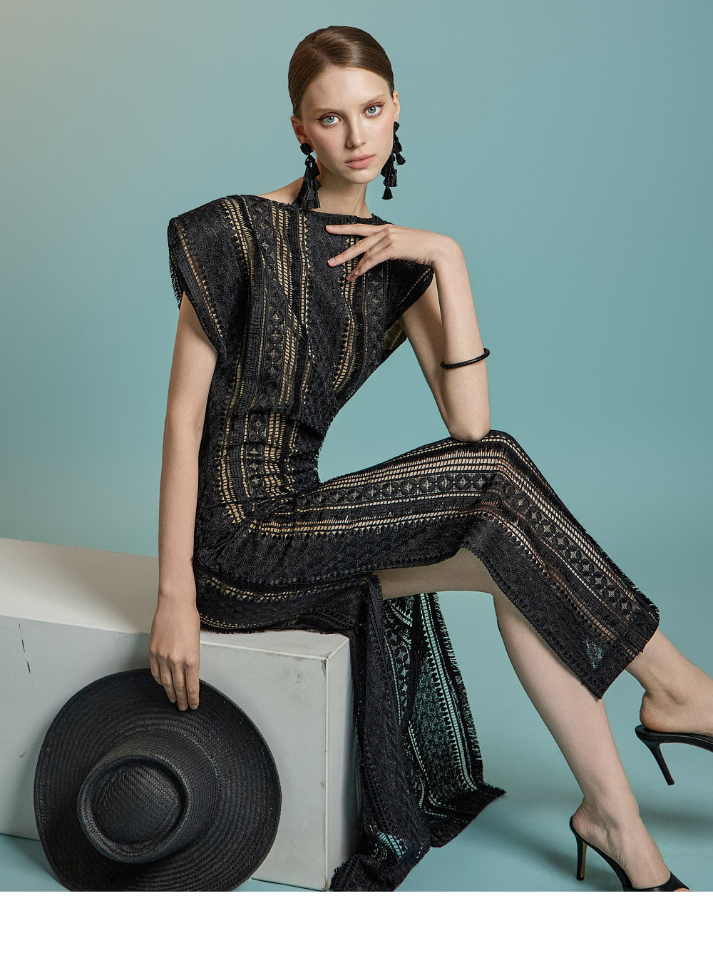 The delicate lace texture is complemented by raw-edge shoulder finishes