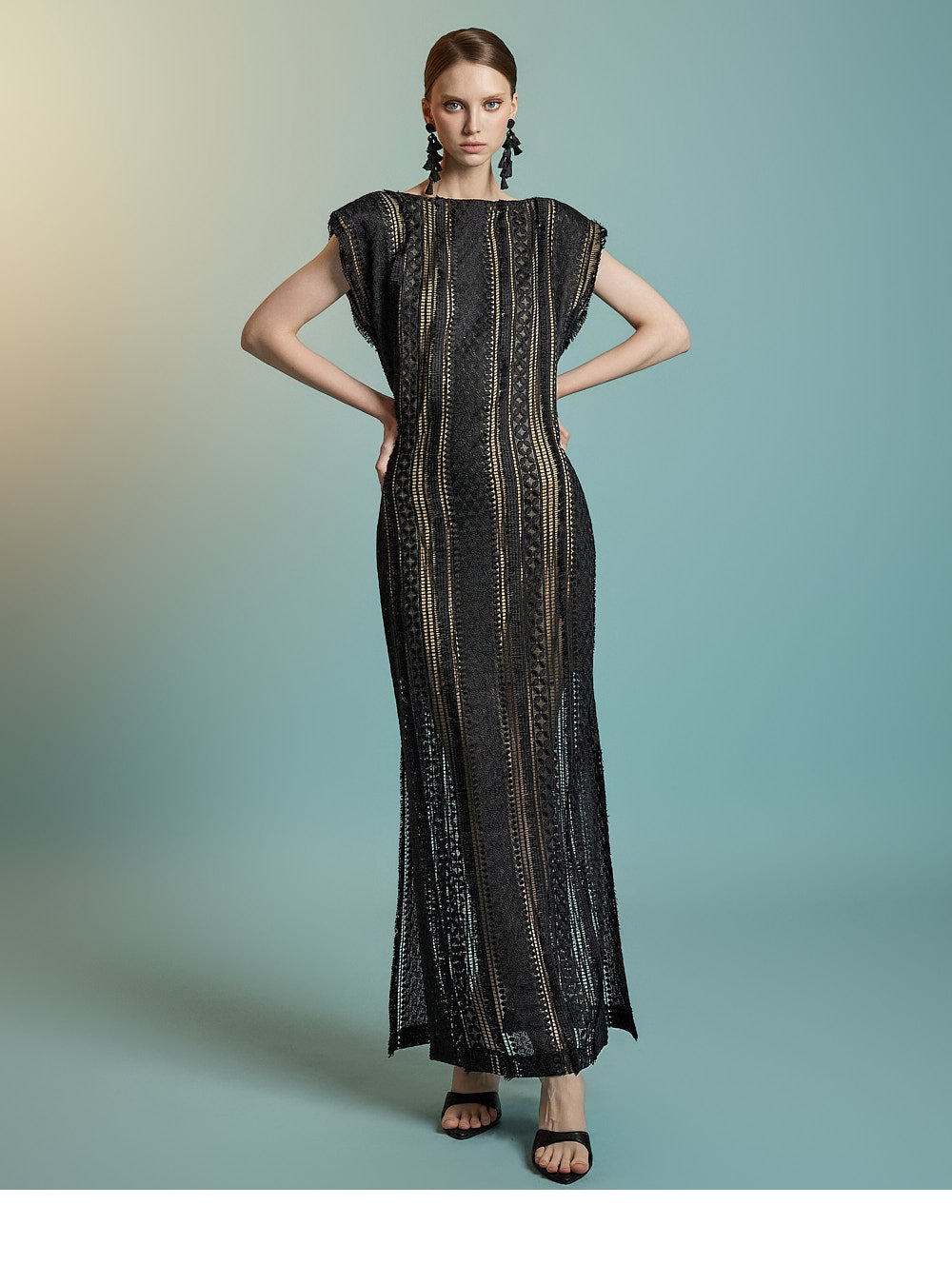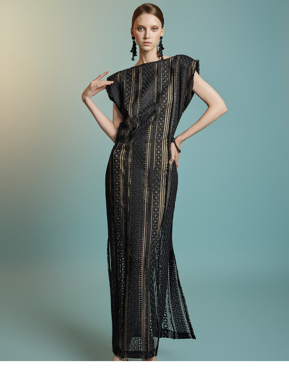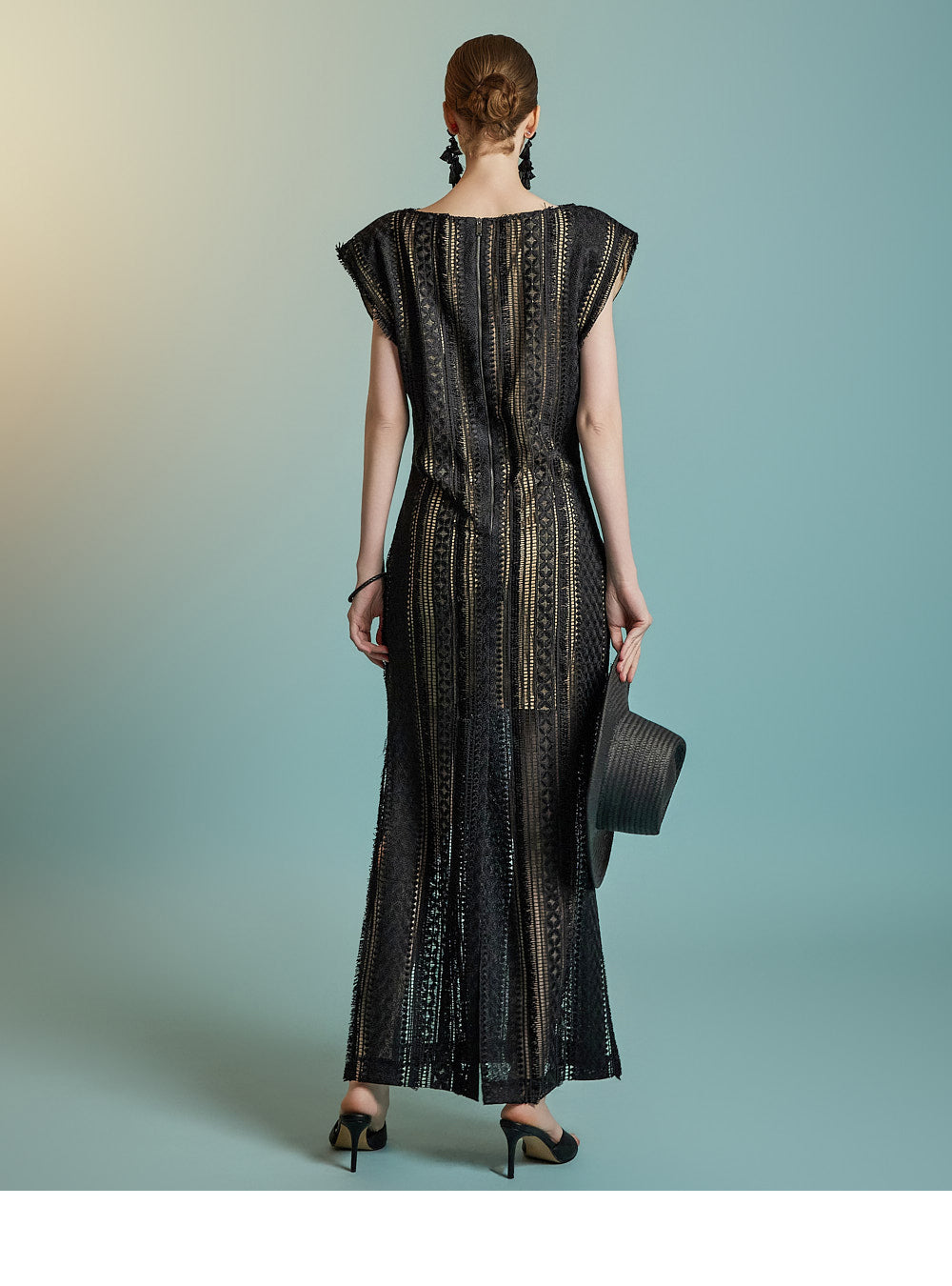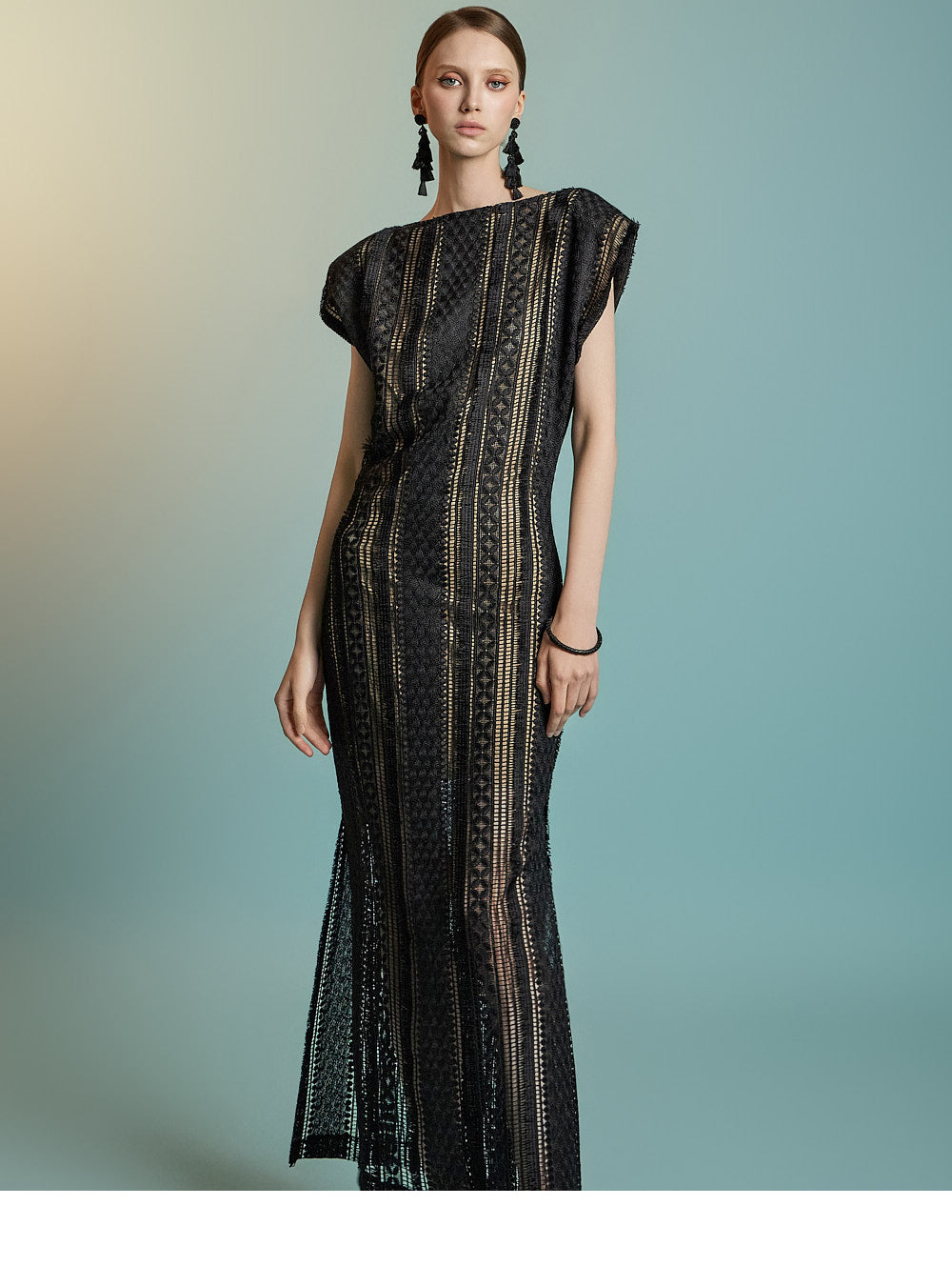 The delicate lace texture is complemented by raw-edge shoulder finishes