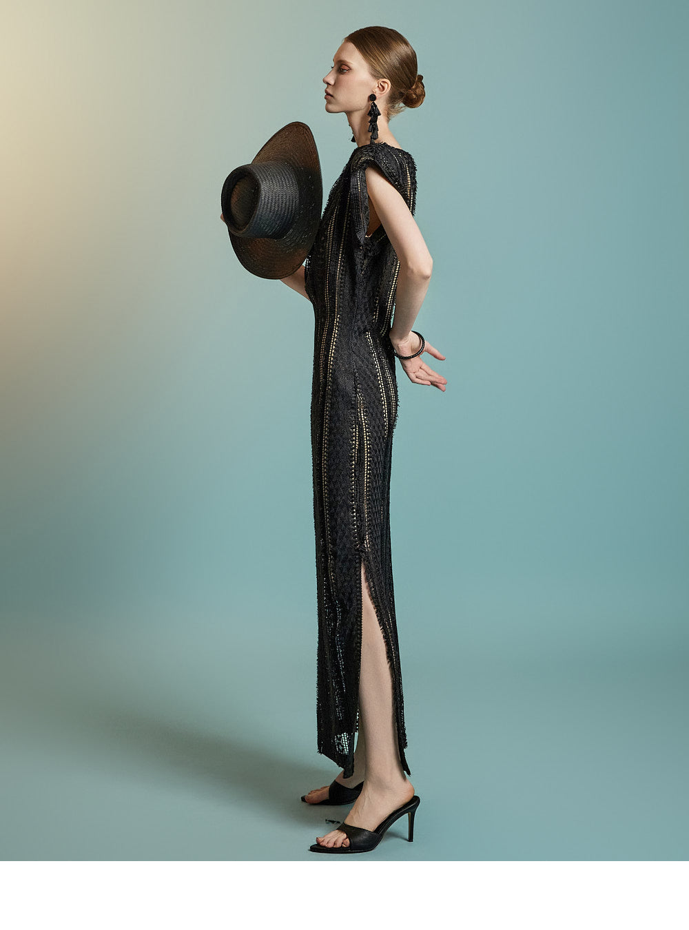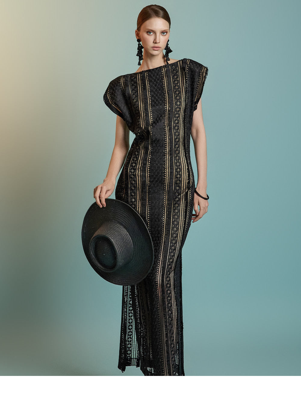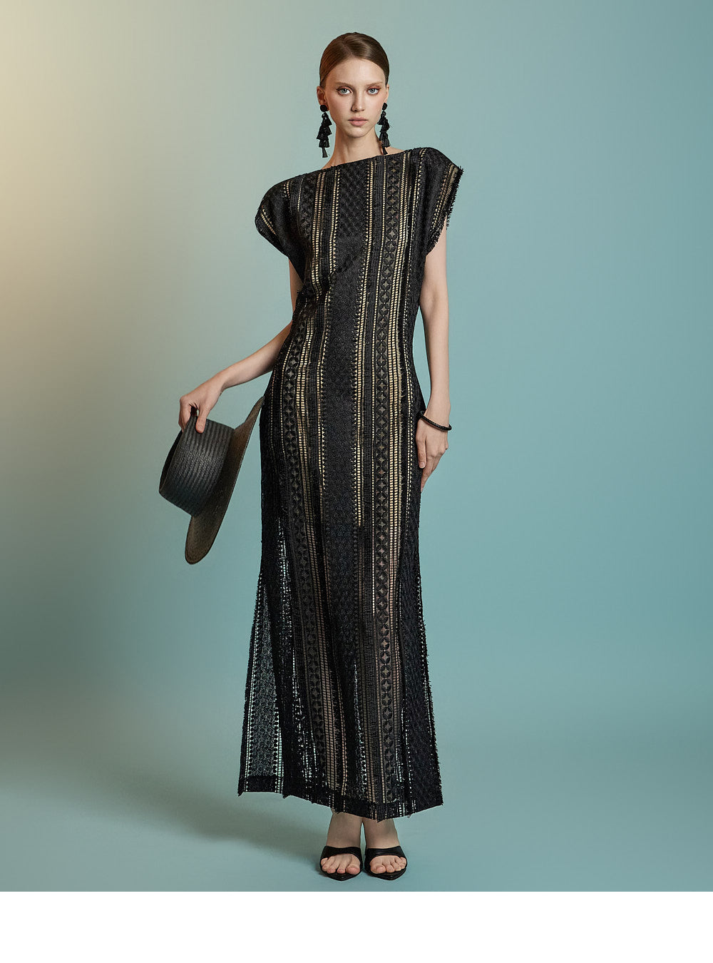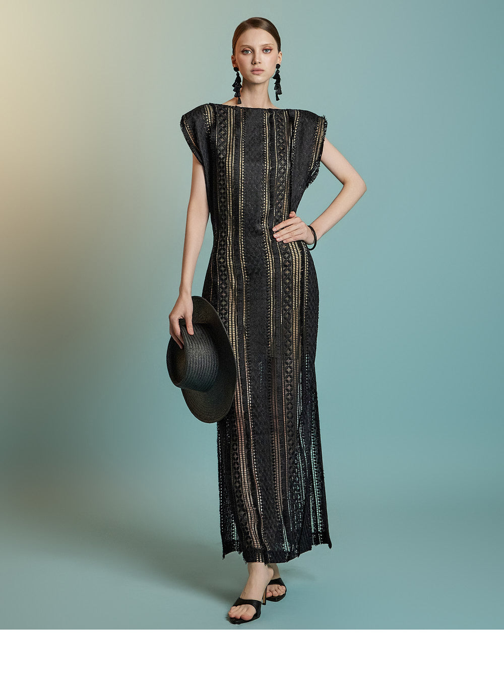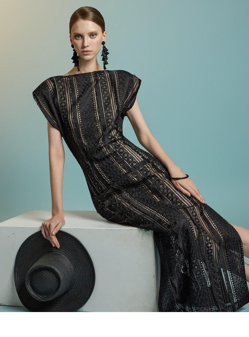 The delicate lace texture is complemented by raw-edge shoulder finishes