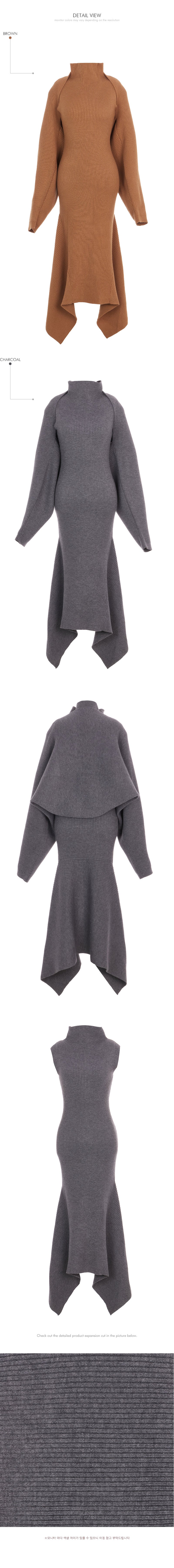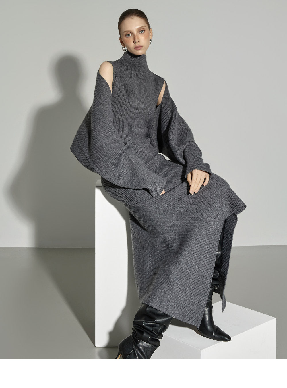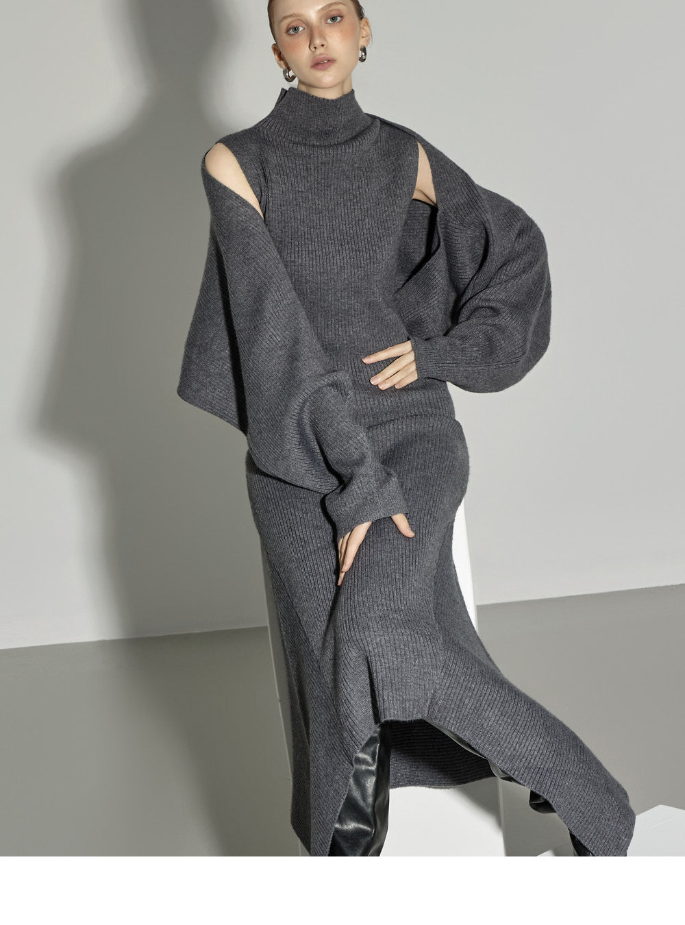 This set consists of a long sleeveless knit dress and an ankle-length bolero,