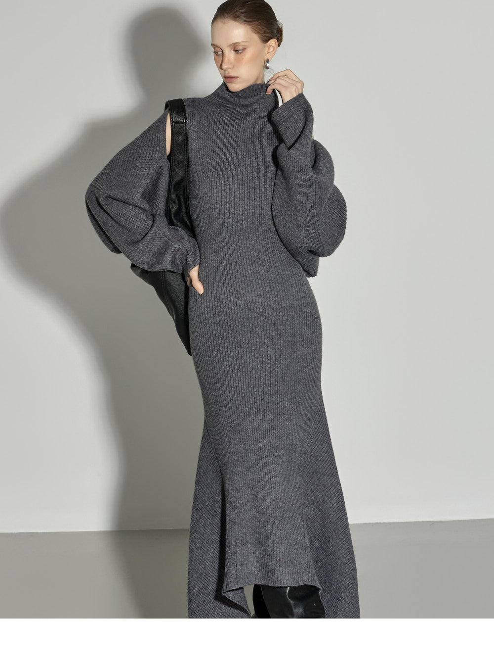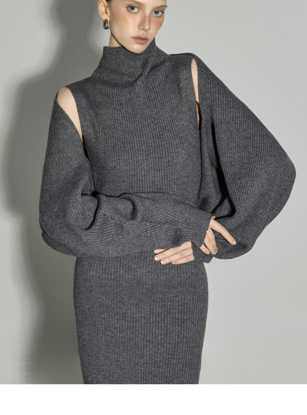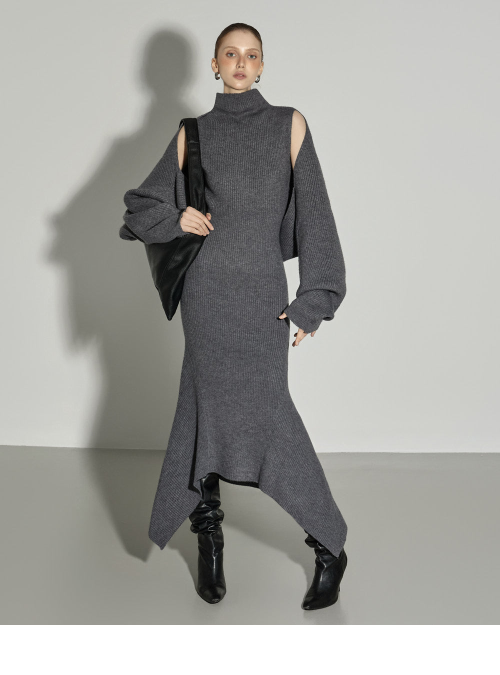 This set consists of a long sleeveless knit dress and an ankle-length bolero,