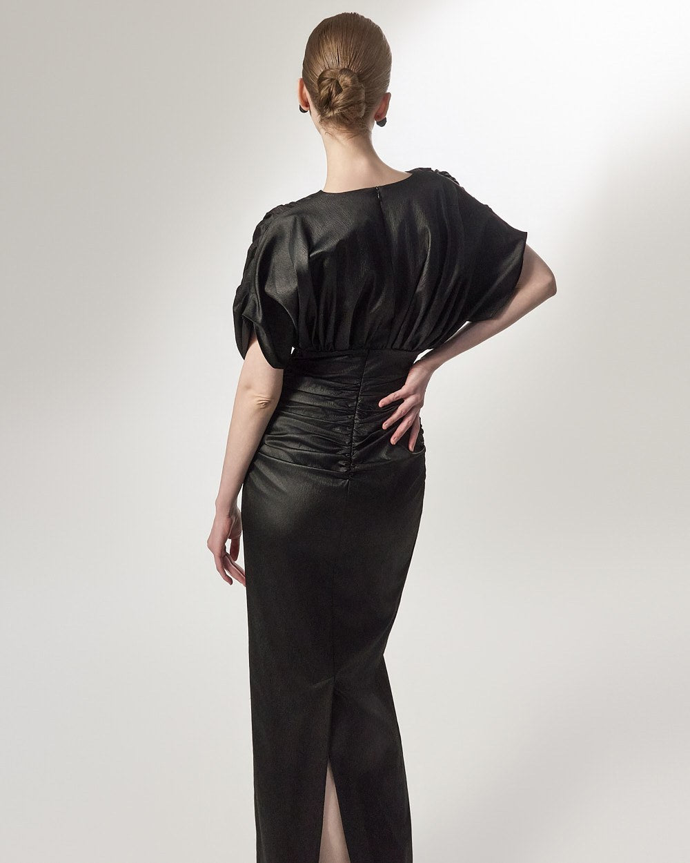 This is a long dress featuring a subtle sheen.