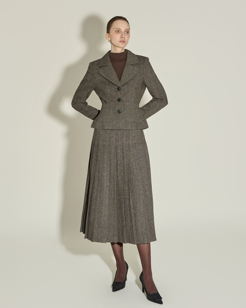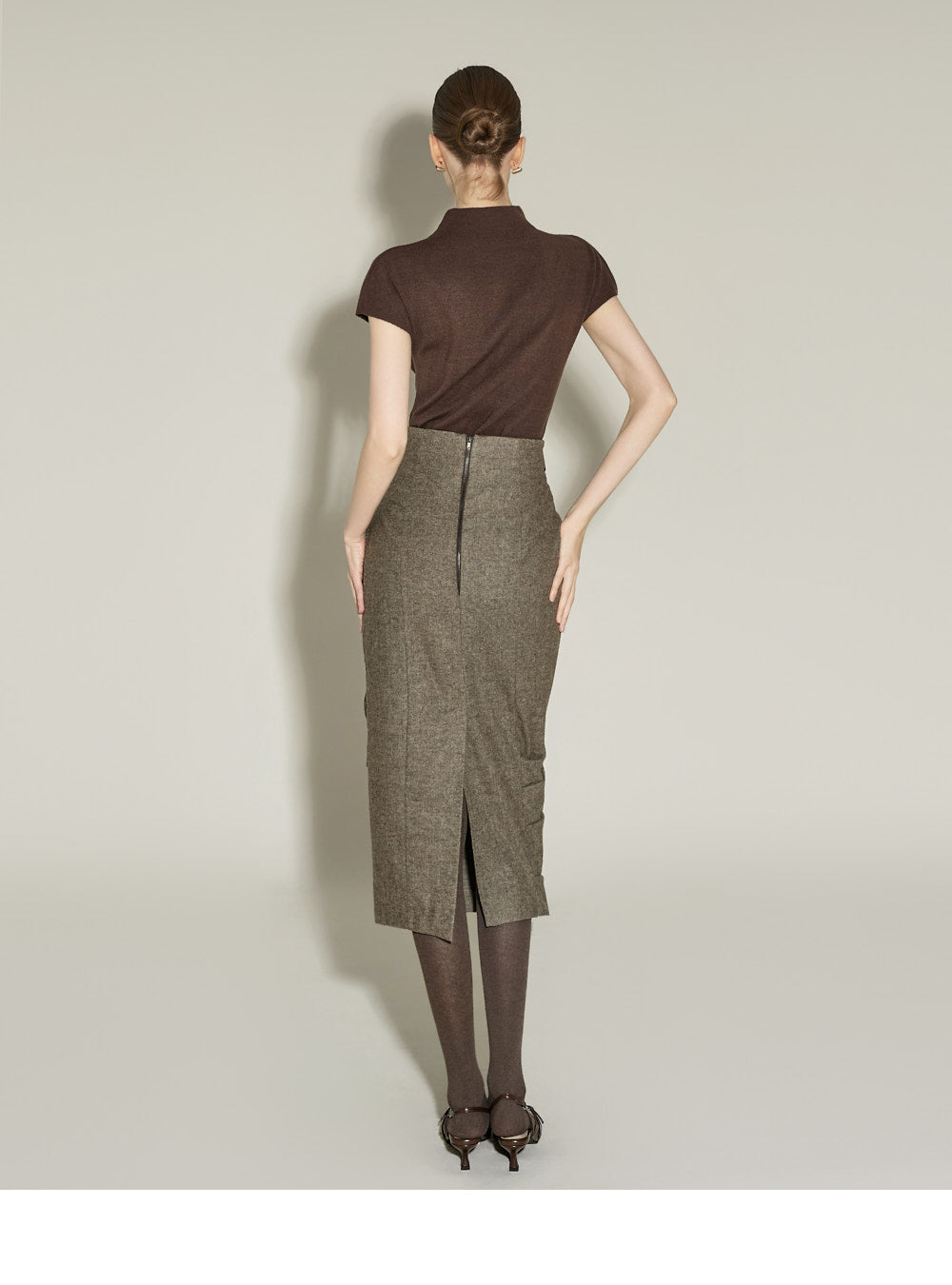 The semi-high neckline creates a sophisticated silhouette,