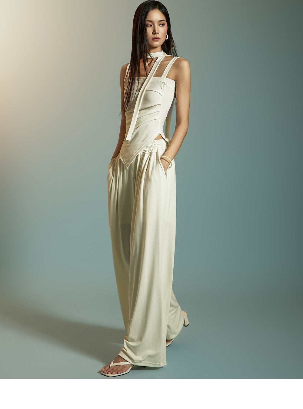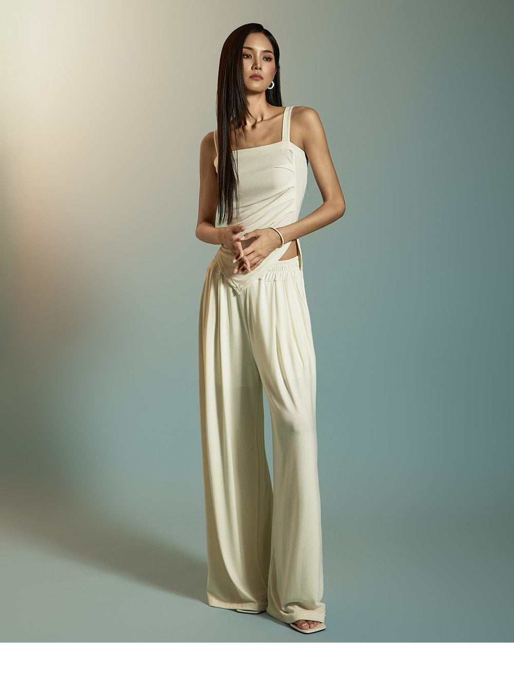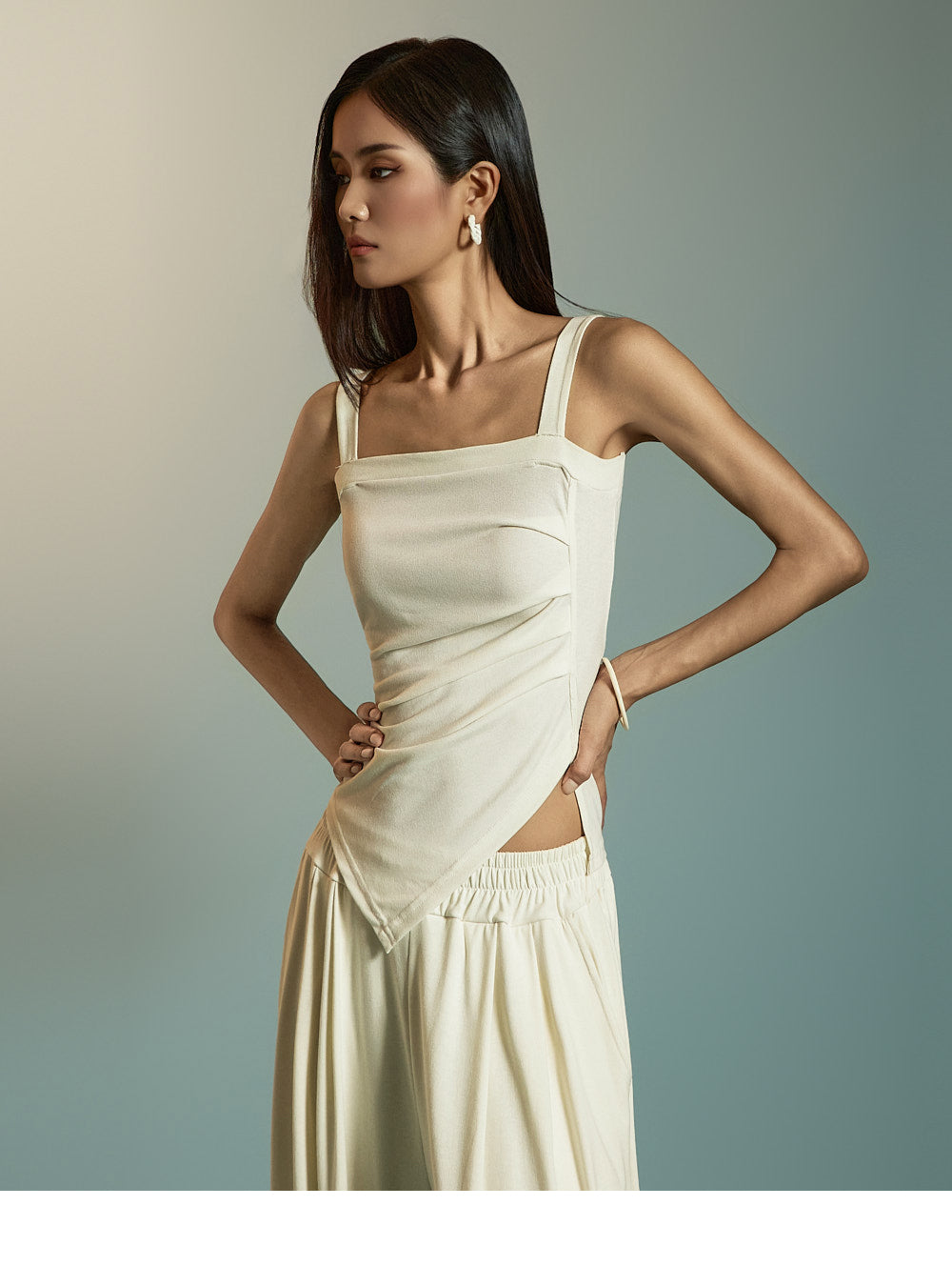 The asymmetric hem and slim fit highlight a feminine silhouette.