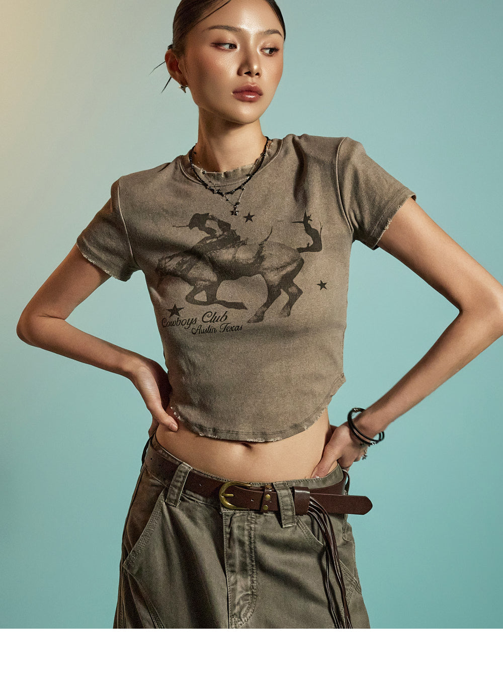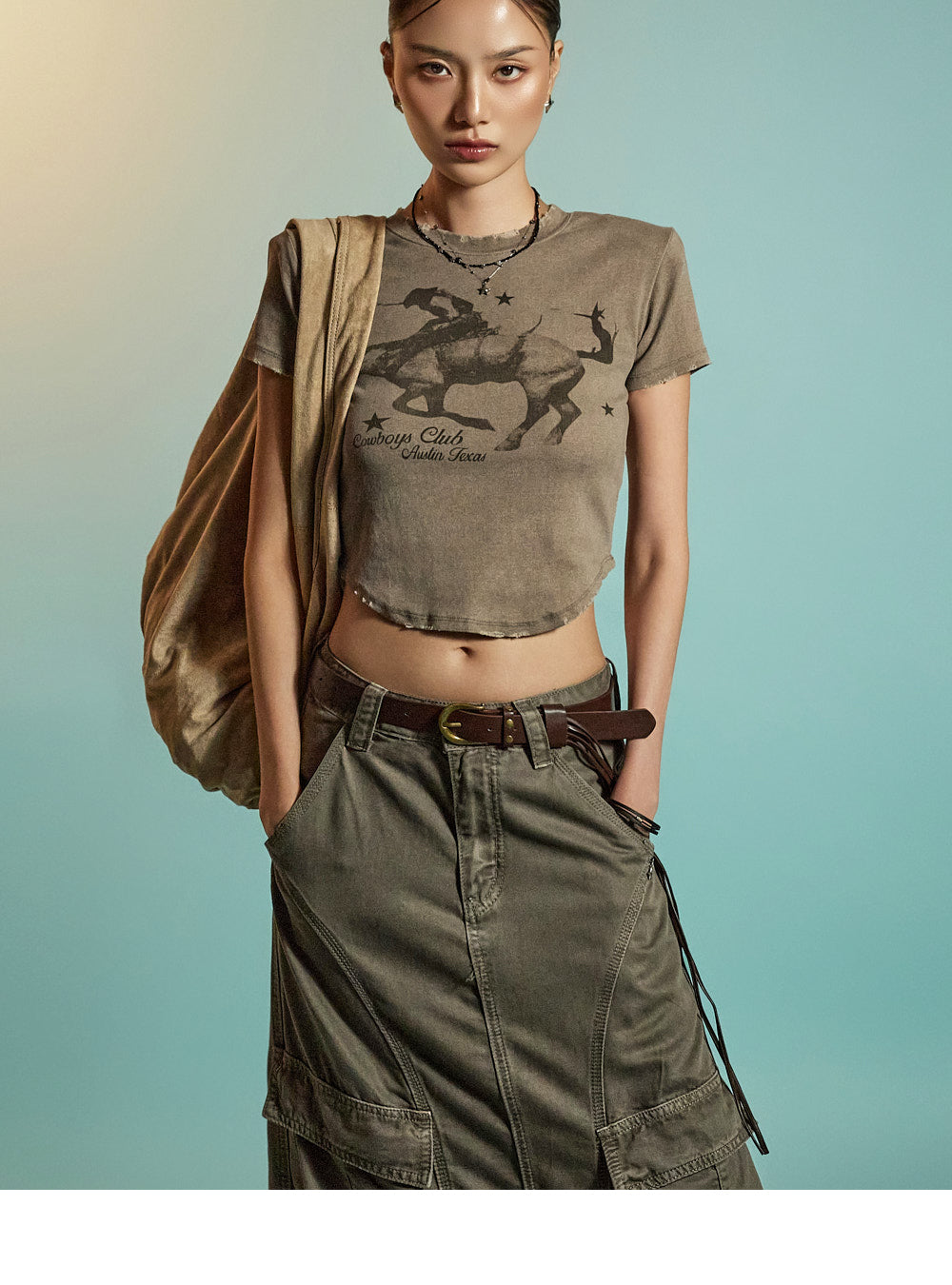 while the raw-edge hem brings a touch of vintage flair.