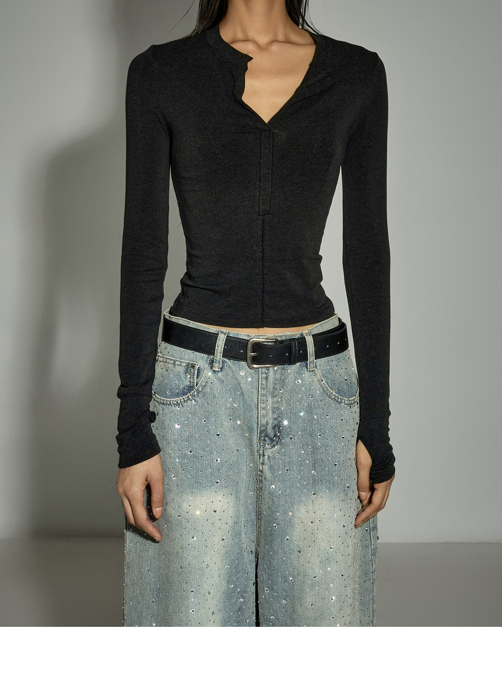 The sleeve hem features thumb holes,