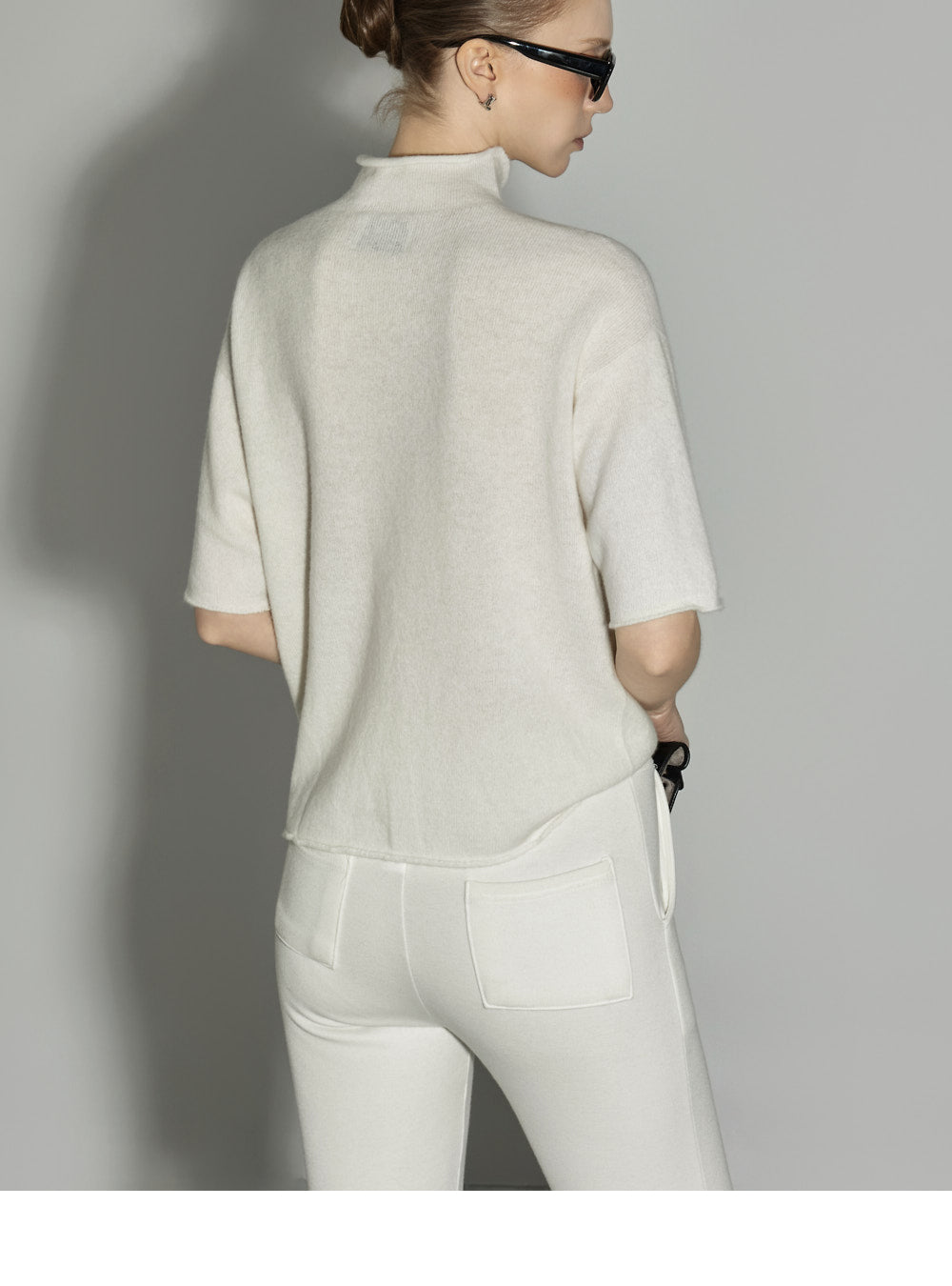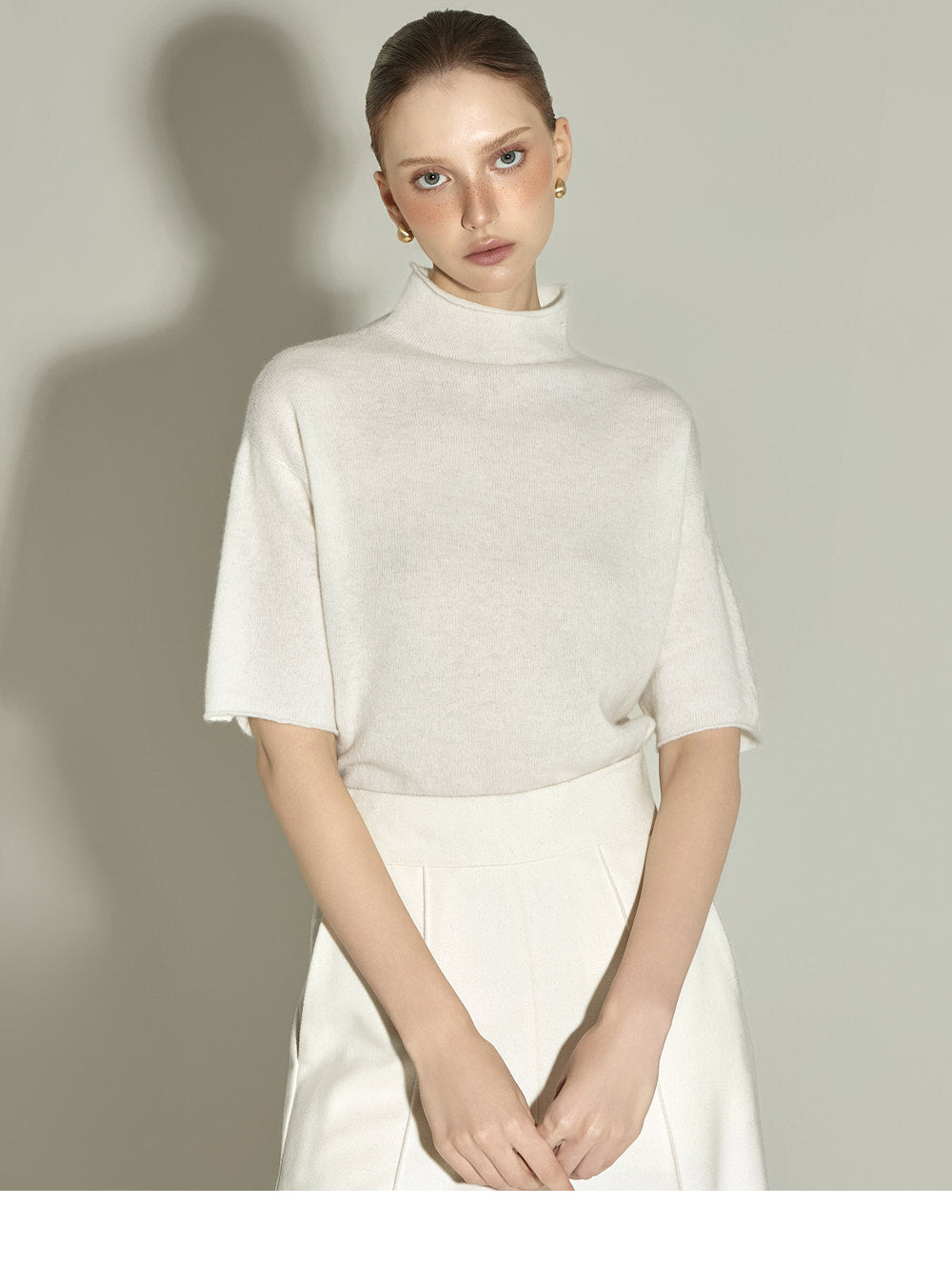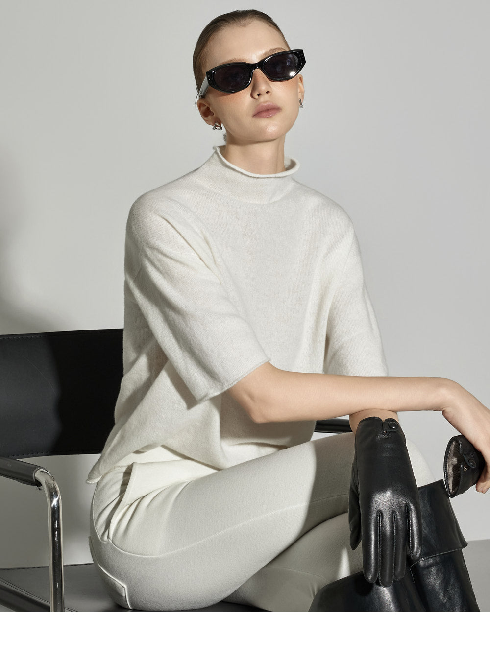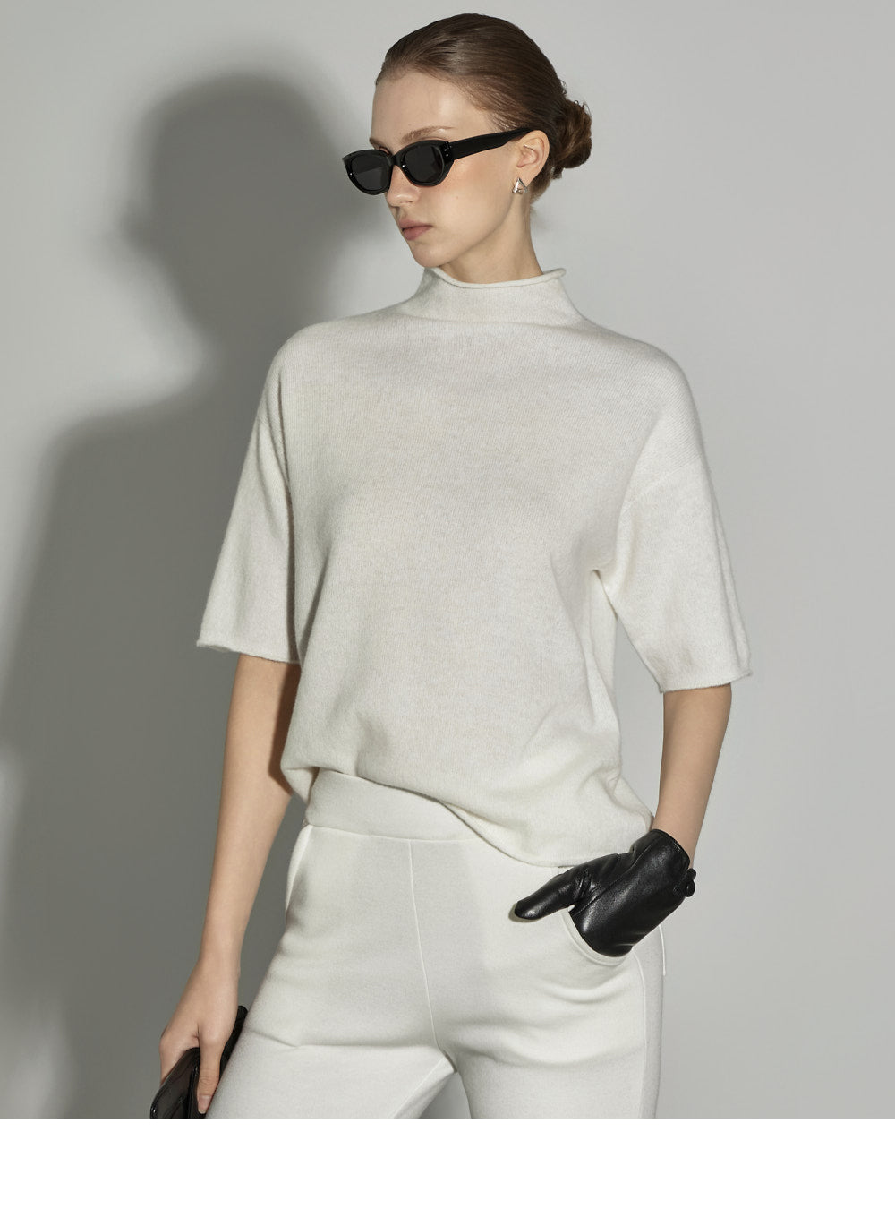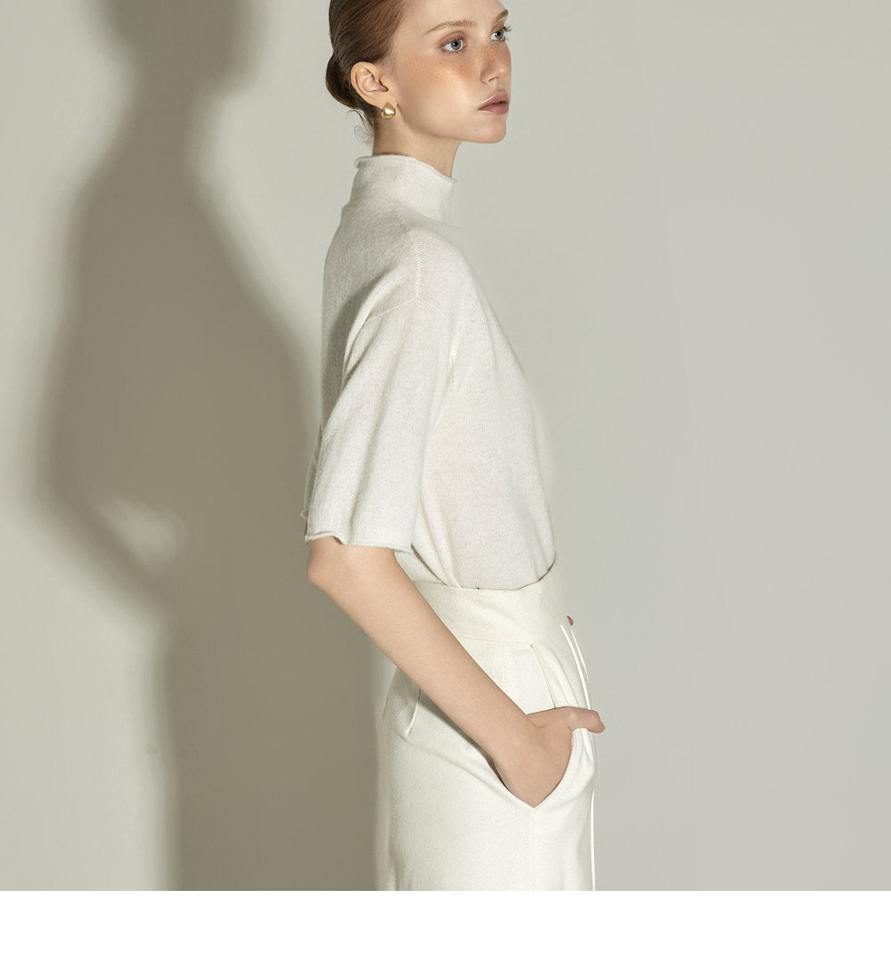 The half-neck design creates a silhouette that naturally hugs the neckline without feeling stuffy.