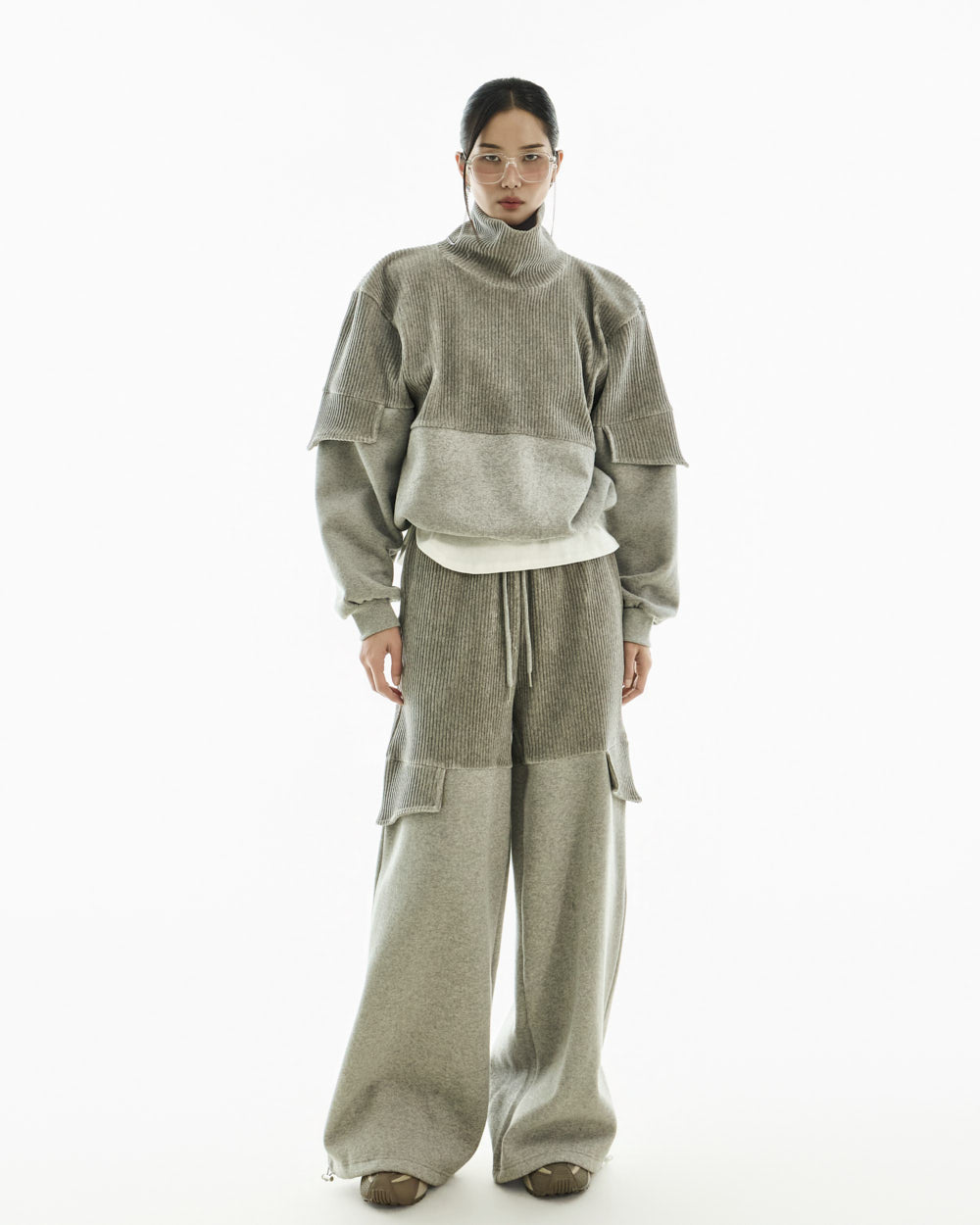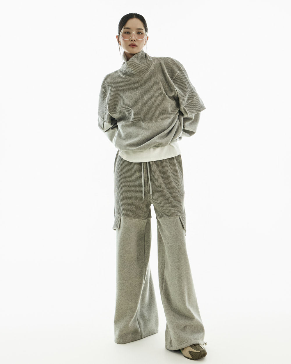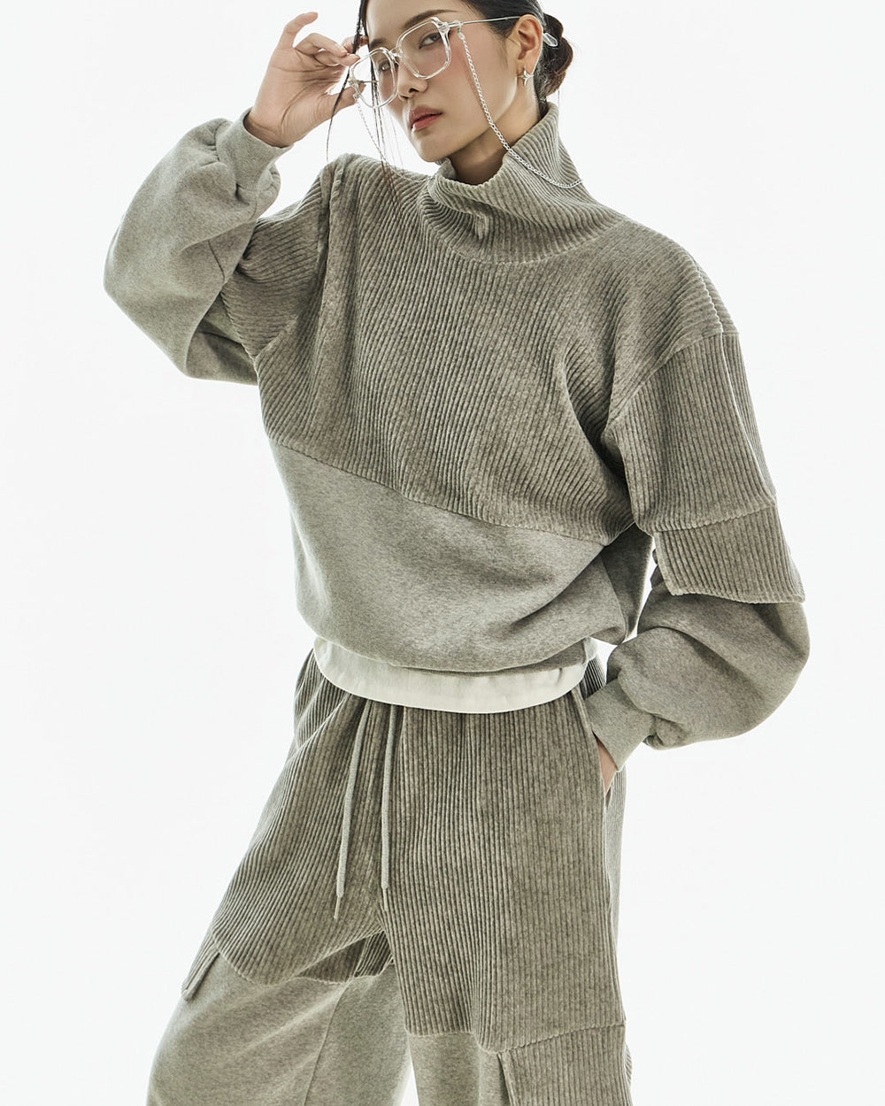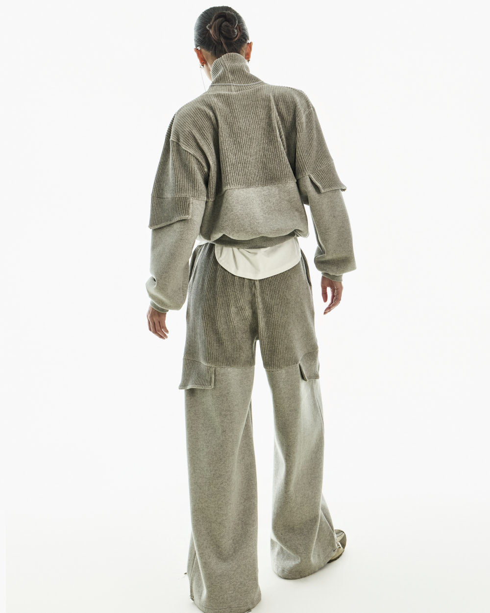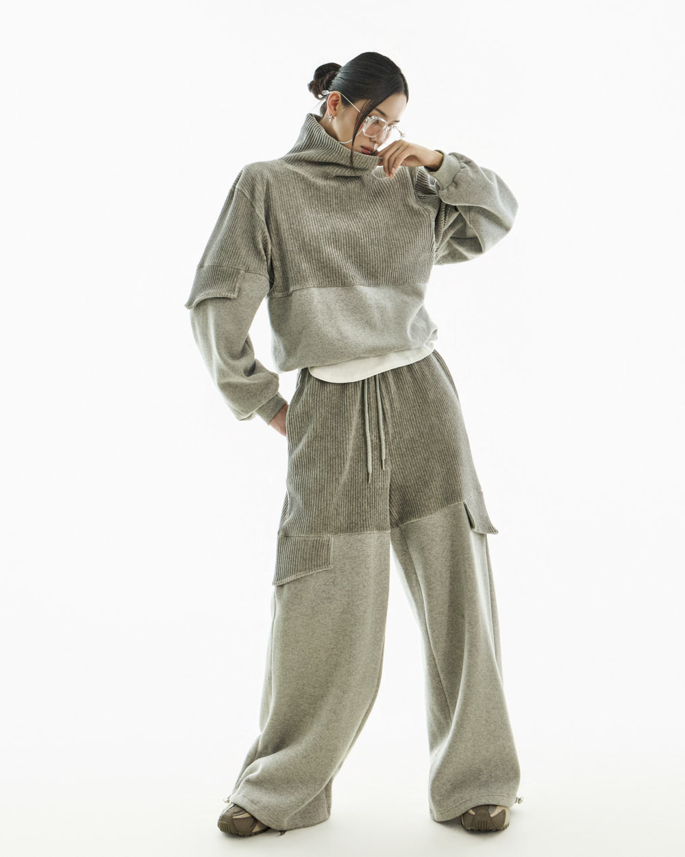It pairs well with a variety of bottoms, including sweatpants, denim, and wide-leg pants.