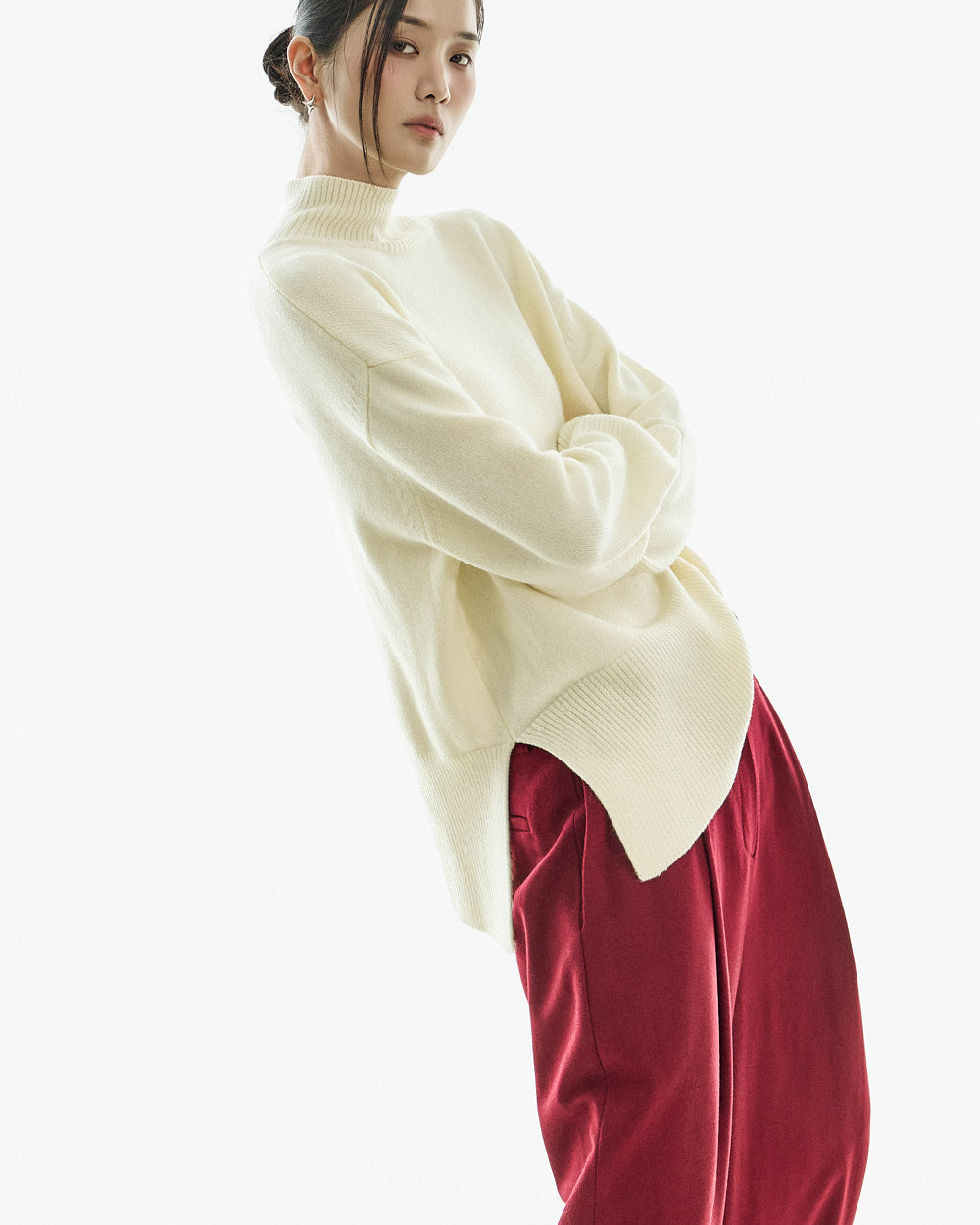 The turtleneck design wraps around the neck for enhanced warmth, and the side slits at the hem add both mobility and a touch of style.