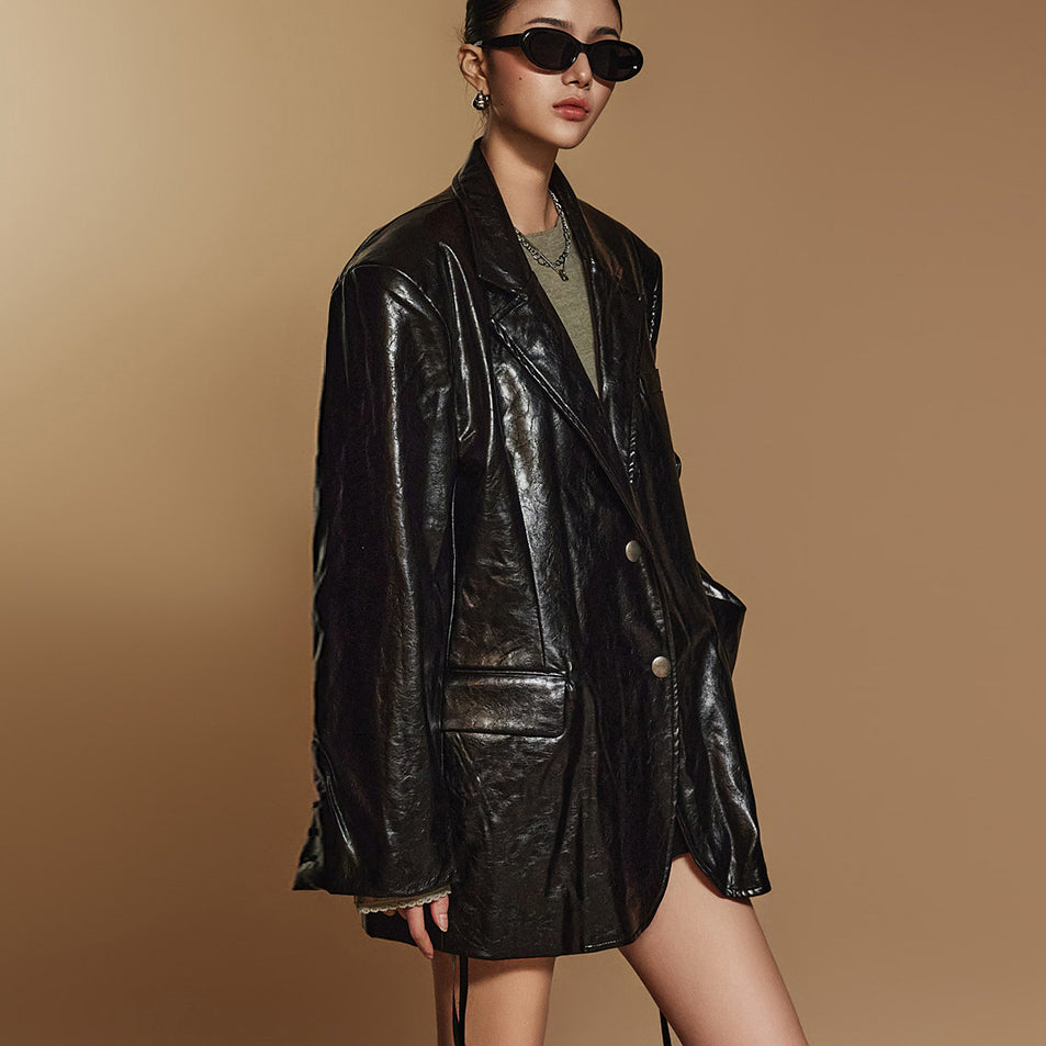 Crafted from glossy leather, this jacket allows you