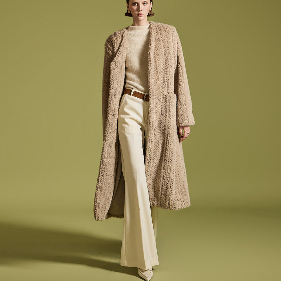 The model, 174cm tall, is wearing the ONE size in BEIGE.