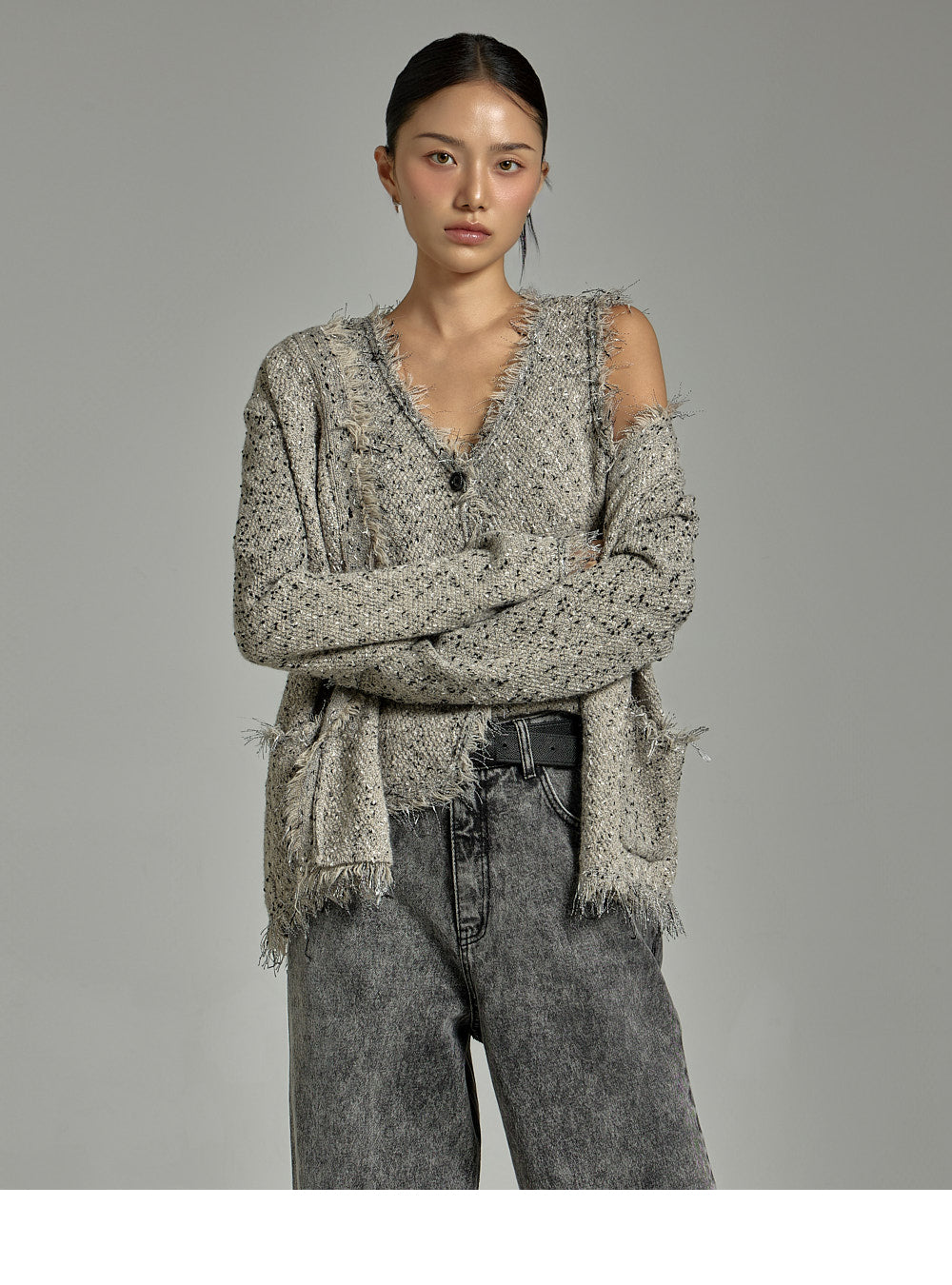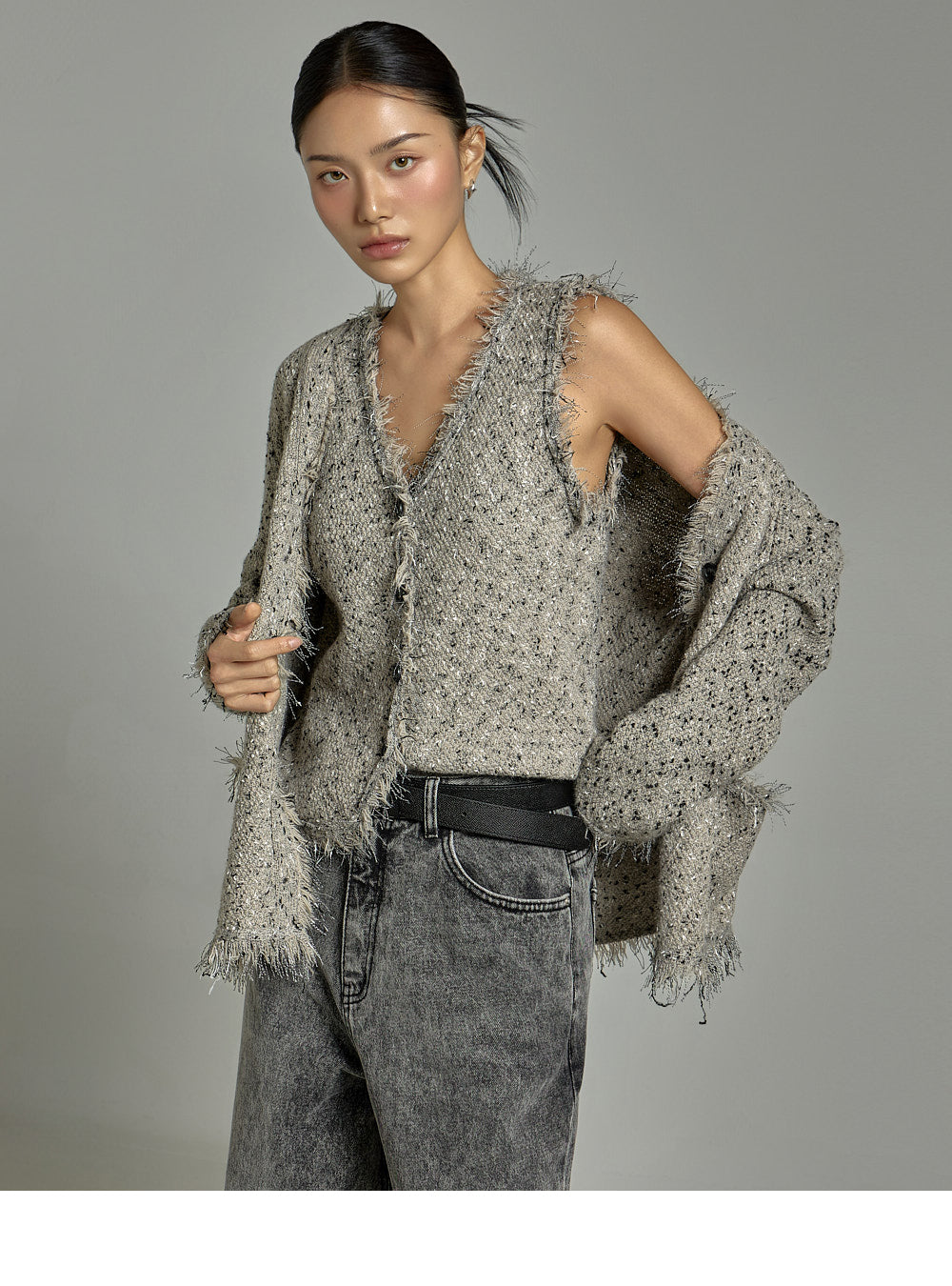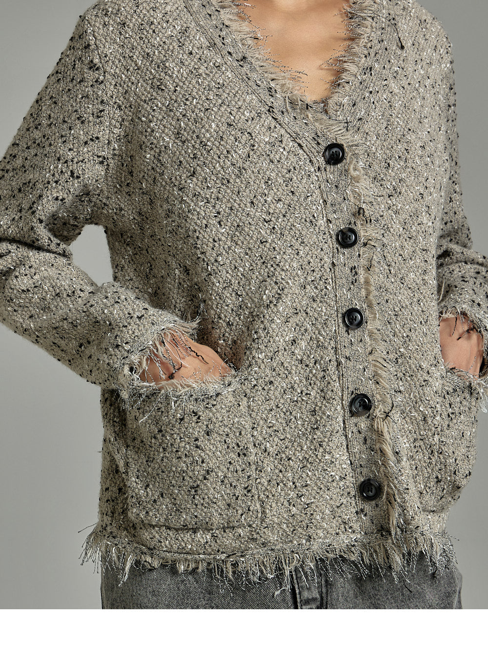 The cardigan features a front button closure and pockets on both sides for added practicality,