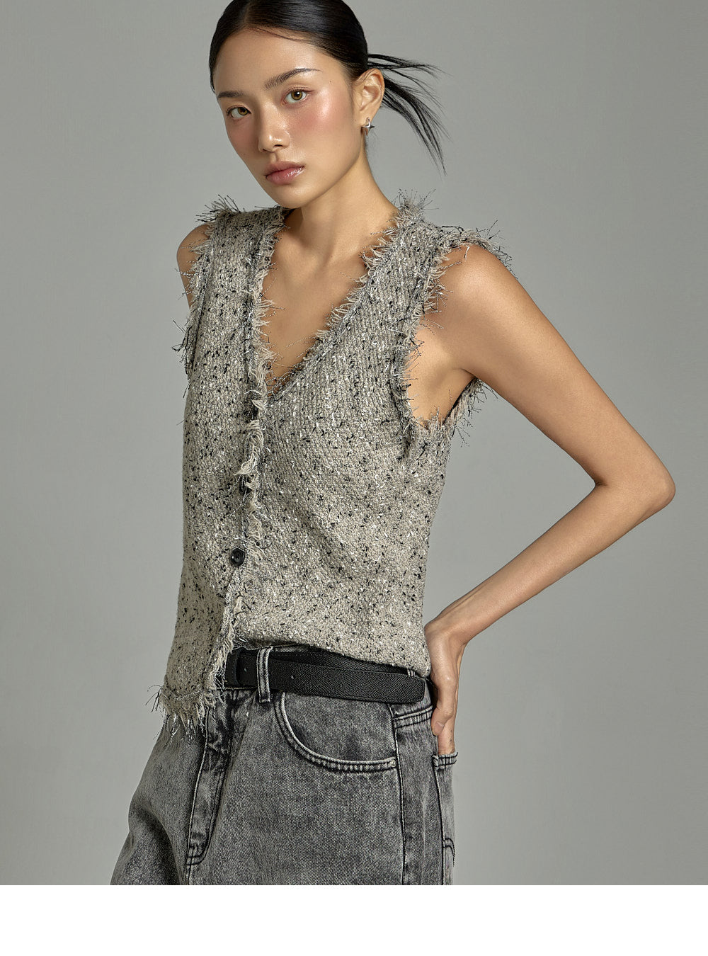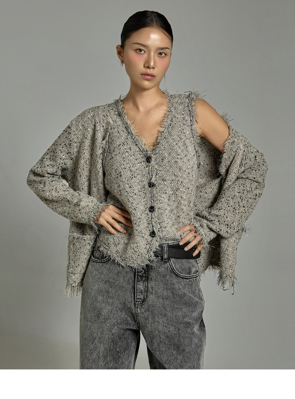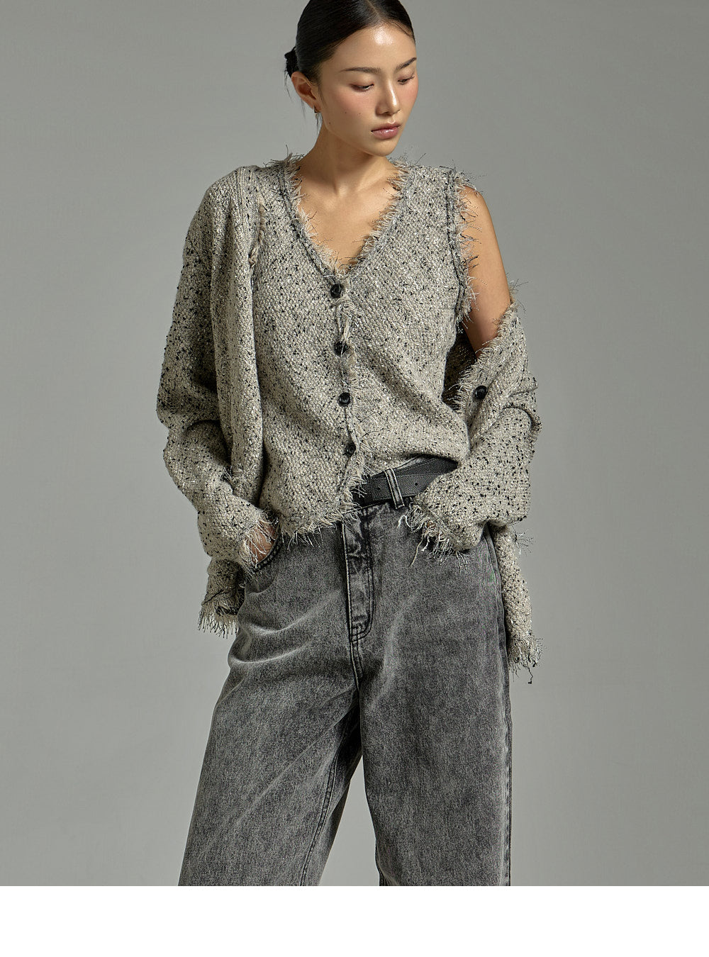 The cardigan features a front button closure and pockets on both sides for added practicality,