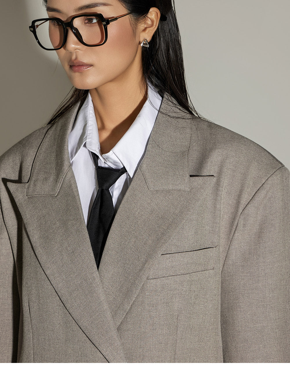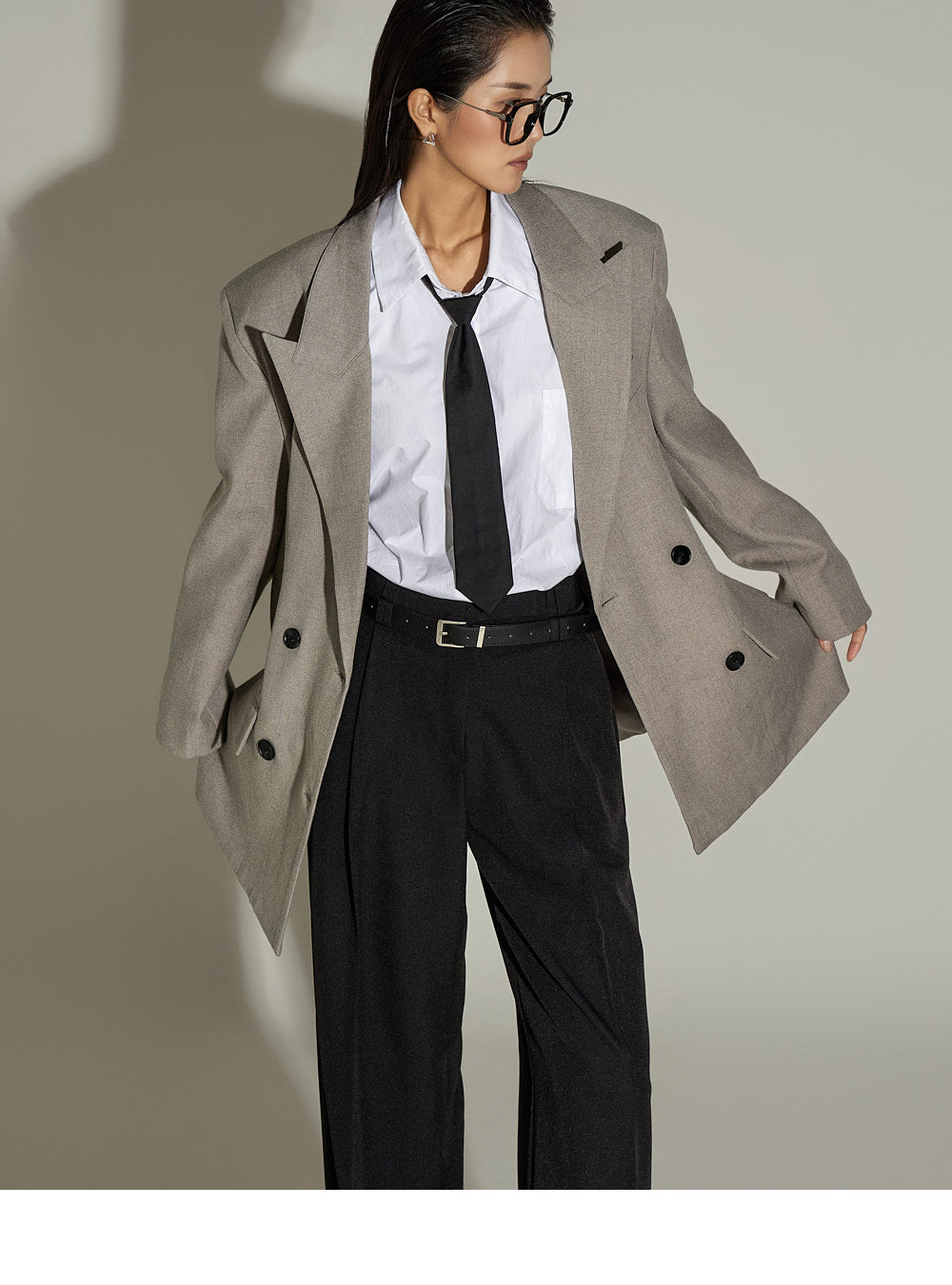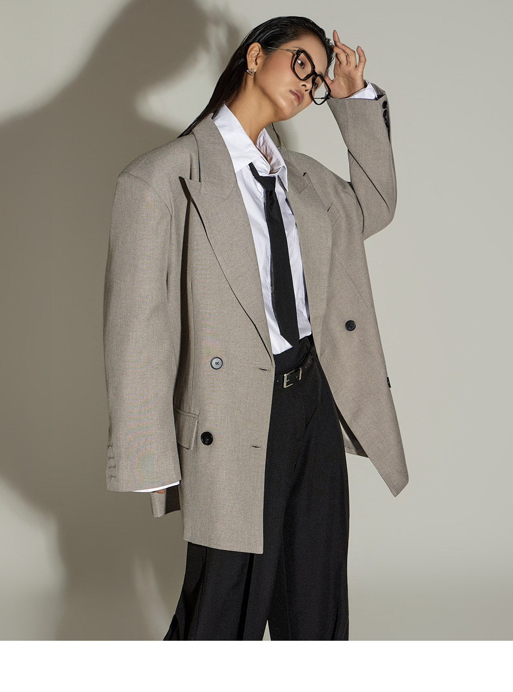 The loose, oversized silhouette and double-button design
