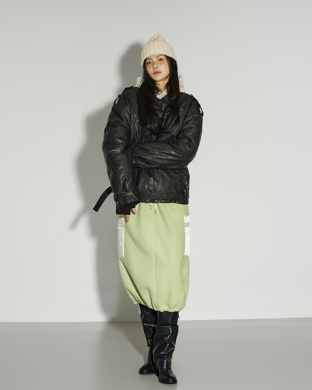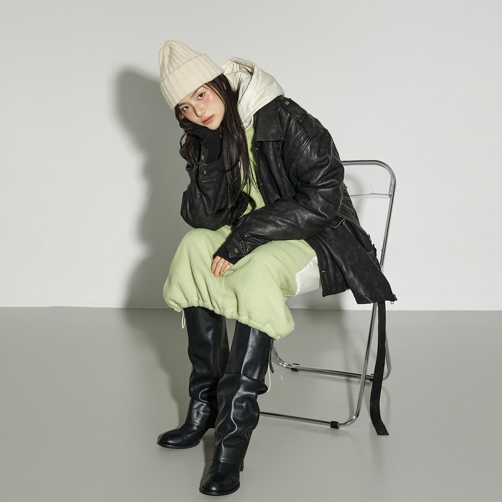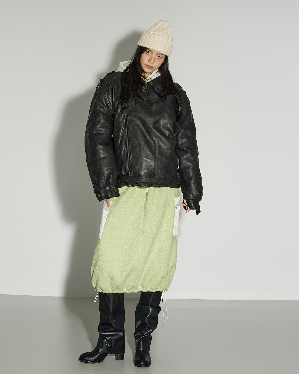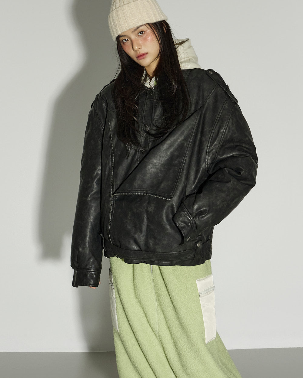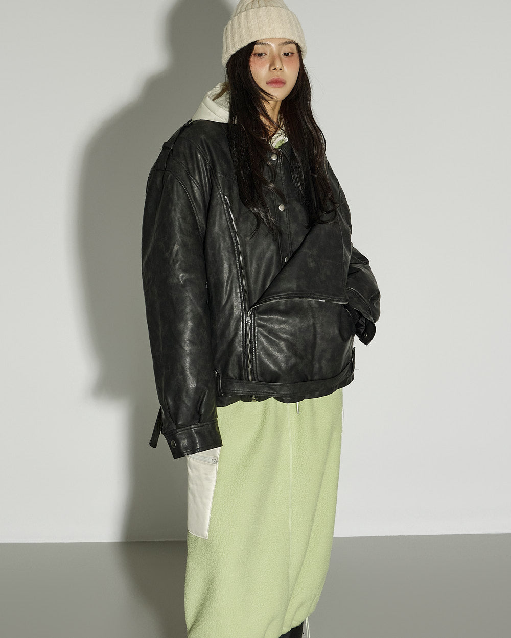 The front zipper and snap button closure emphasize the rider-inspired aesthetic,