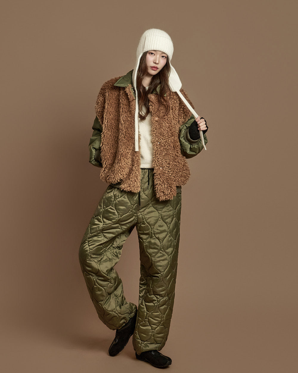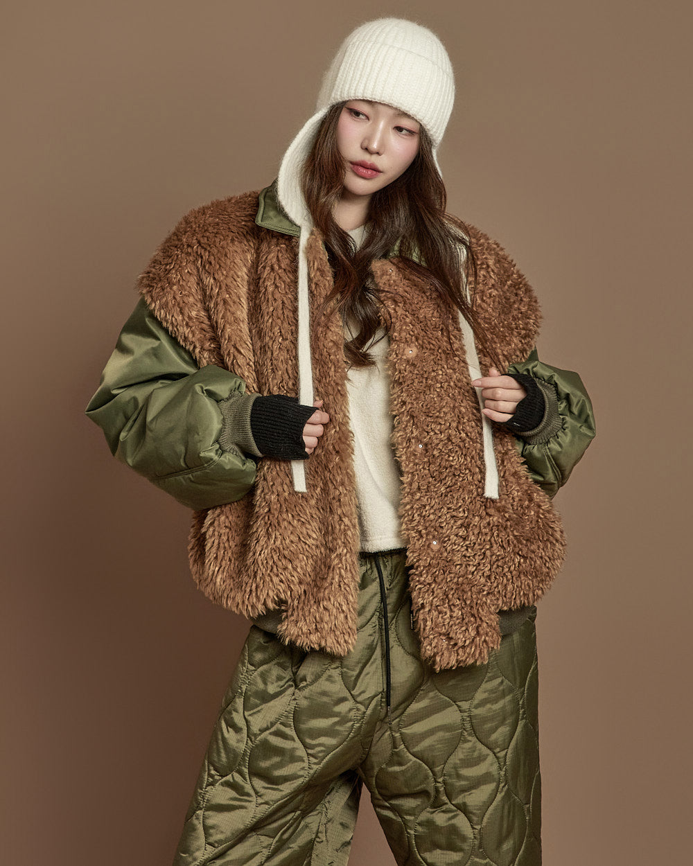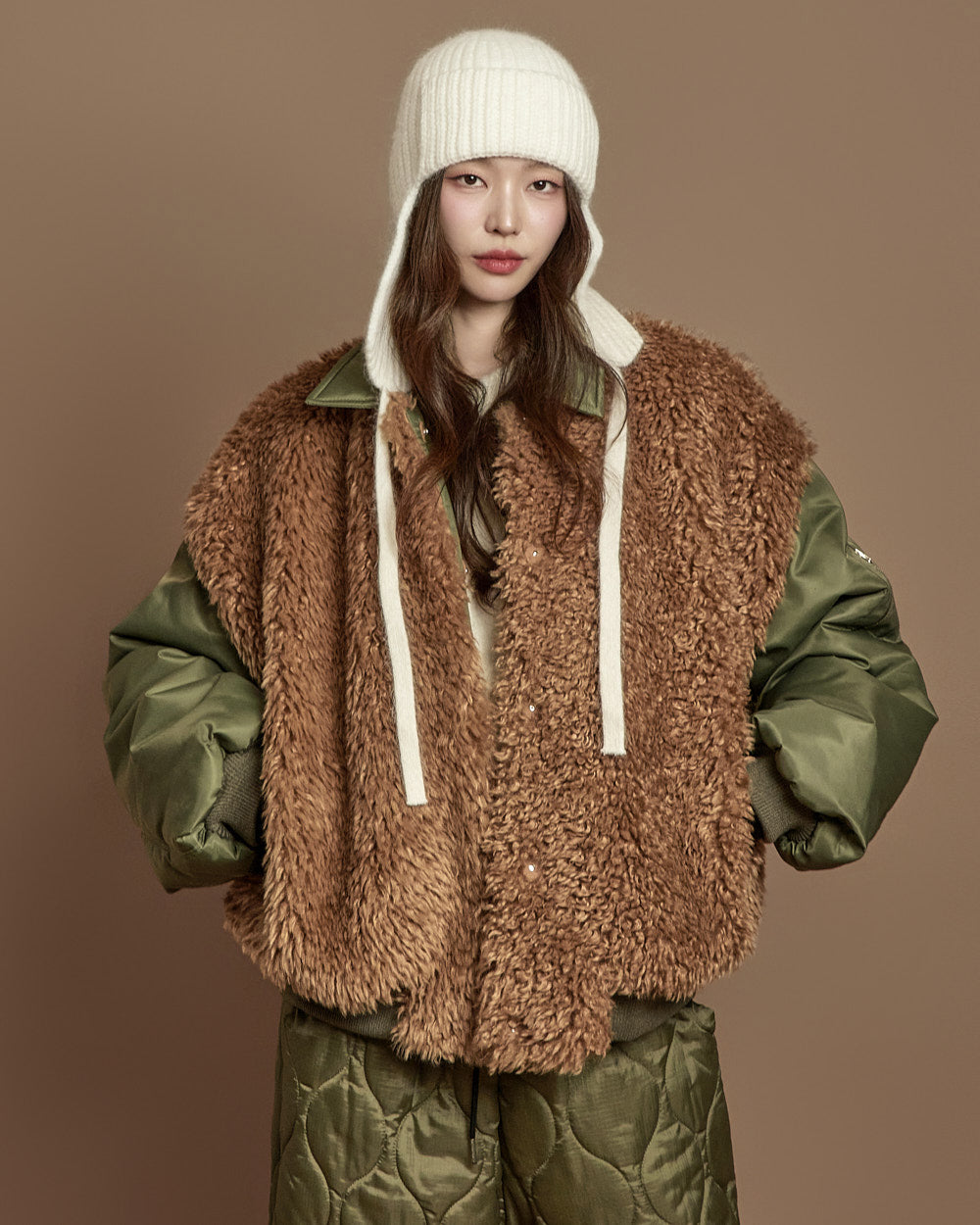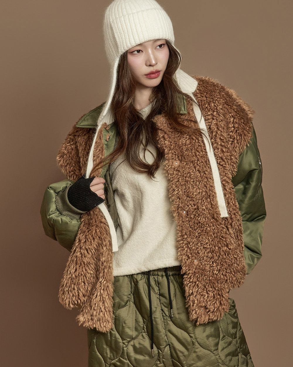 The 171cm model is wearing size ONE, color KHAKI.