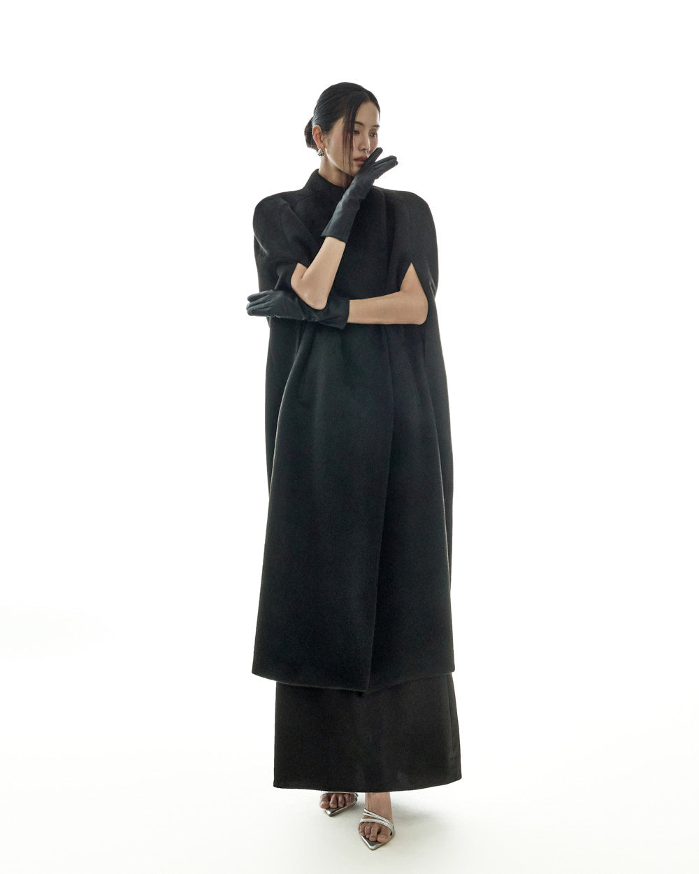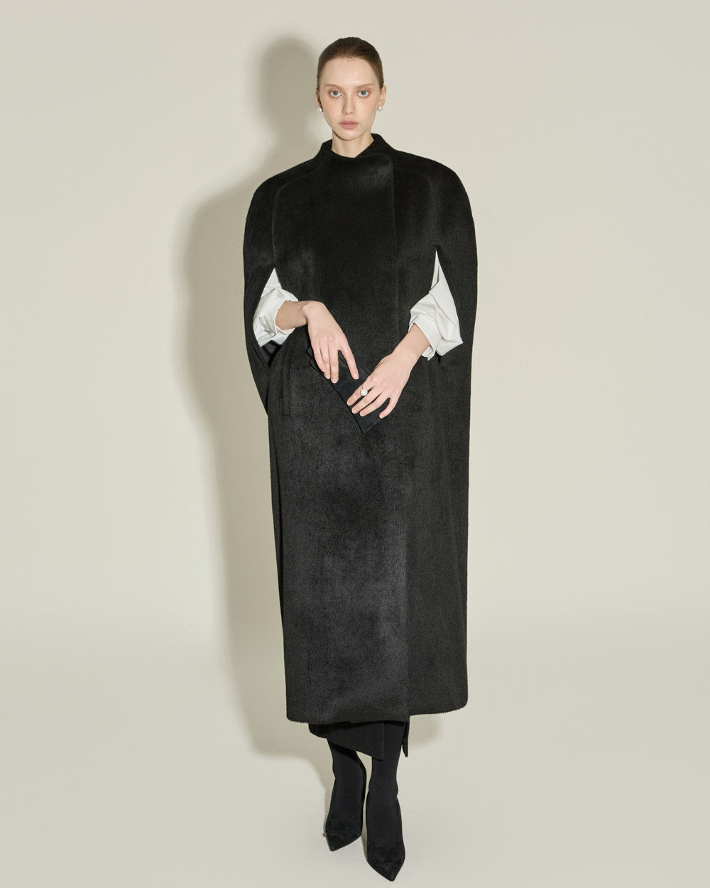 The cape's signature slit armholes and semi-high neckline