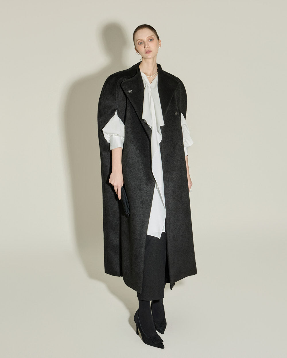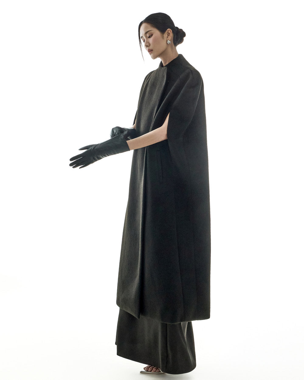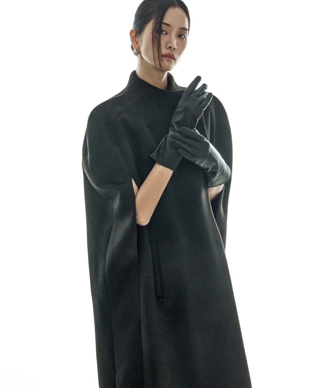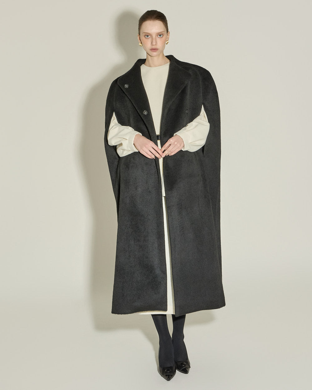 This cape coat exudes a unique and elegant vibe.