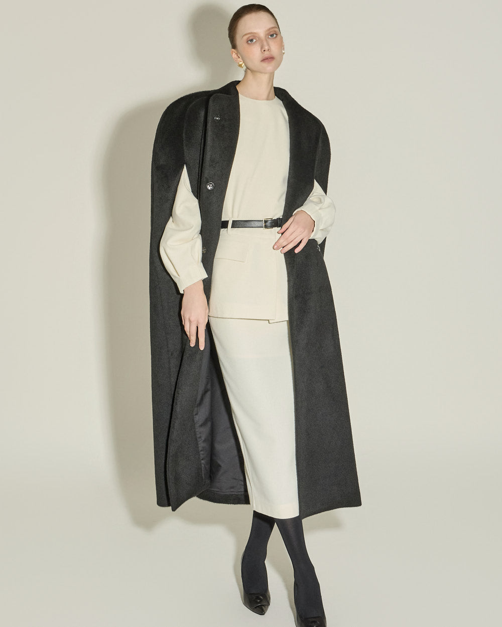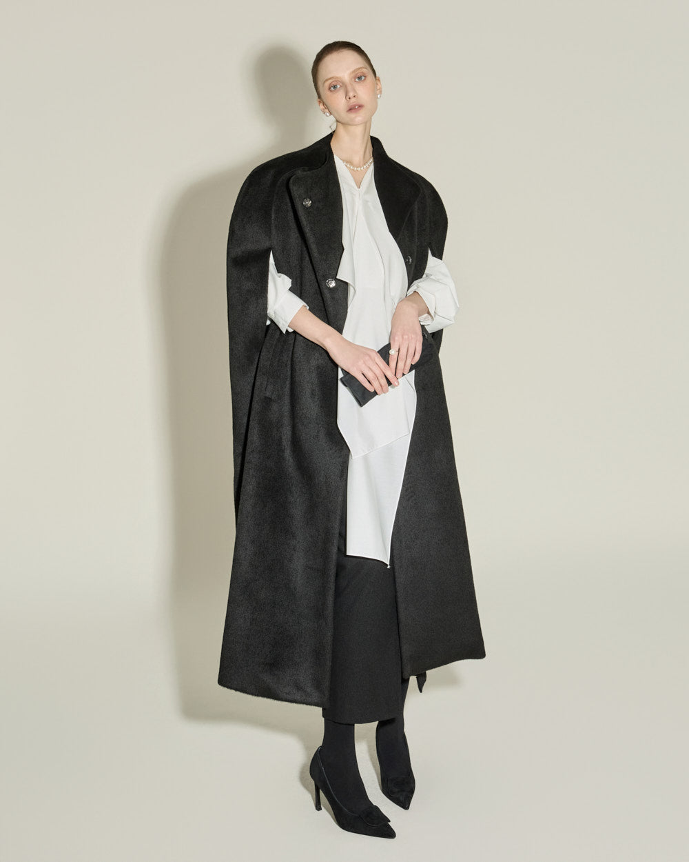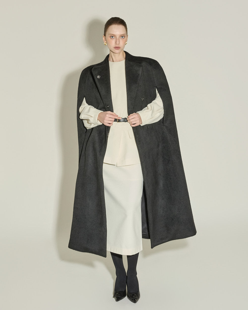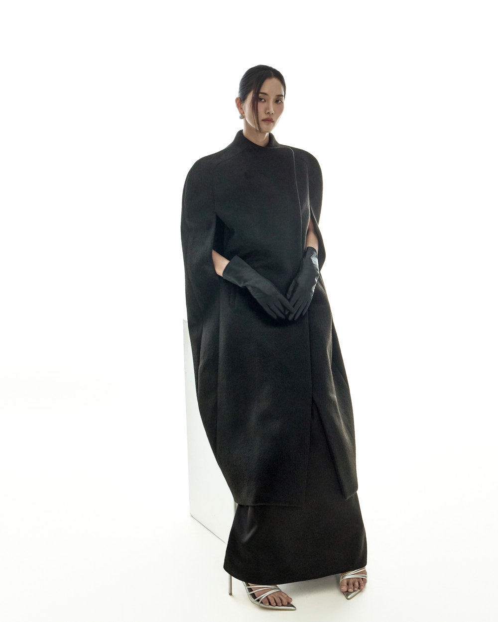 This cape coat exudes a unique and elegant vibe.