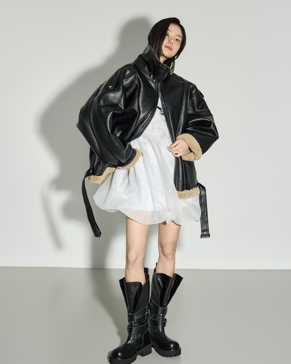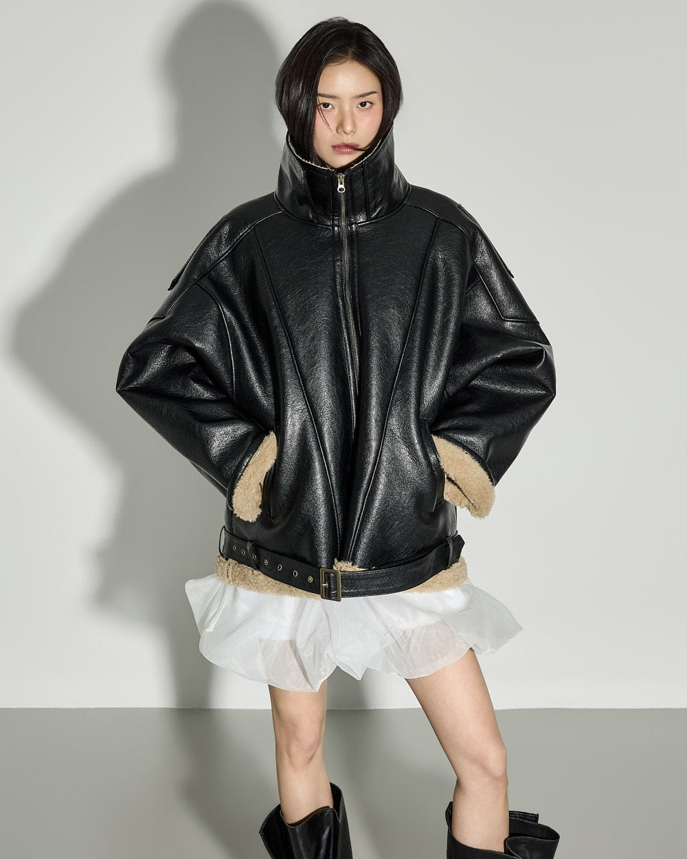 while the contrast collar can be styled as a high-neck for versatile looks.