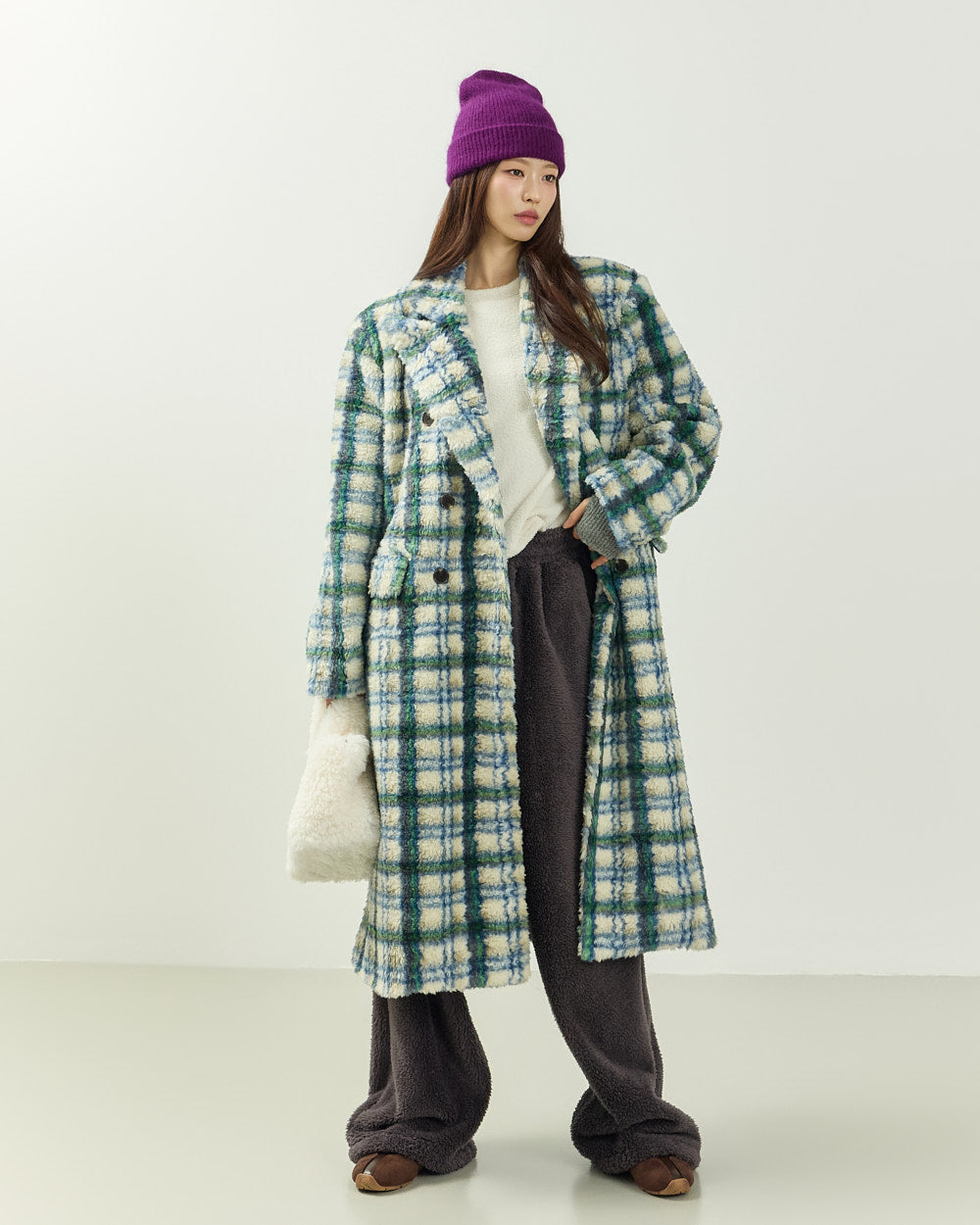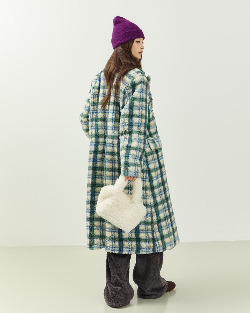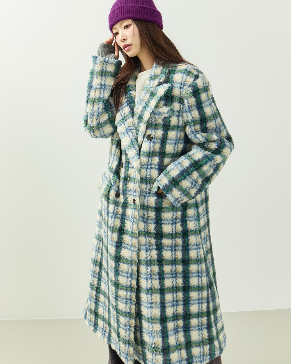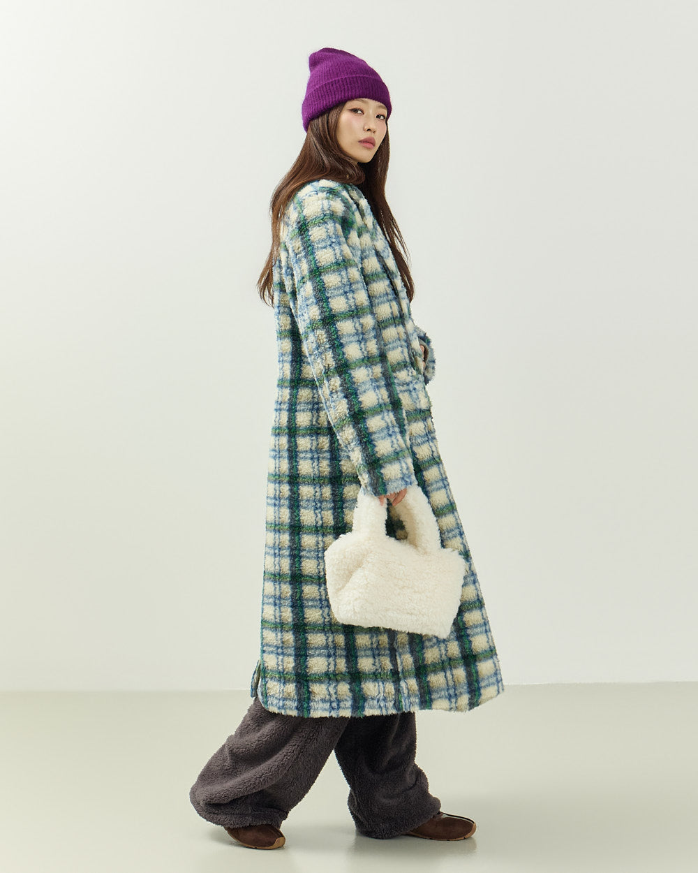 This boucle check long coat exudes a casual vibe.