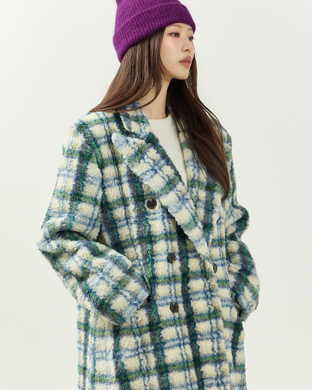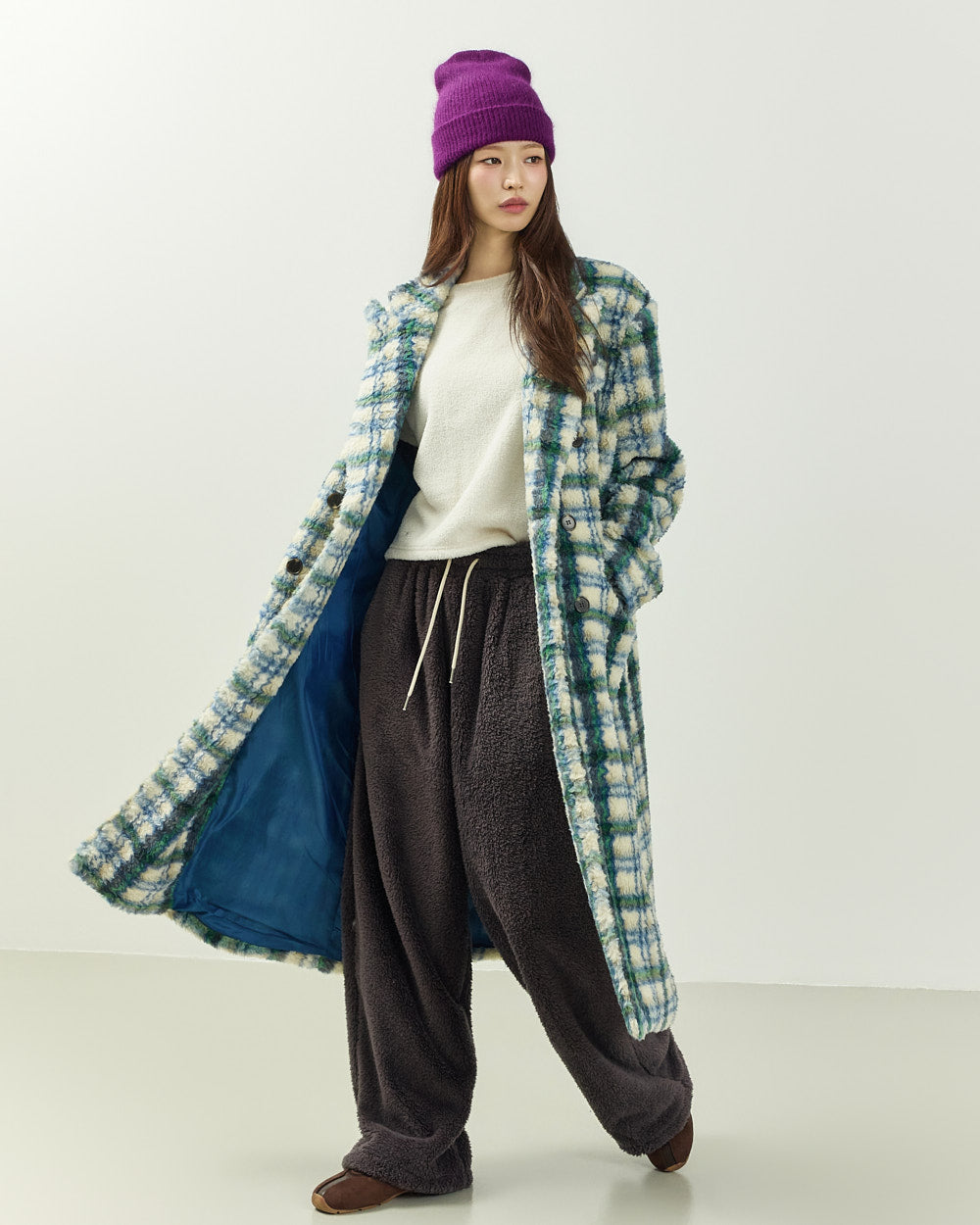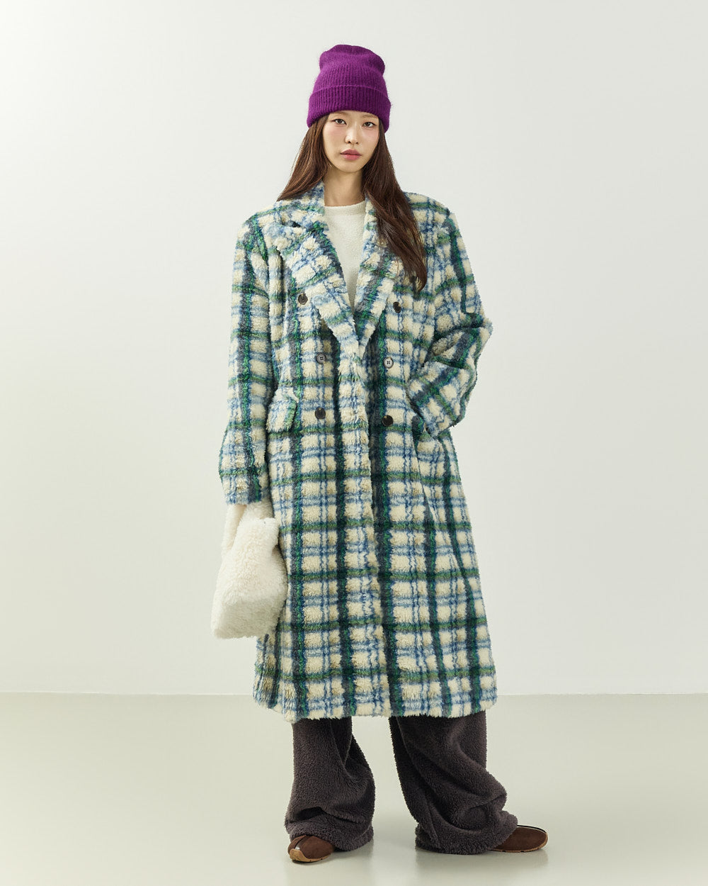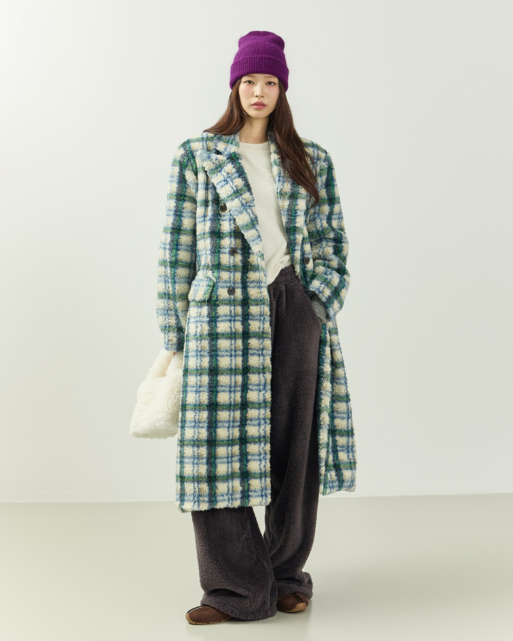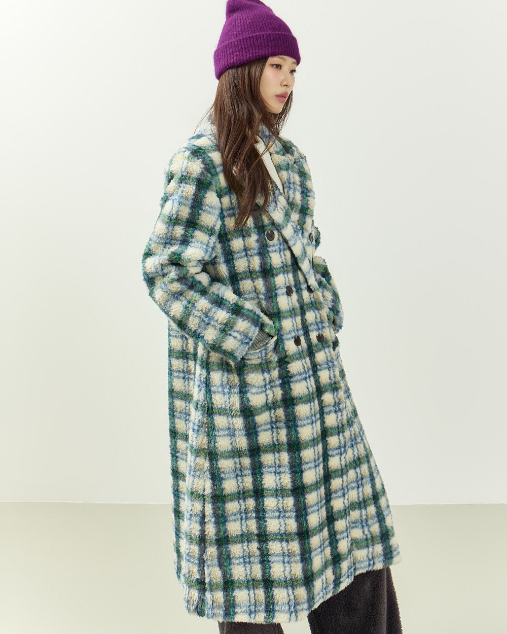 This boucle check long coat exudes a casual vibe.