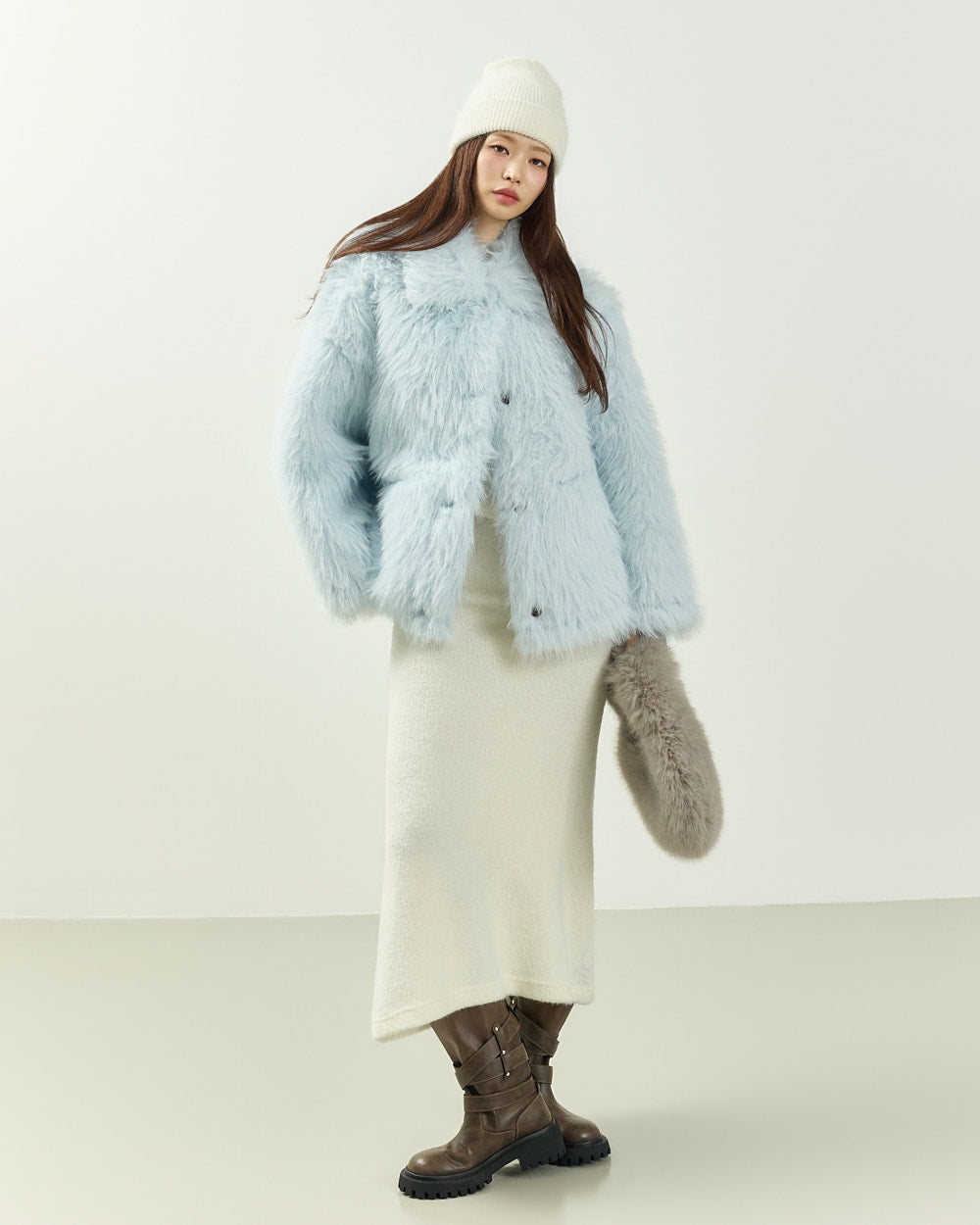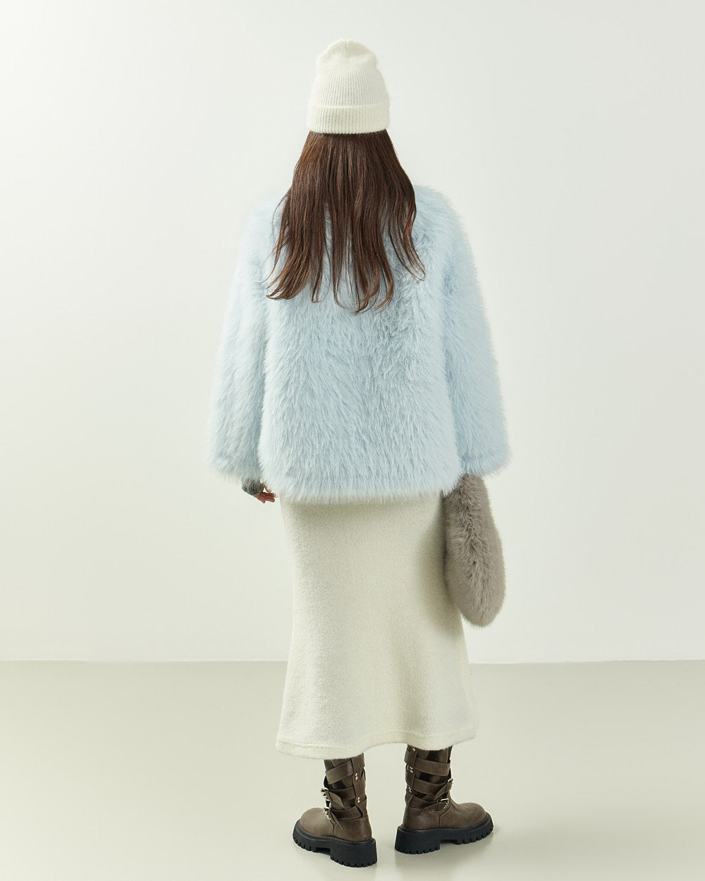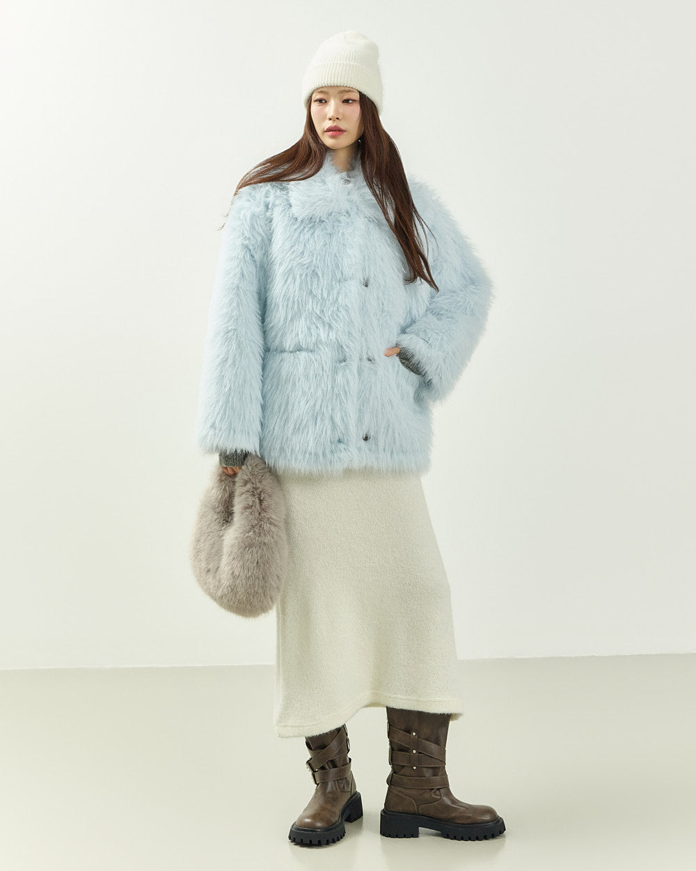 This hairy fur jacket exudes a romantic, feminine vibe.