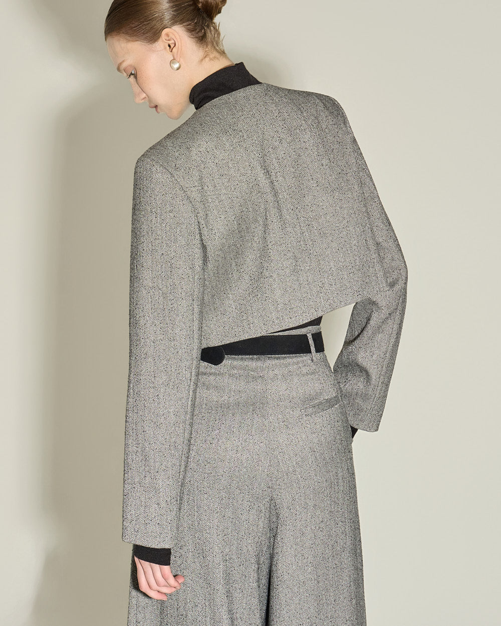 The short length of the jacket, with shoulder pads,