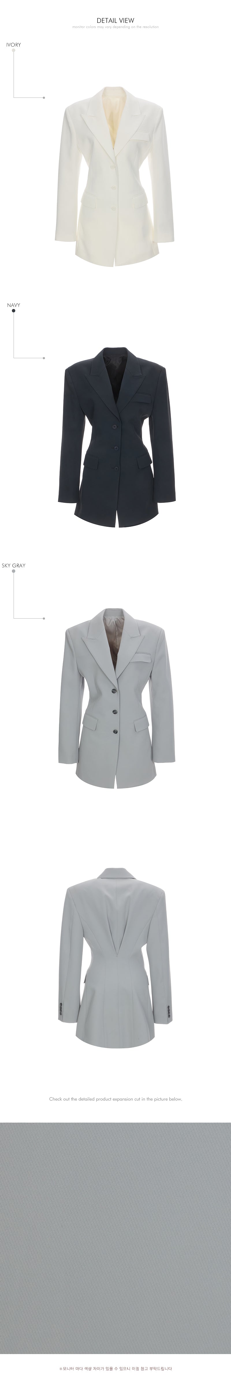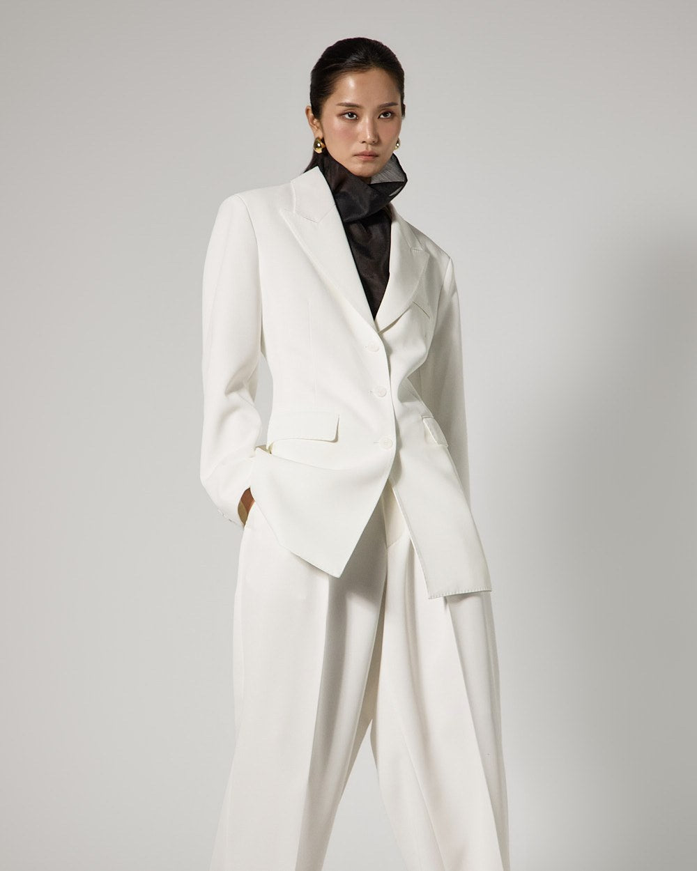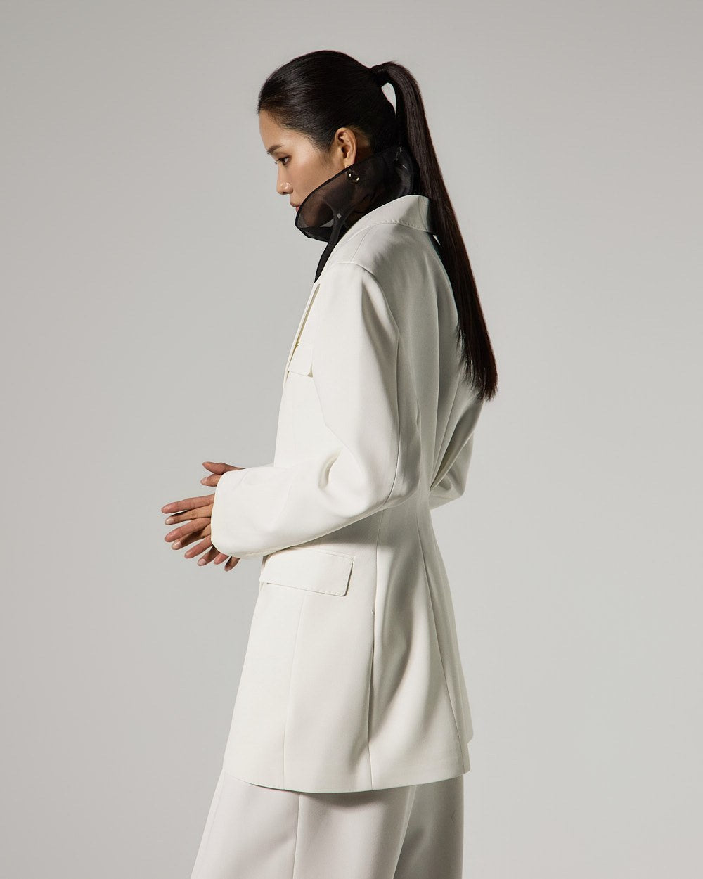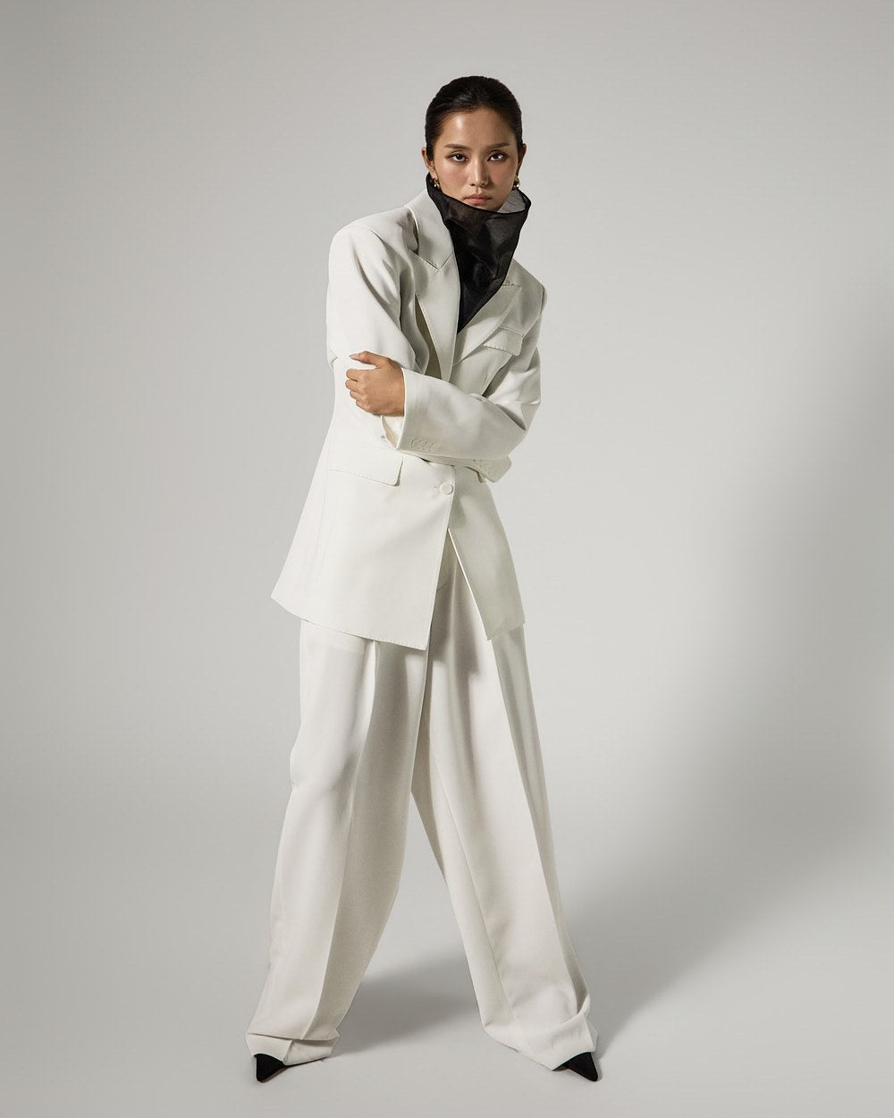 The slim-fit silhouette neatly defines the body line, while the added tailored lines create a sophisticated atmosphere.