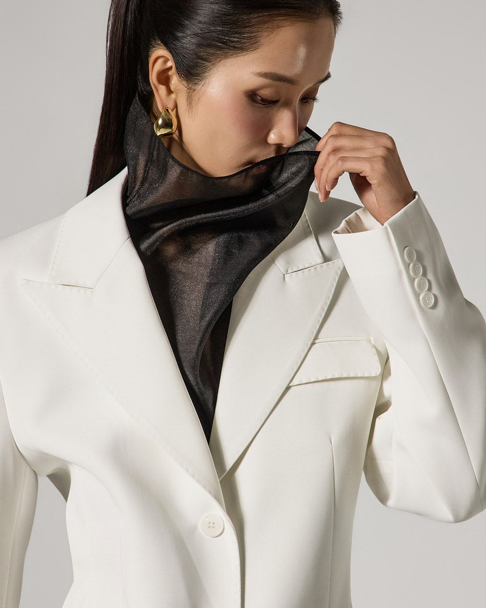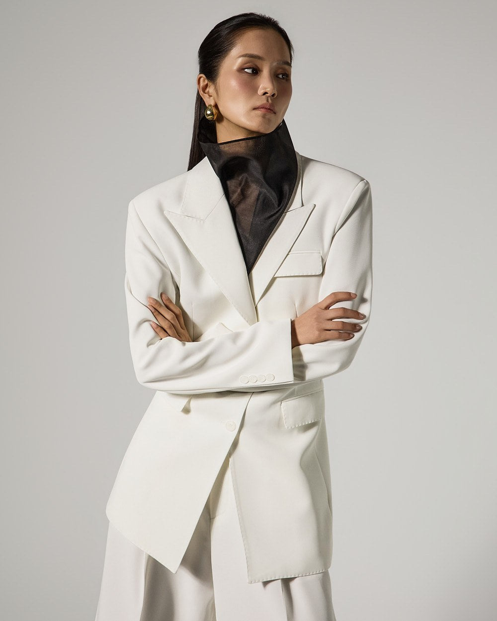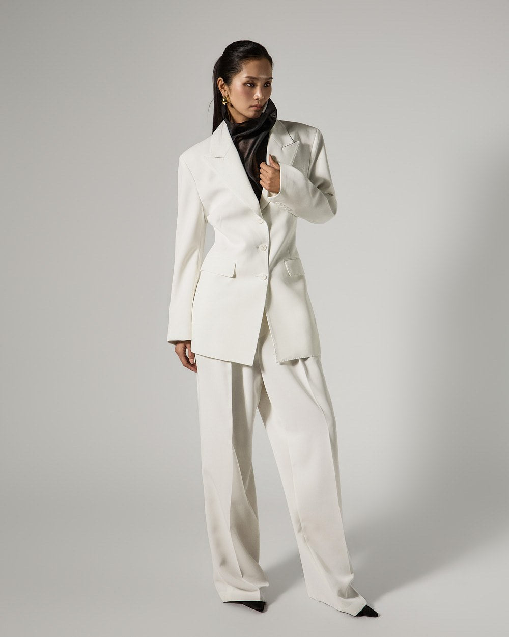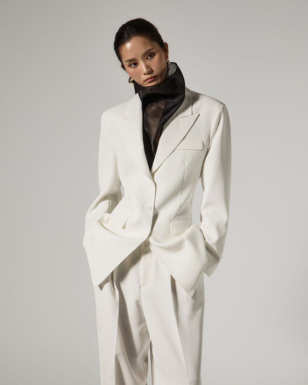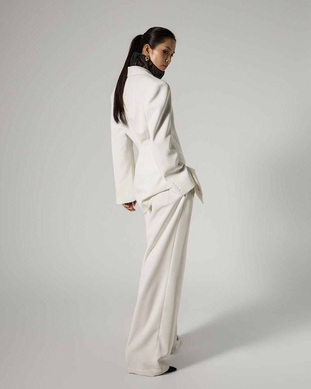 The slim-fit silhouette neatly defines the body line, while the added tailored lines create a sophisticated atmosphere.