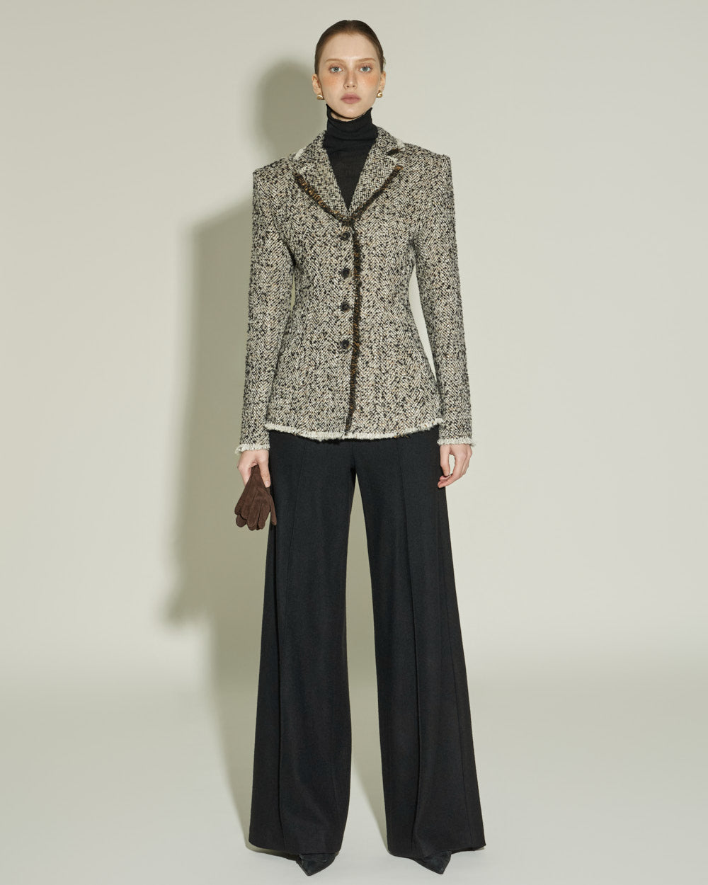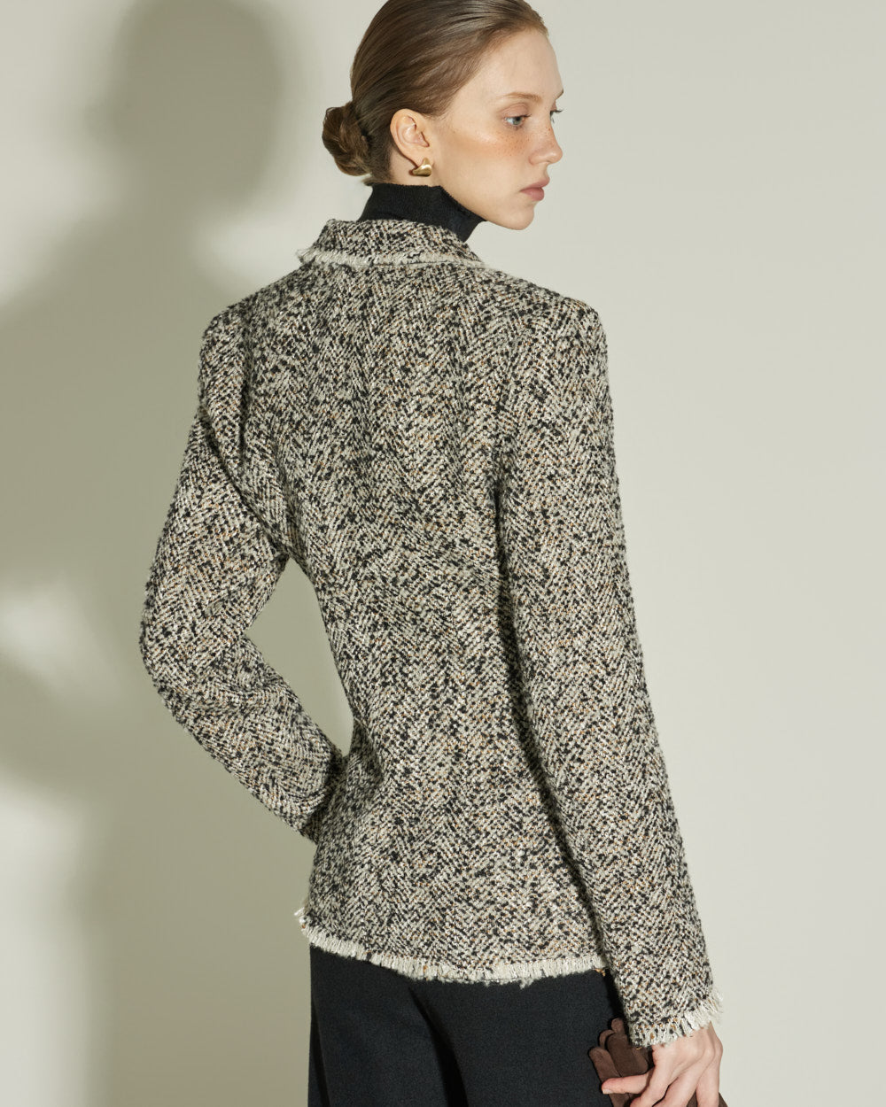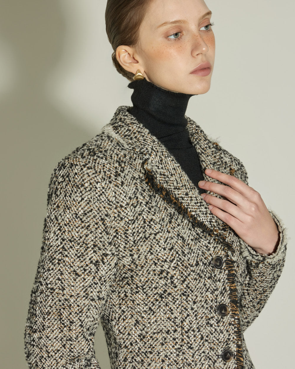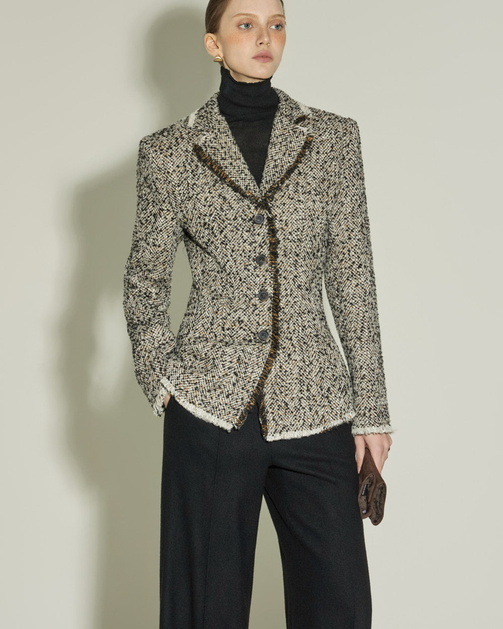 The sharply tailored collar and contrasting fabric weave