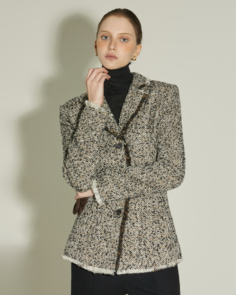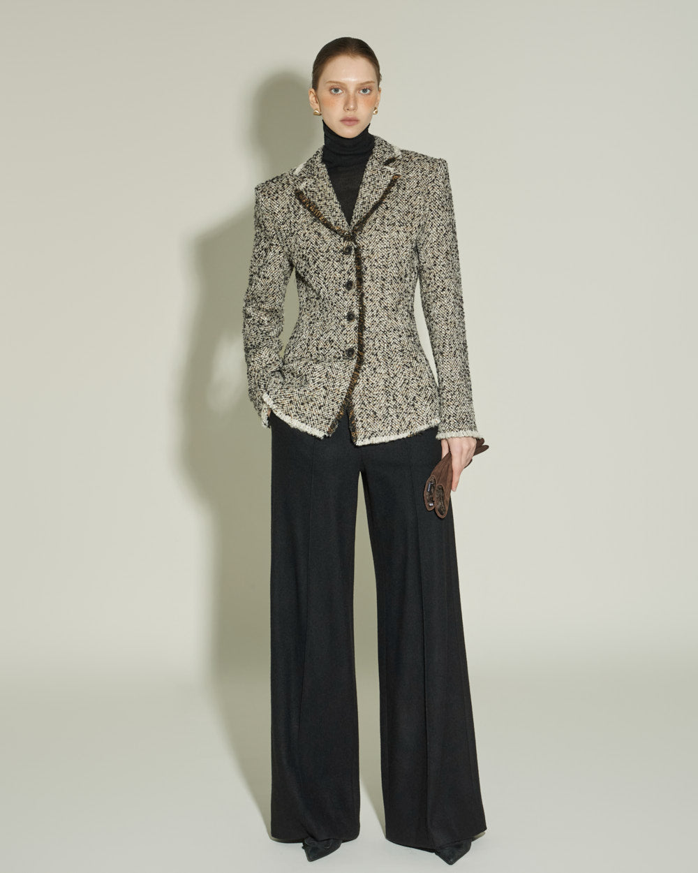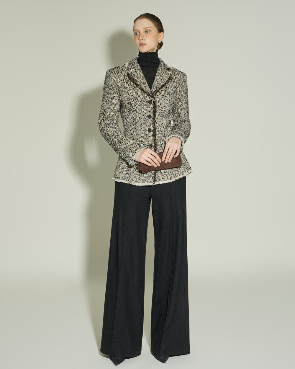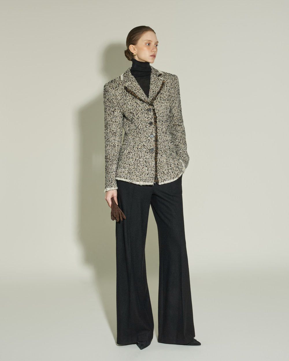 The sharply tailored collar and contrasting fabric weave