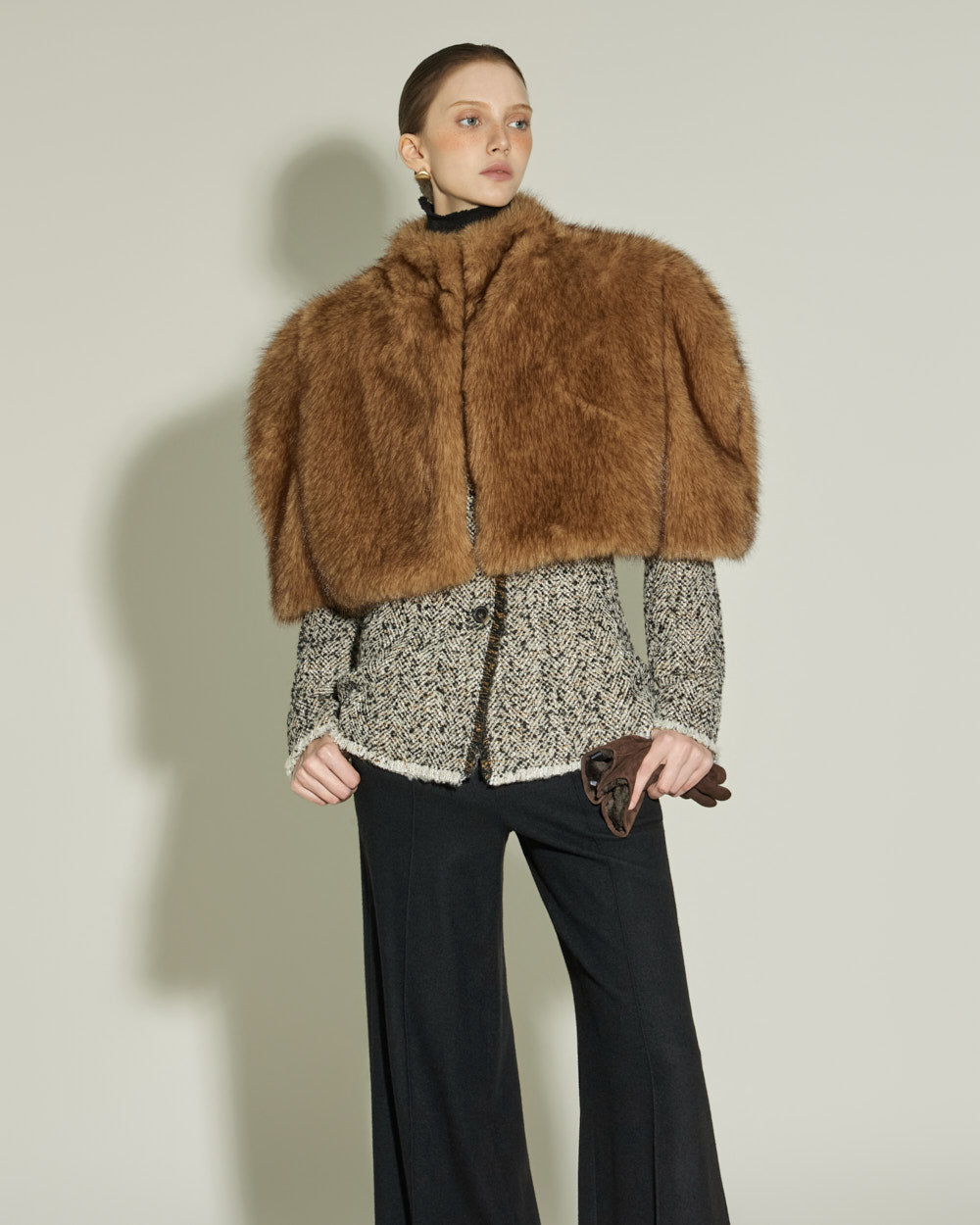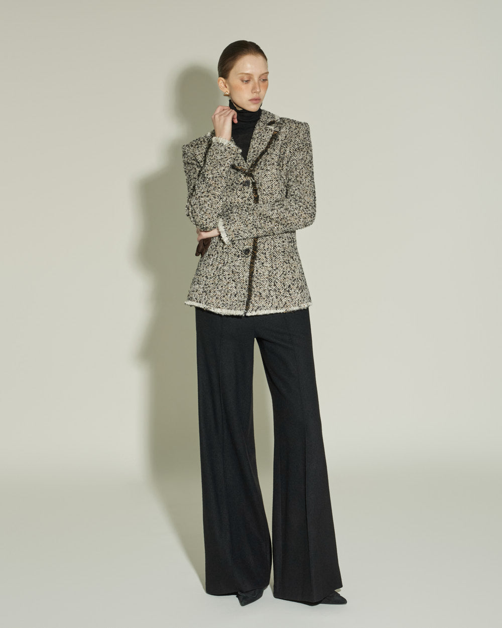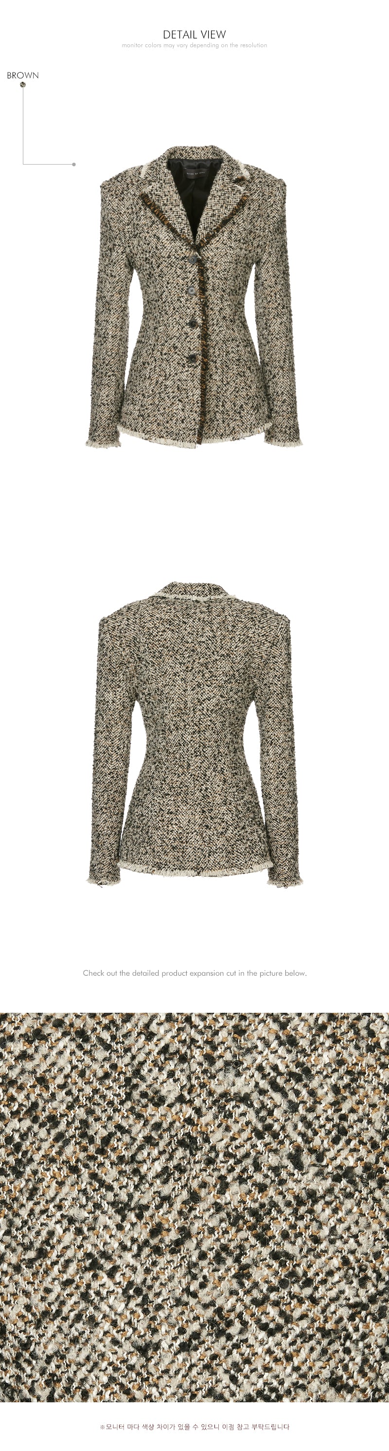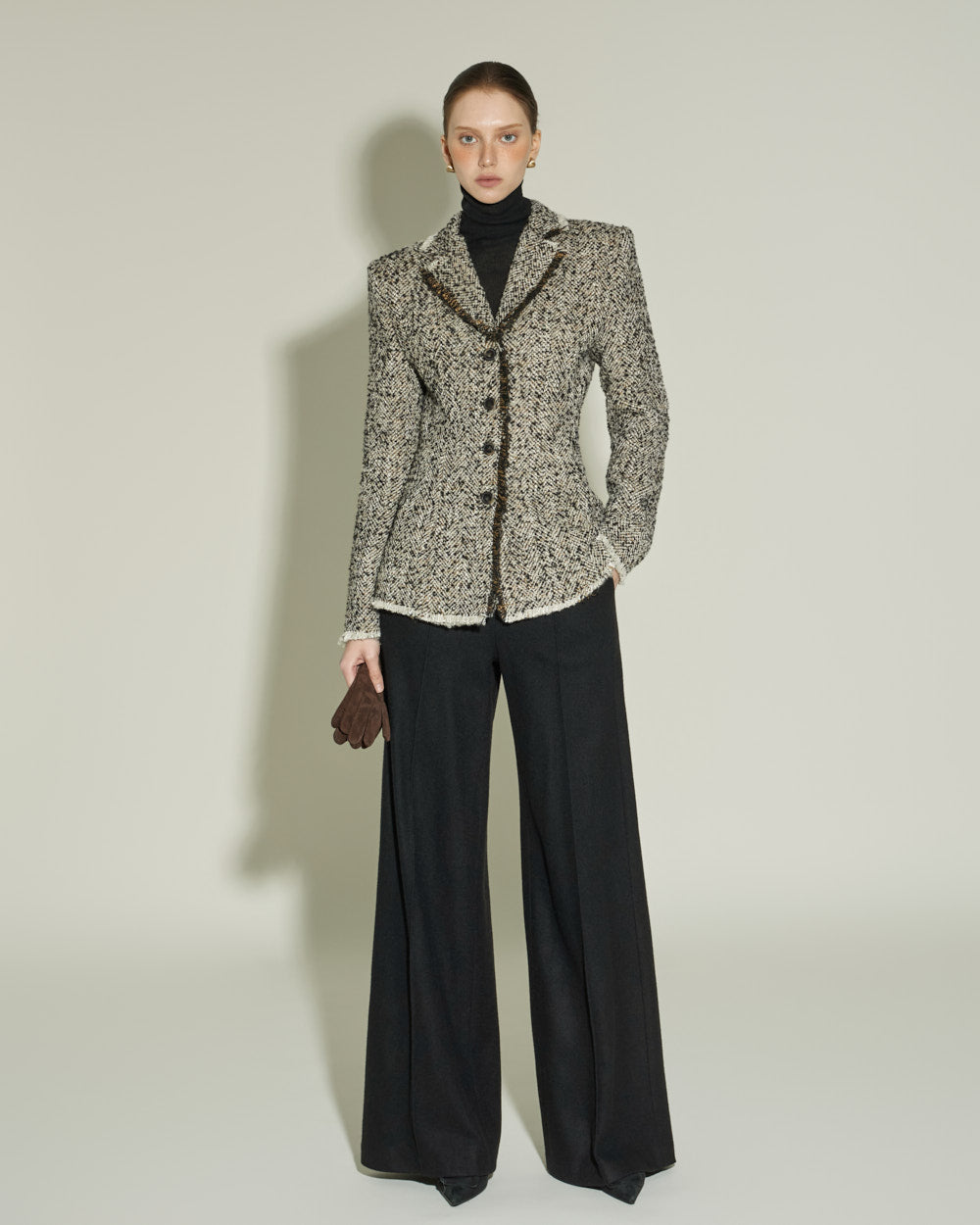 The sharply tailored collar and contrasting fabric weave