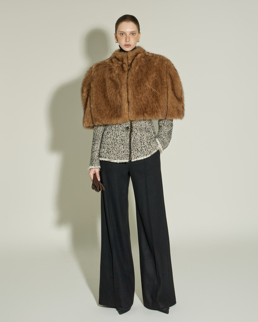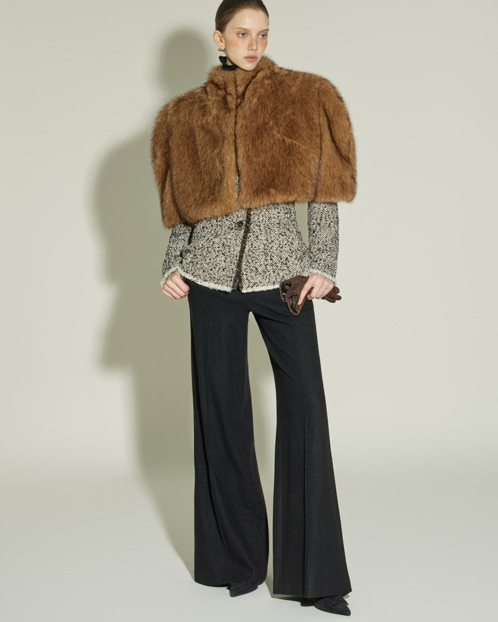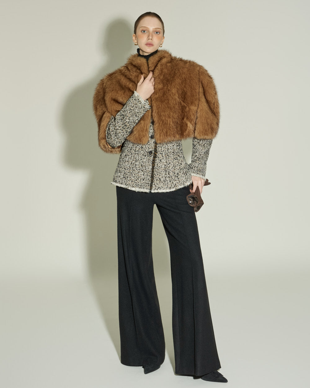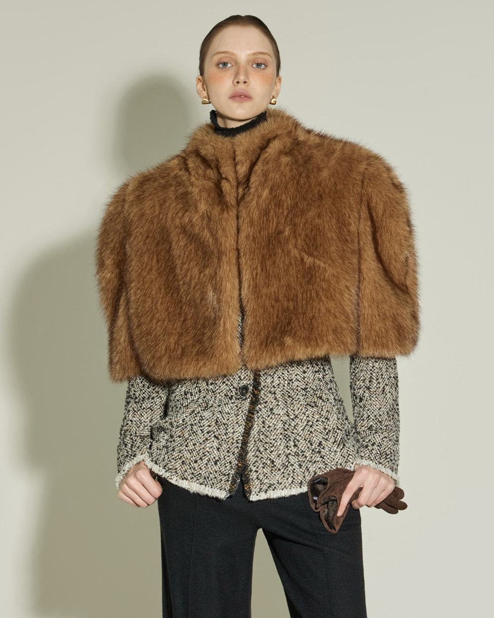 The sharply tailored collar and contrasting fabric weave