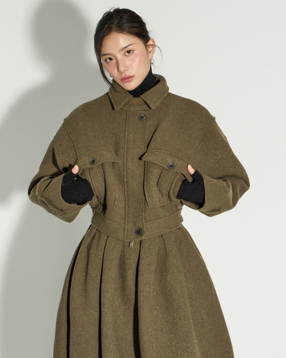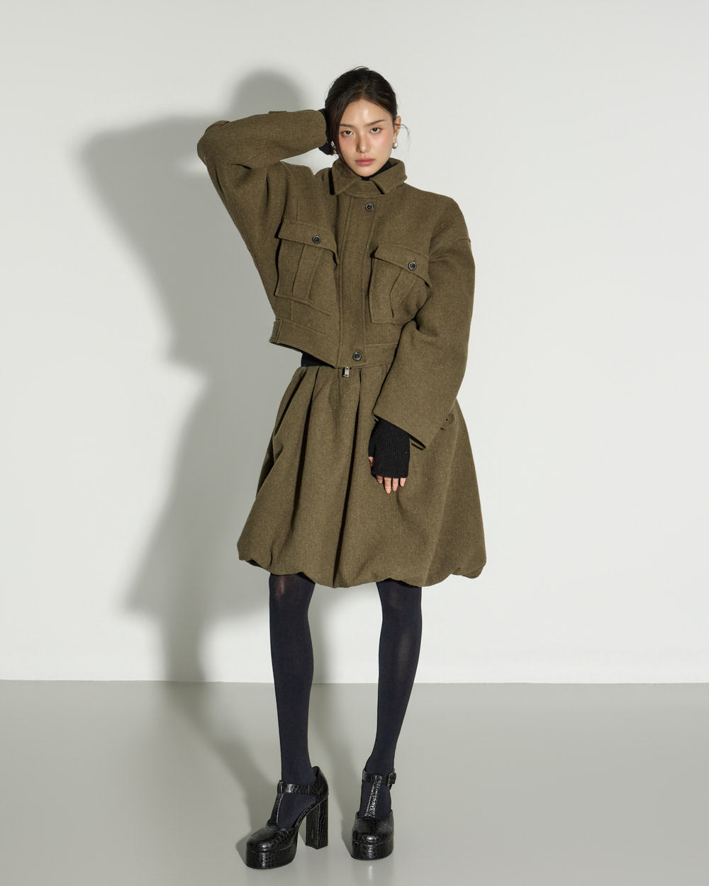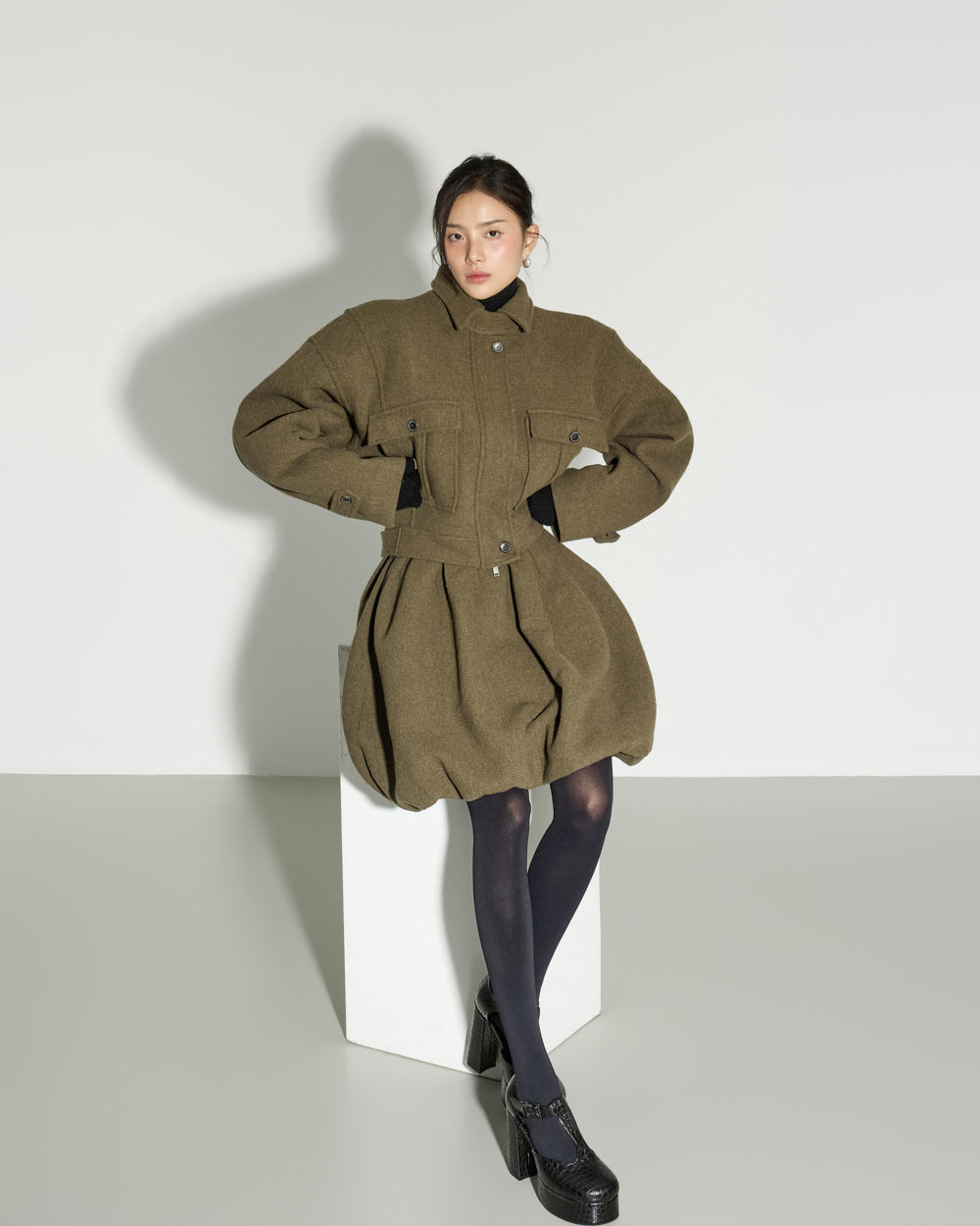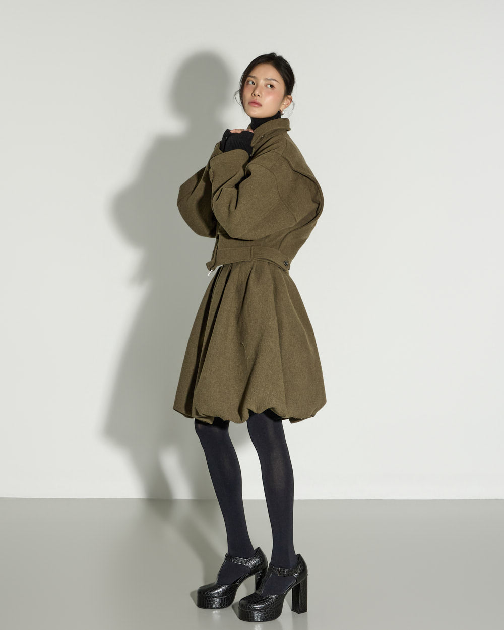 and the buttoned hem allows for a more sculptural look.