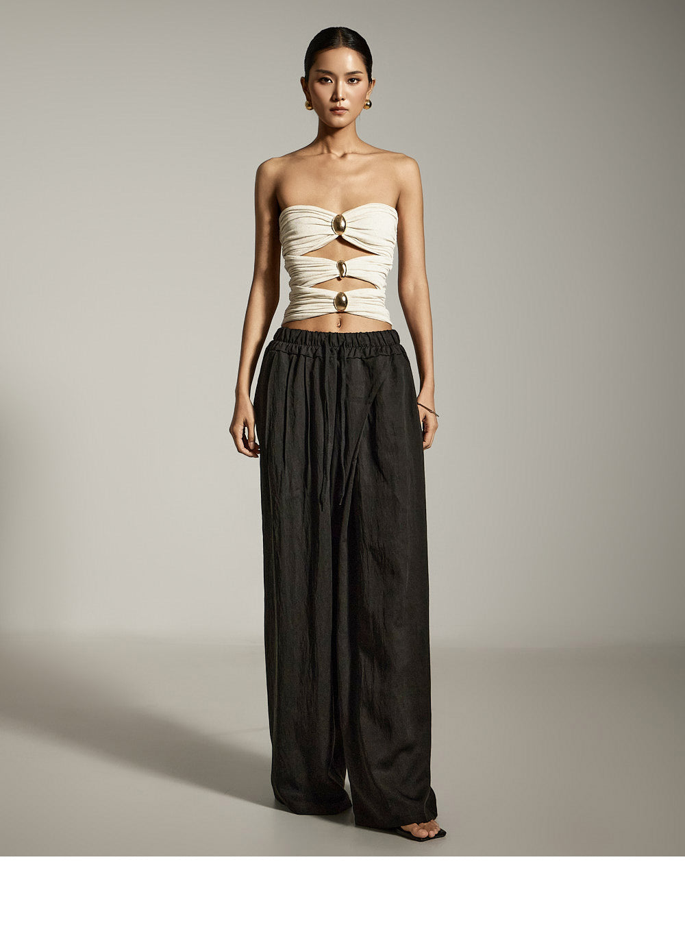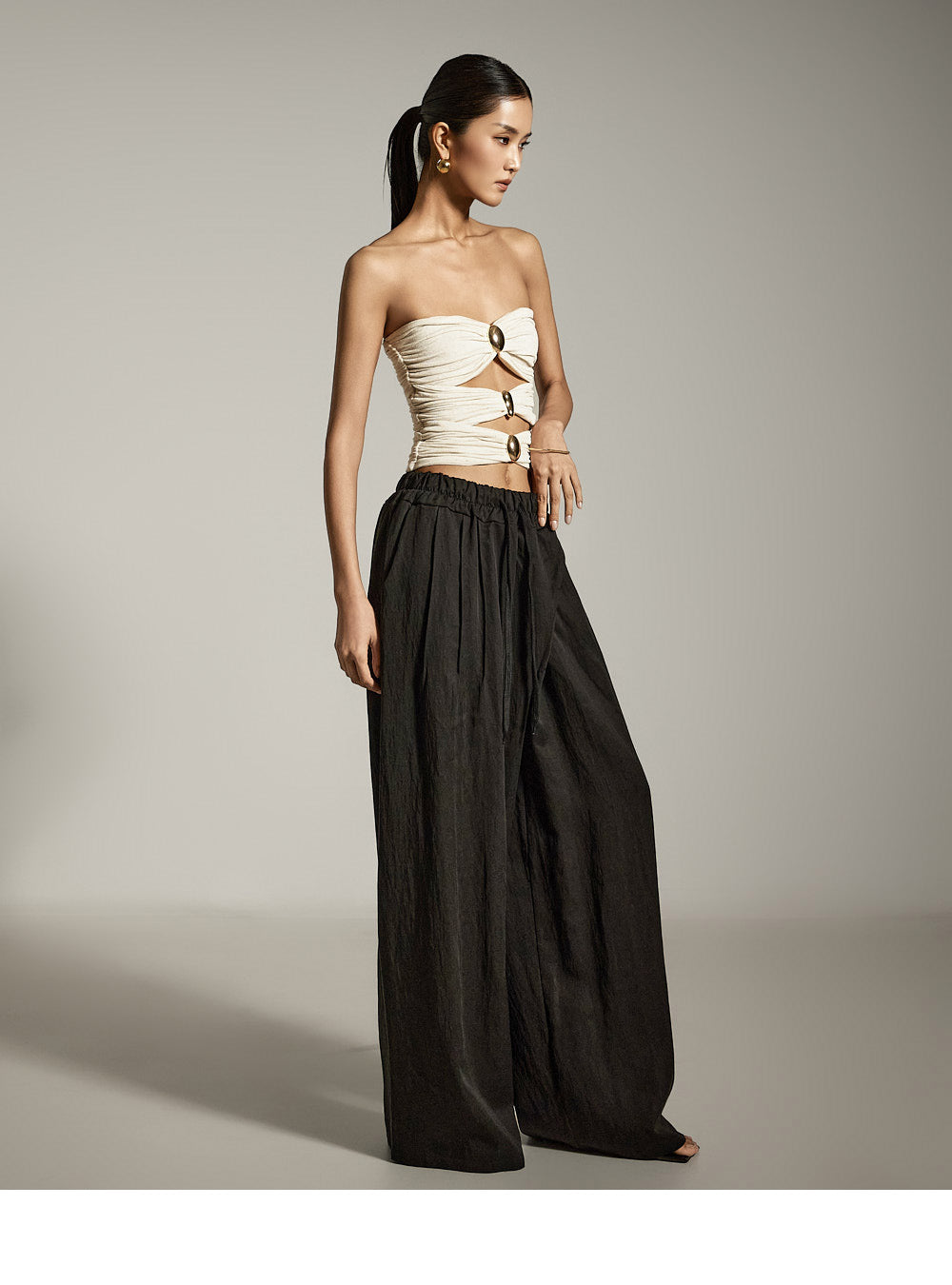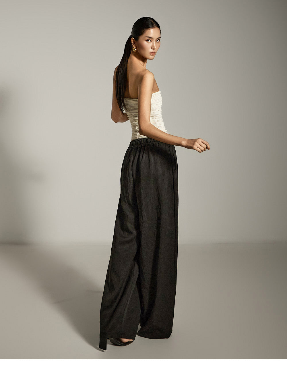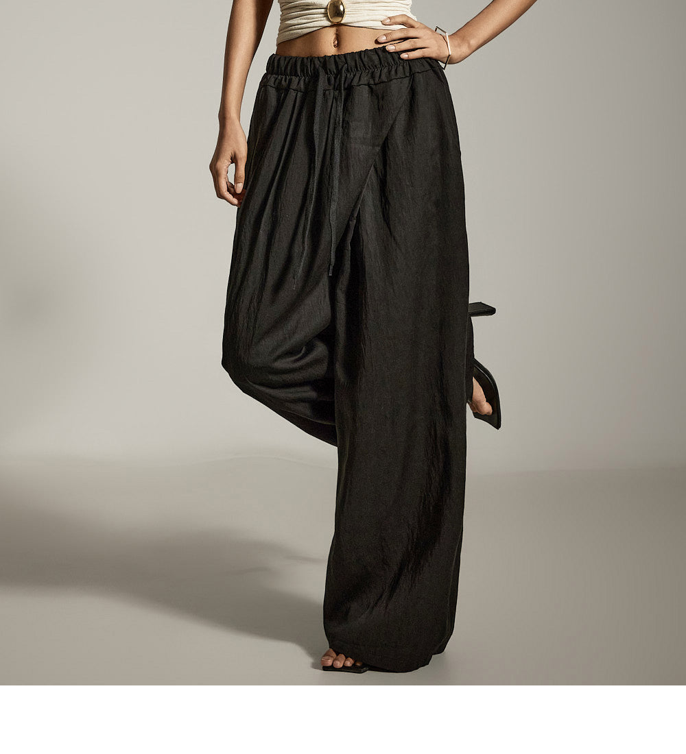 Asymmetrical front pintucks create a wide-leg silhouette