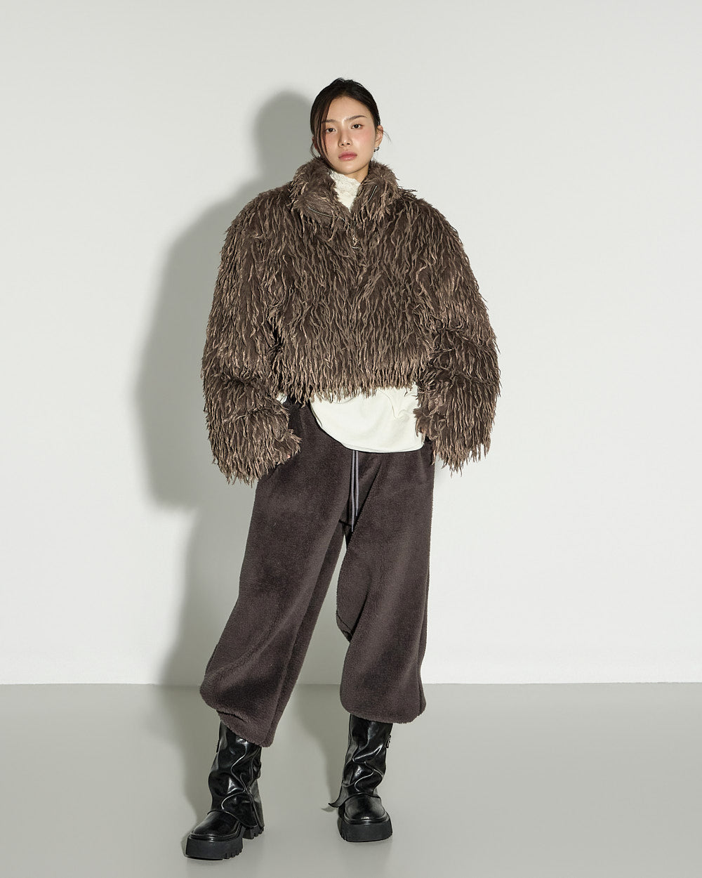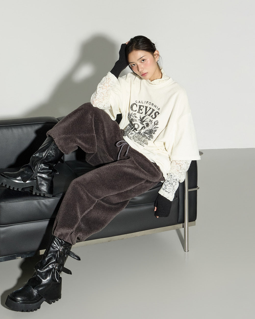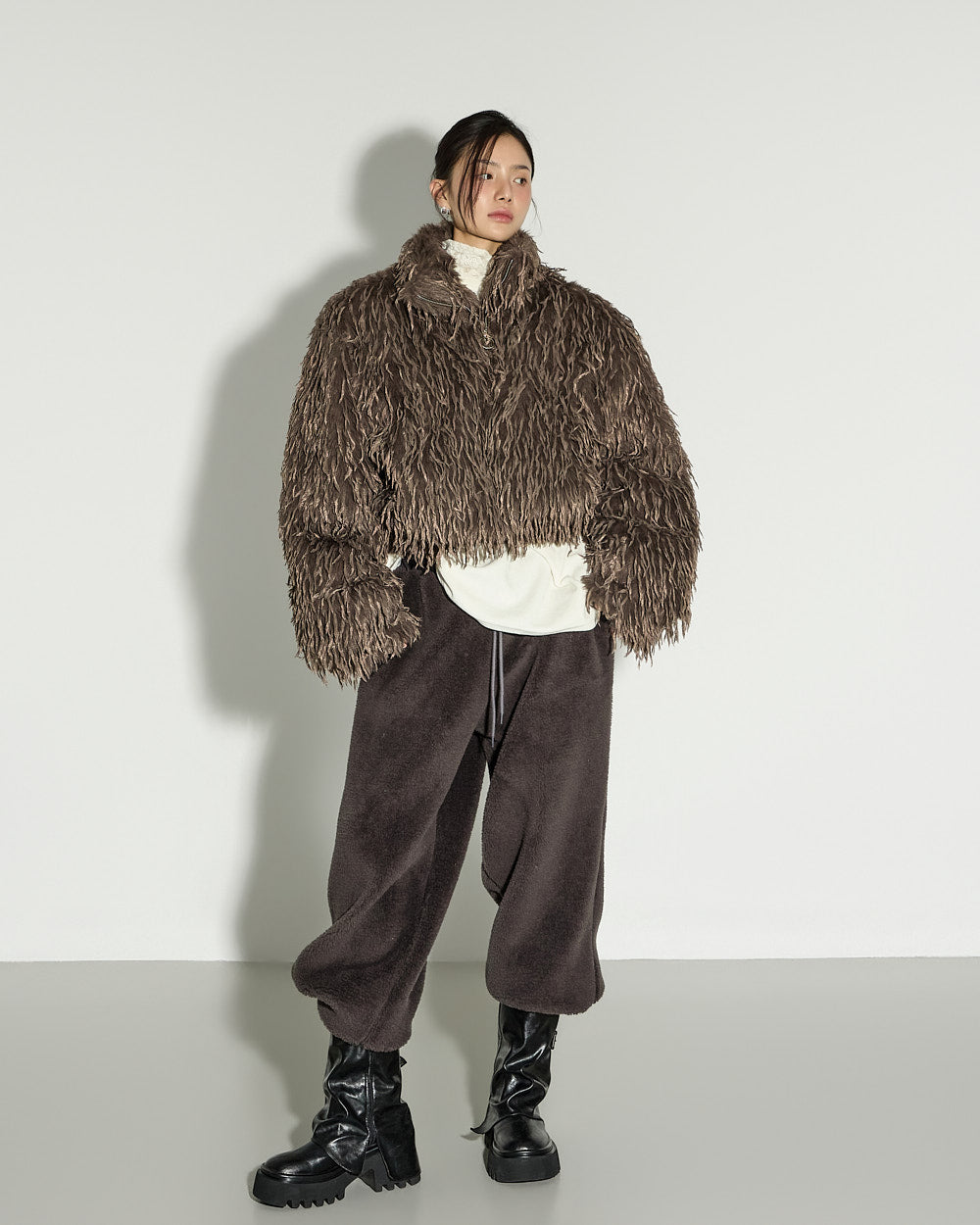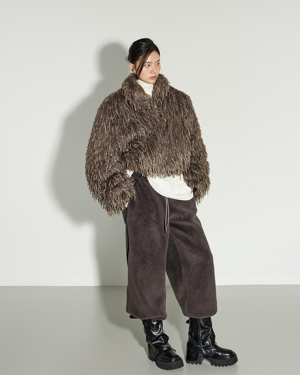 A casual boucle training pants with a relaxed mood.